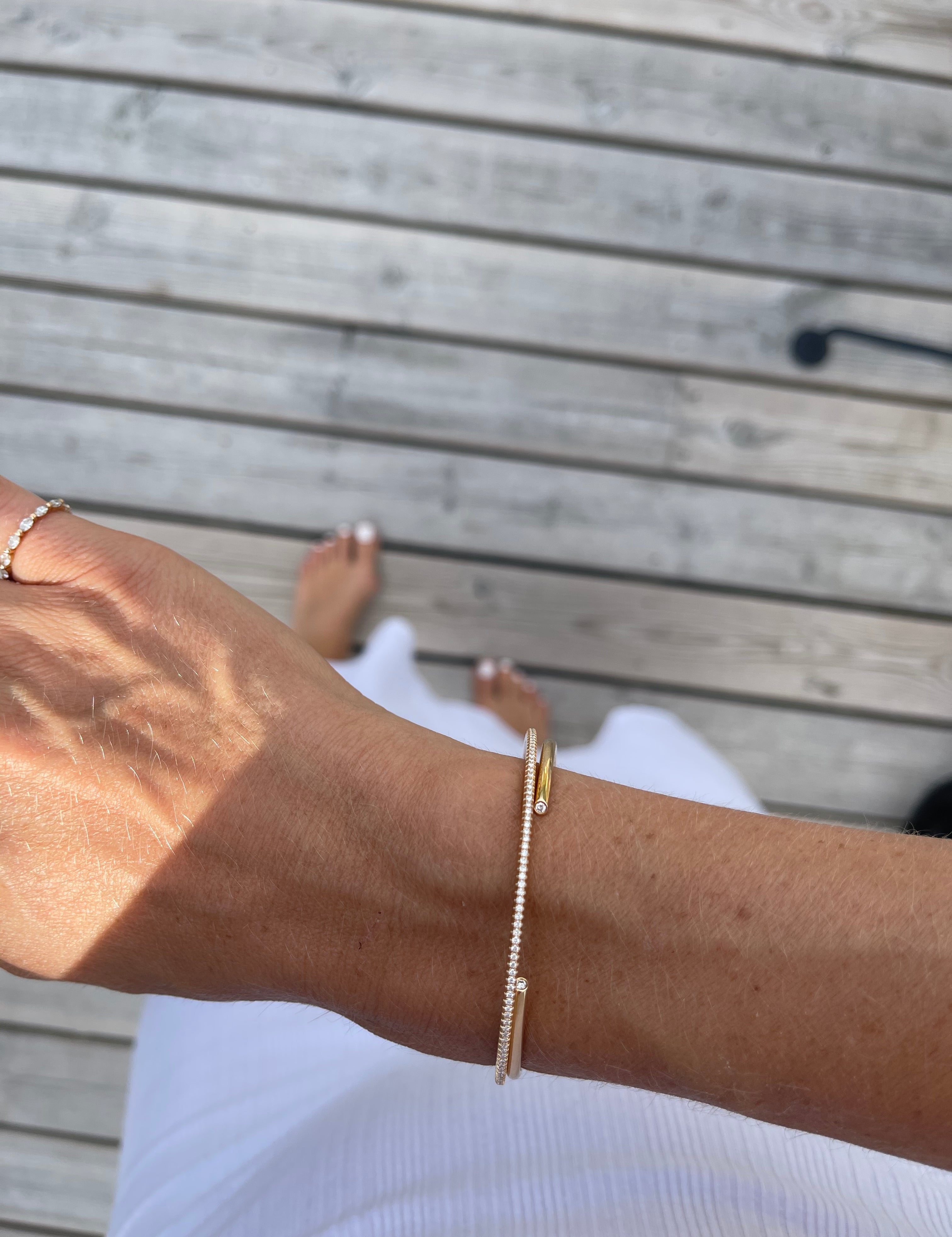 Våra öppna cuffs är handsmidda i solitt guld och helt utan mekanik, som annars är vanligt vid stela armband. Fokus för mig när jag designar är på passform och en härlig följsamhet runt handleden. Xx Cecilia