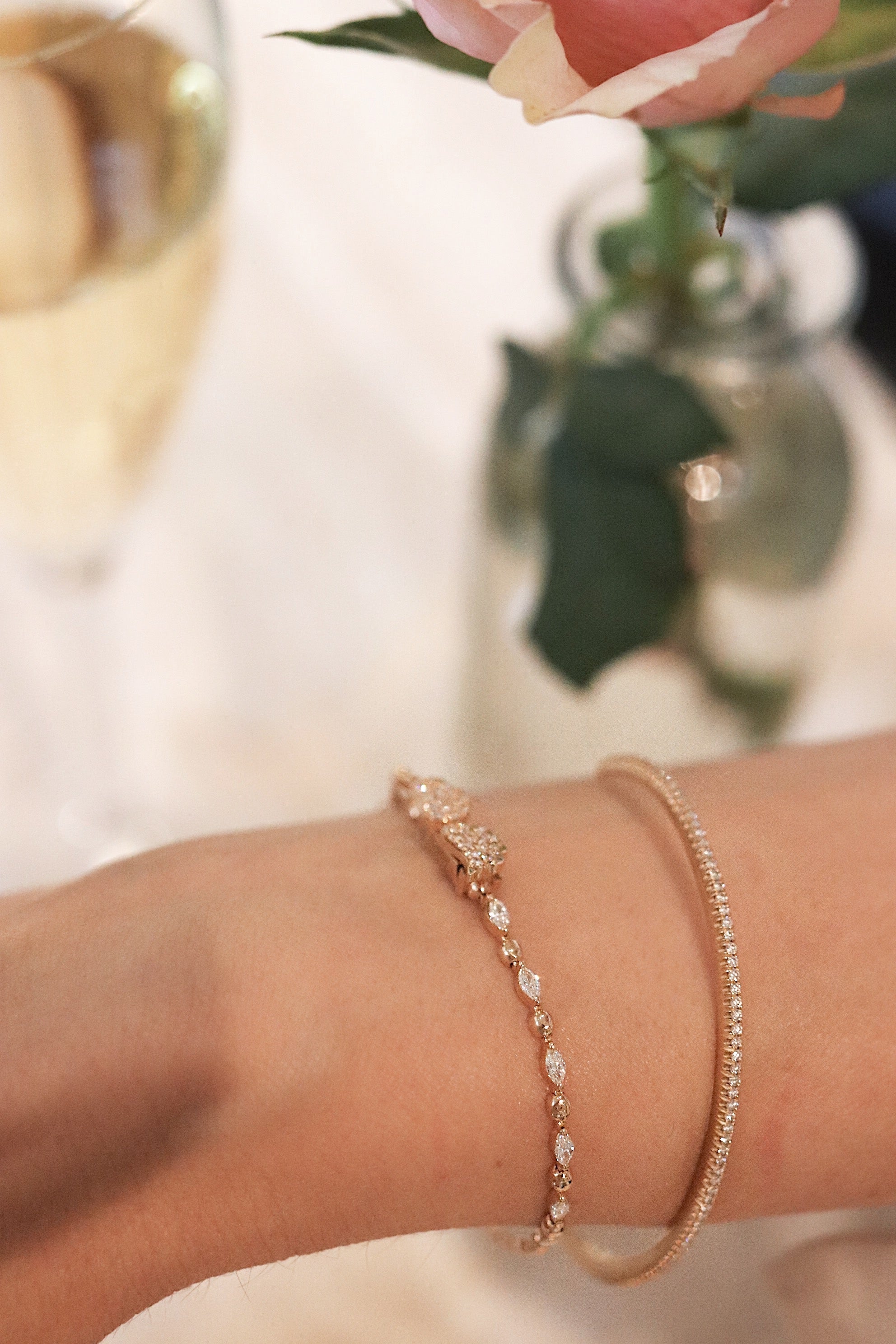 So we created this custom tennis bracelet with 22 marquise-cut diamonds and hand-drawn, diamond-studded angel wings as a lock. The marquise diamonds not only symbolize a strong, beautiful woman - but they also include the 20 diamonds for Estrid, and 1 diamond each for the mother and the grandmother.