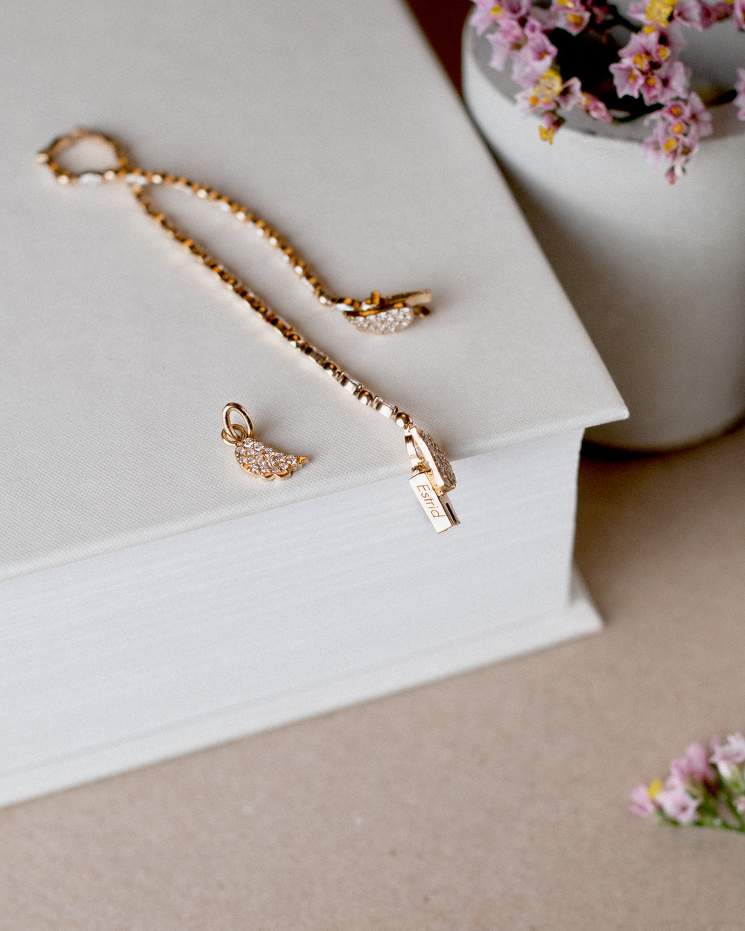 Using the hand-drawn angel wing, we also created a little angel pendant that is now hanging around the neck of Estrid's grandmother ❤️, the woman requesting this custom order. Both the bracelet and the pendant is engraved with the name Estrid. ❥