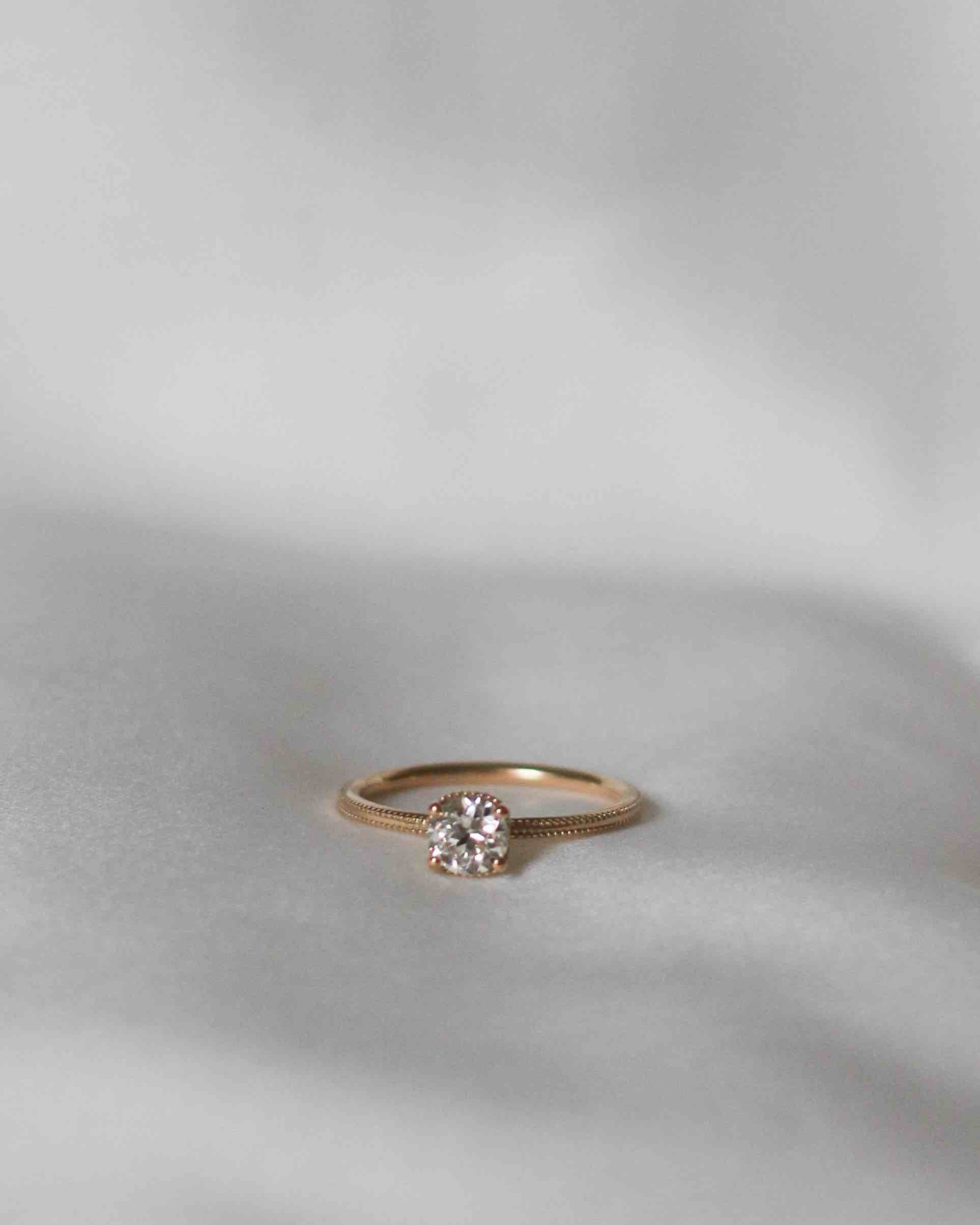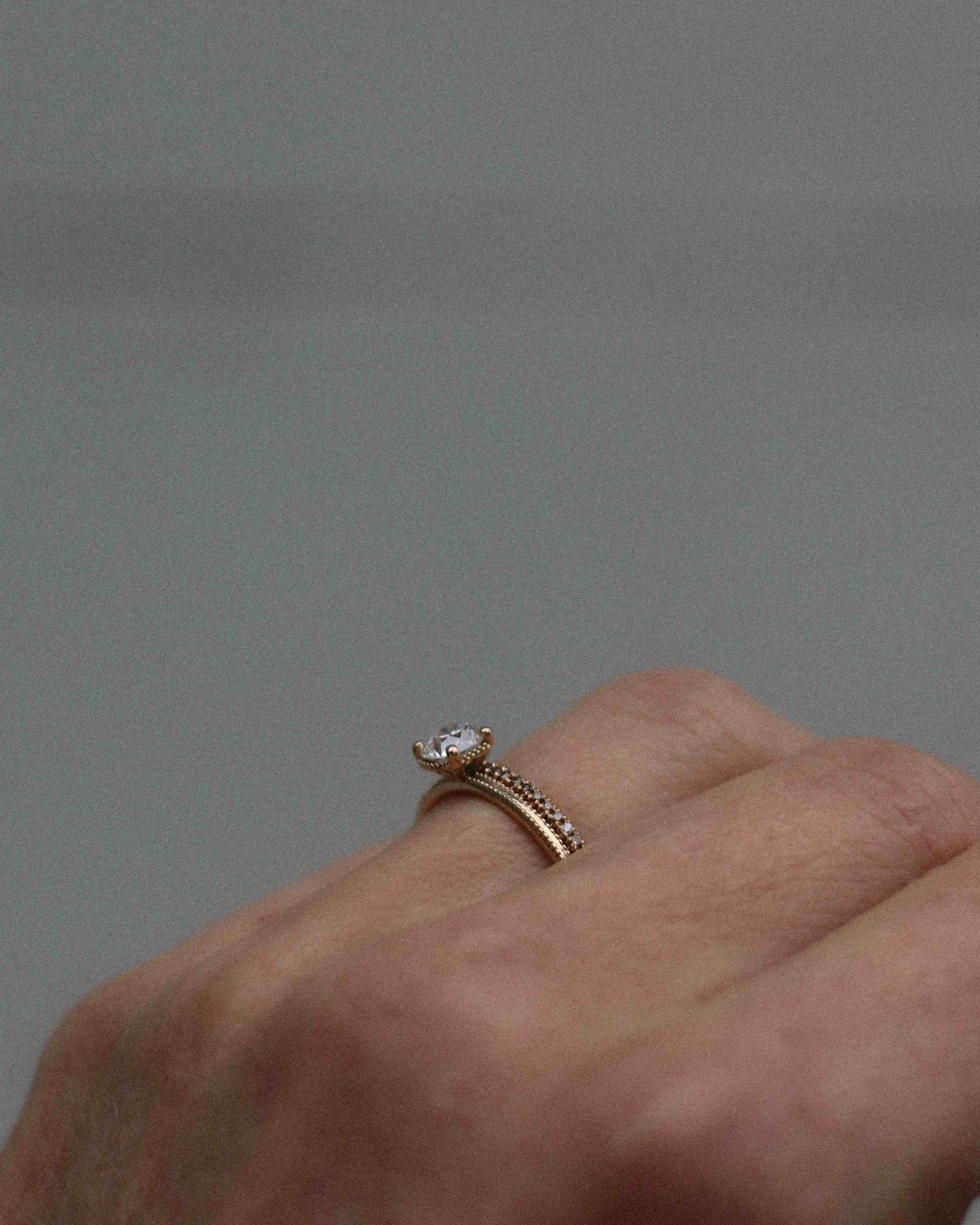 Den vackra milligriffdekoren på ringbandet och längs fattningen var vanlig i smycken kring förra sekelskiftet (1800-1900). Det är en teknik där man med små små guldprickar skapar en romantisk, nästan räfflad känsla i ringband och runt stenarna, som får smycket att glittra och ger det en underbart välarbetad karaktär.