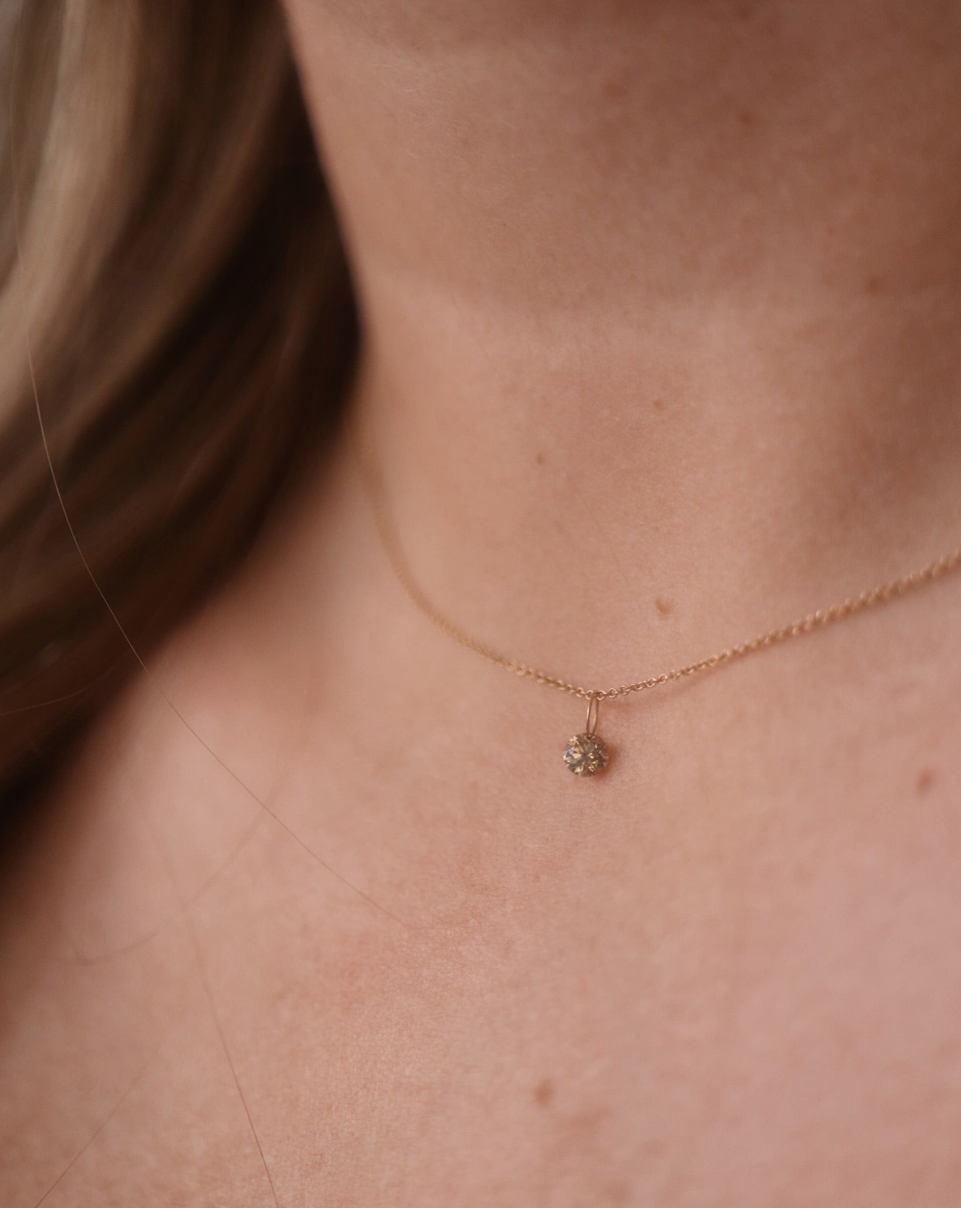 If wearing on a chain you already have: the loop of the pendant is 4 mm, so it should be able to be worn on any necklace chain you have at home. We recommend wearing the pendant on a very thin chain like this one, so it appears as if the diamond is floating on your bare skin.
