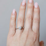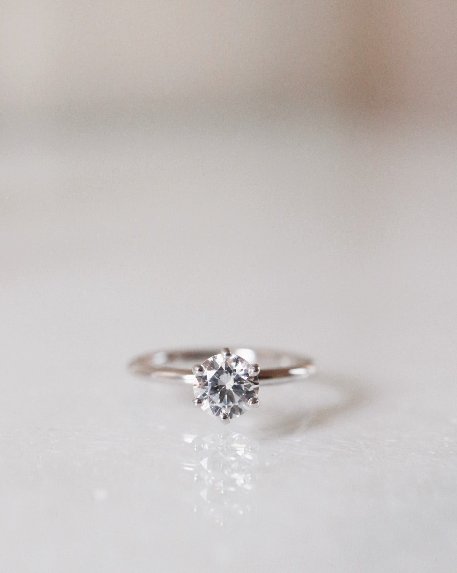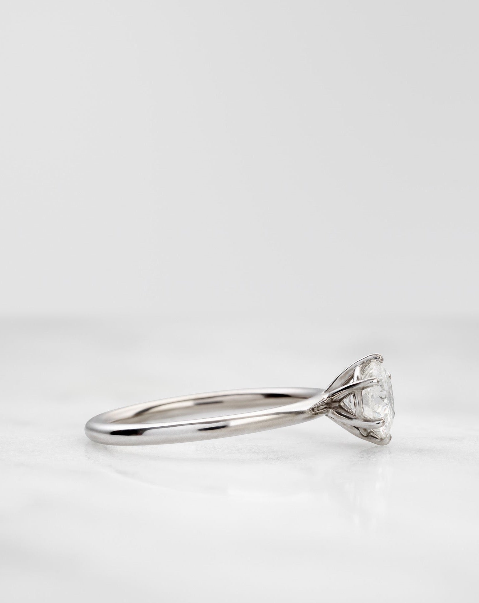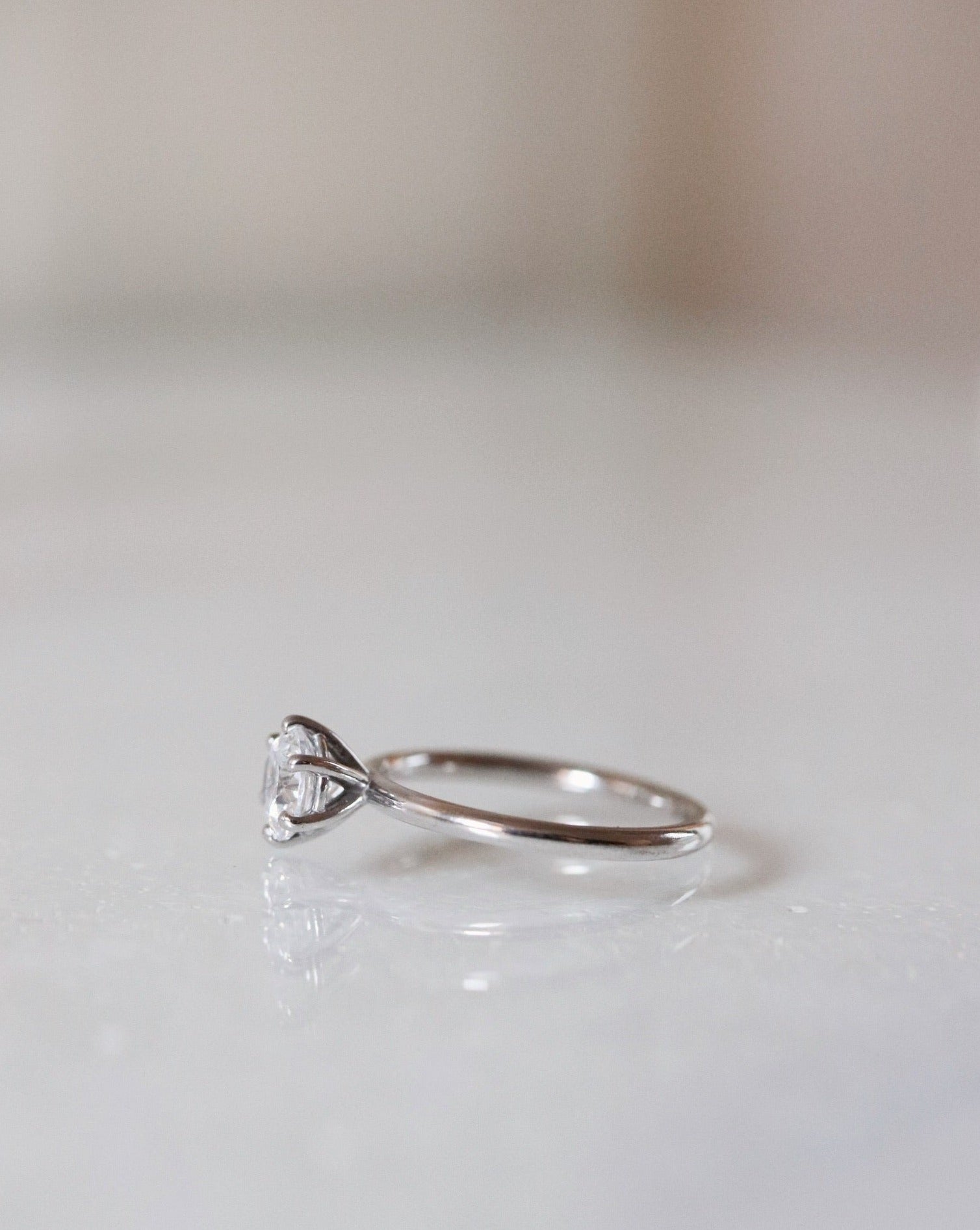 Ringen har en vacker fattning med sex klor fördelade symmetriskt runtom diamanten, och förstärker dess runda briljantslipning.