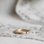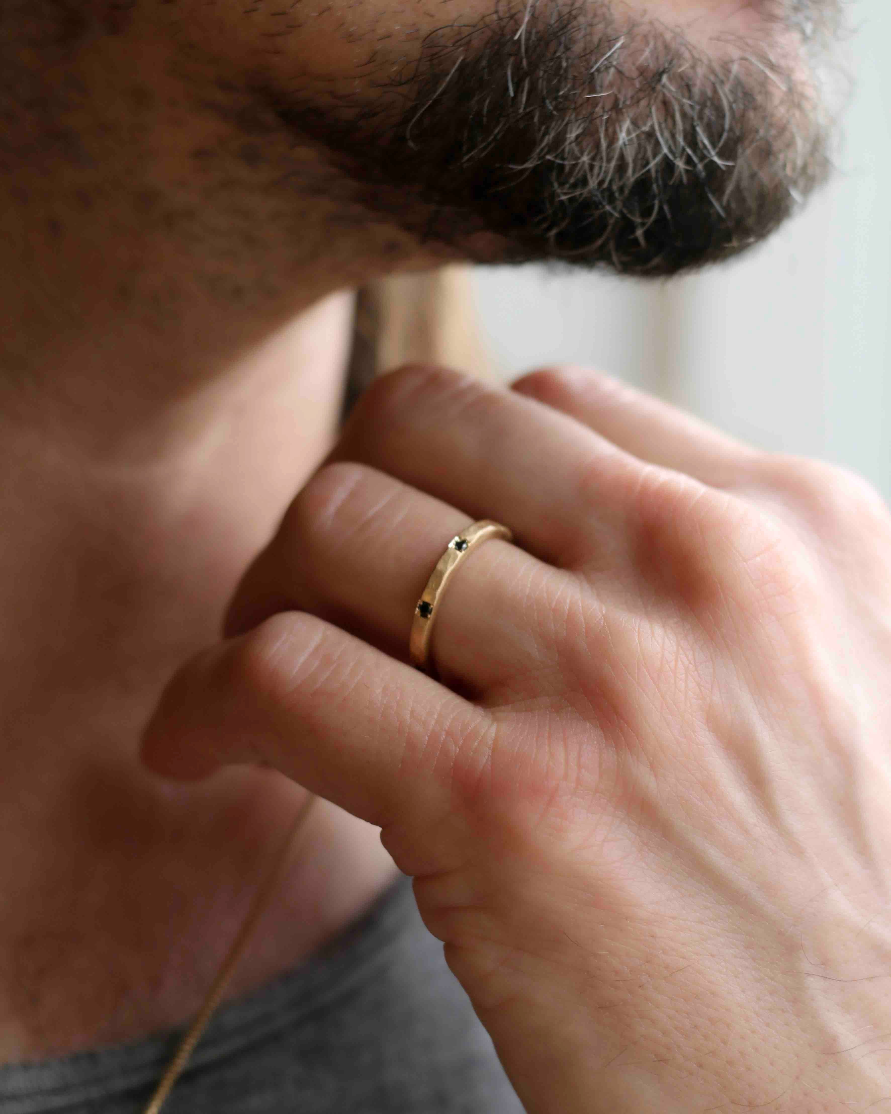 Logan Eternity Band är en relativt smal ring, endast 2,5 mm bred, men tack vare dess rustika yta och tilltagna höjd så känns den rejäl och är mycket bekväm.