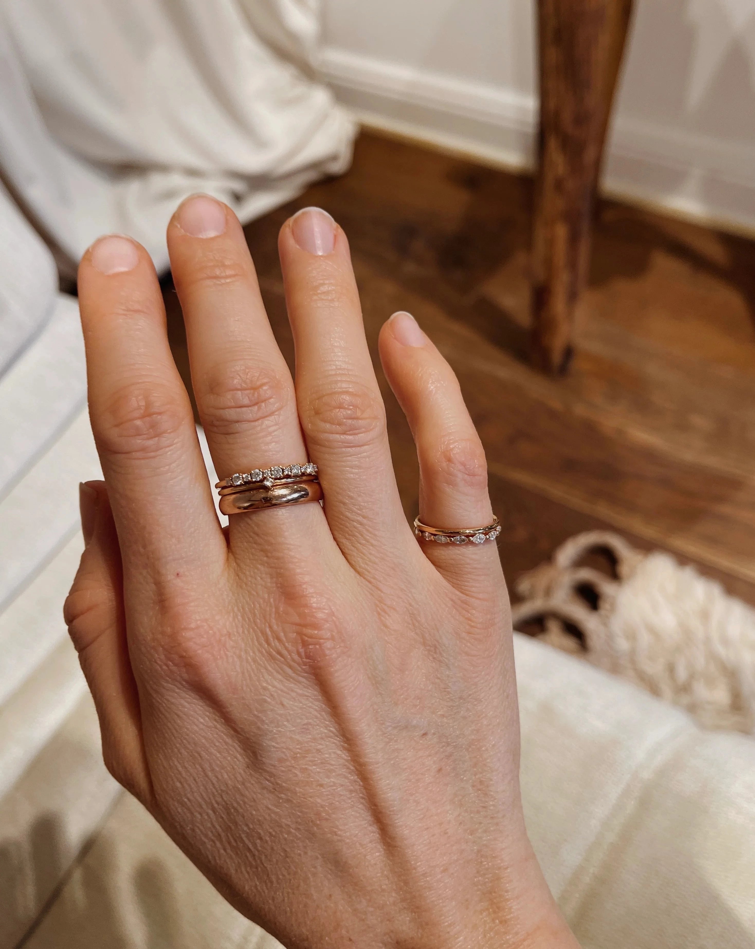 In the last picture, Cecilia is wearing Casper Clean Ring 4 mm with Tiny Diamond Ring and Mini Brigitte Ring 0.26 CT, as well as Marquise Ring and Round Goldie on the pinky.