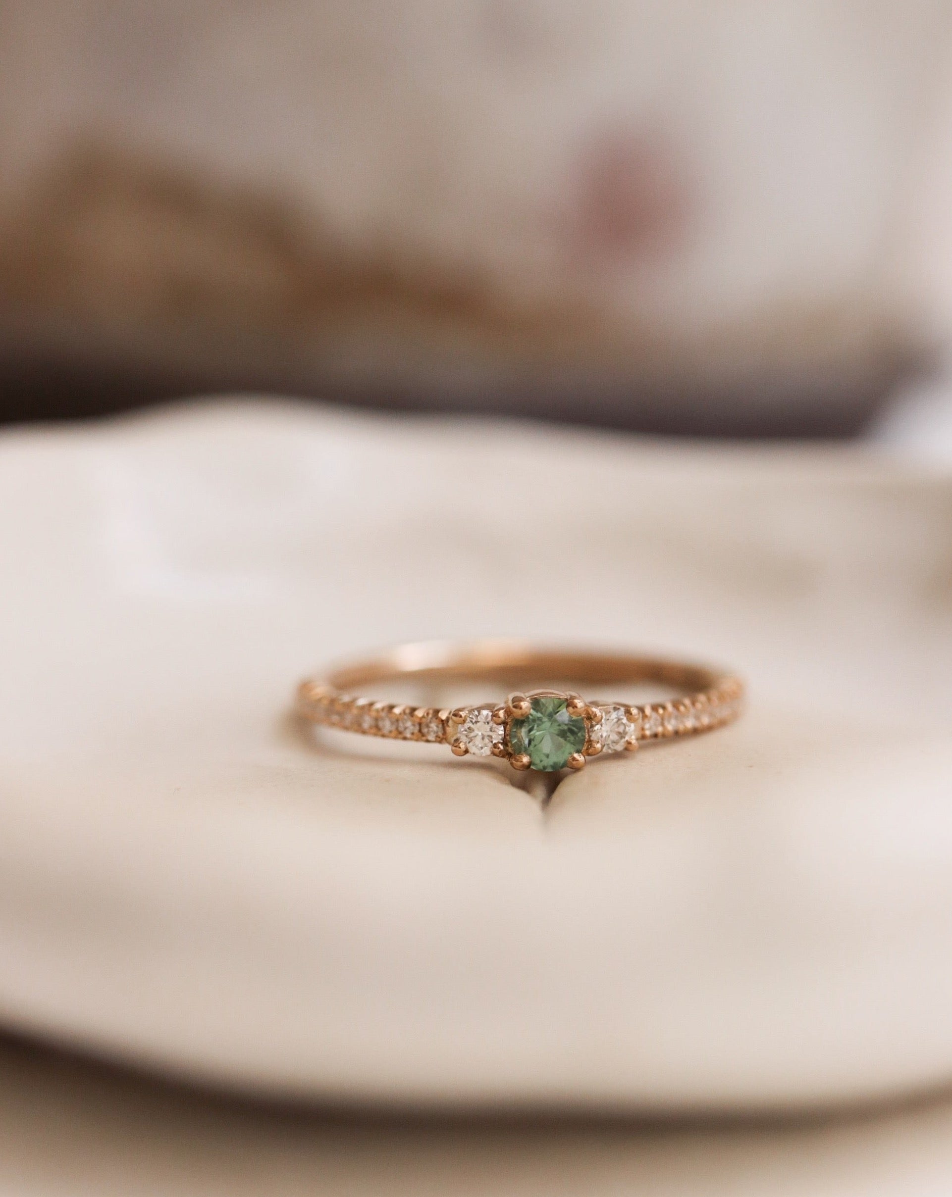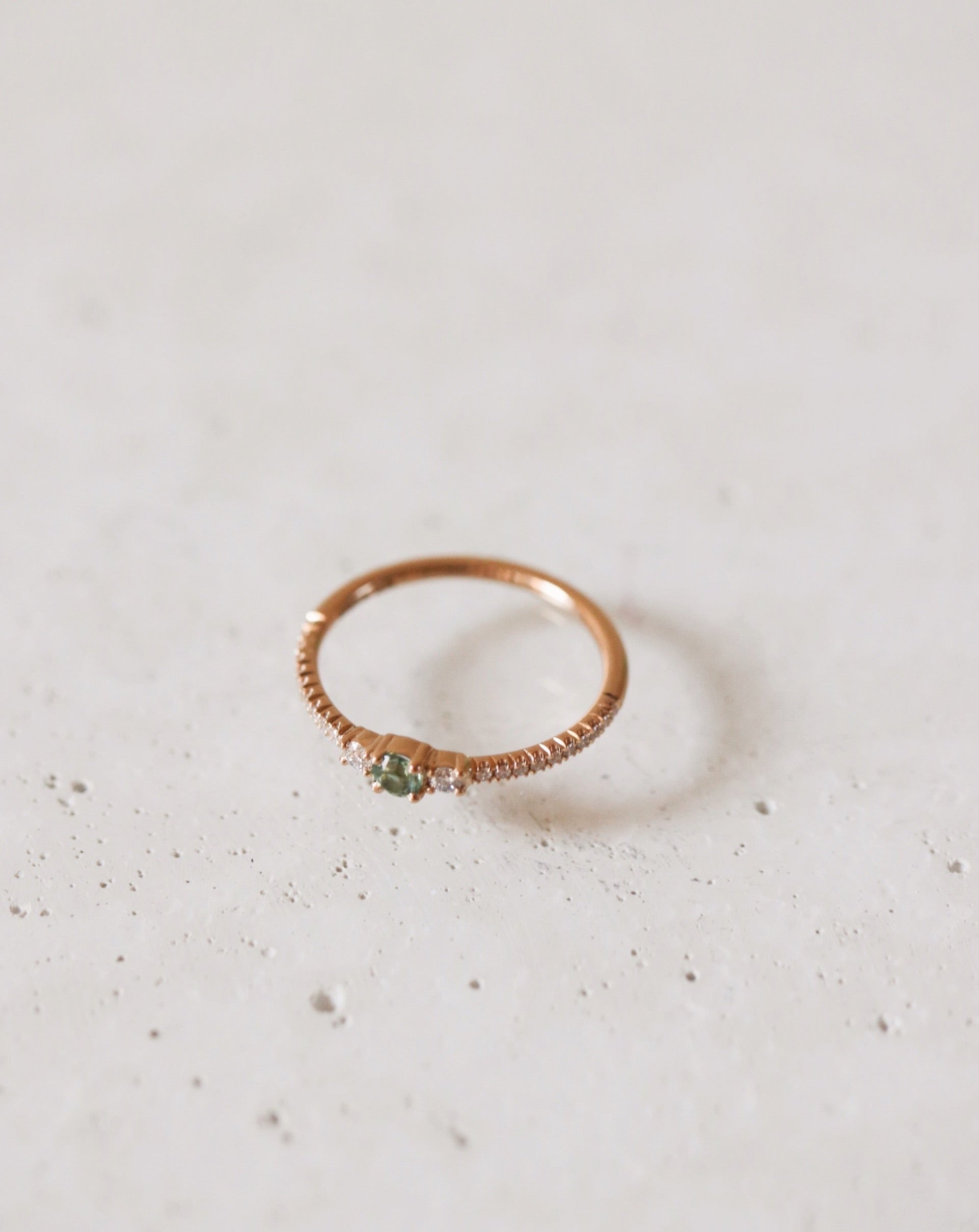 Sapphires come in many colors and hues ranging from dull to vivid, light to dark. In this ring we've used a beautiful light green sapphire.