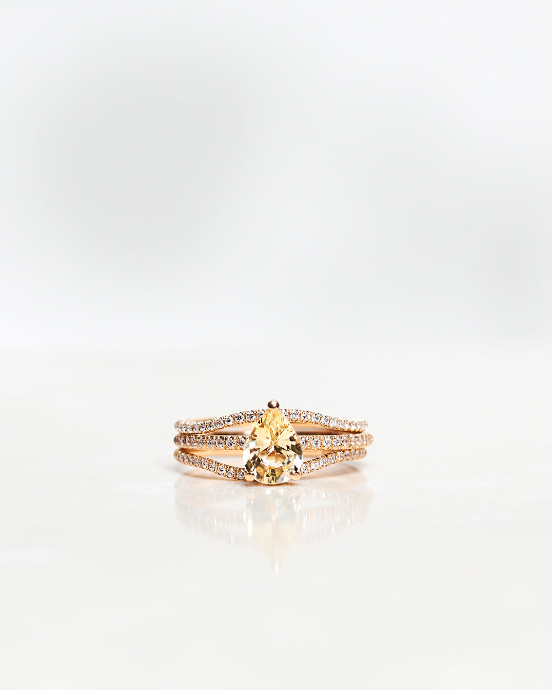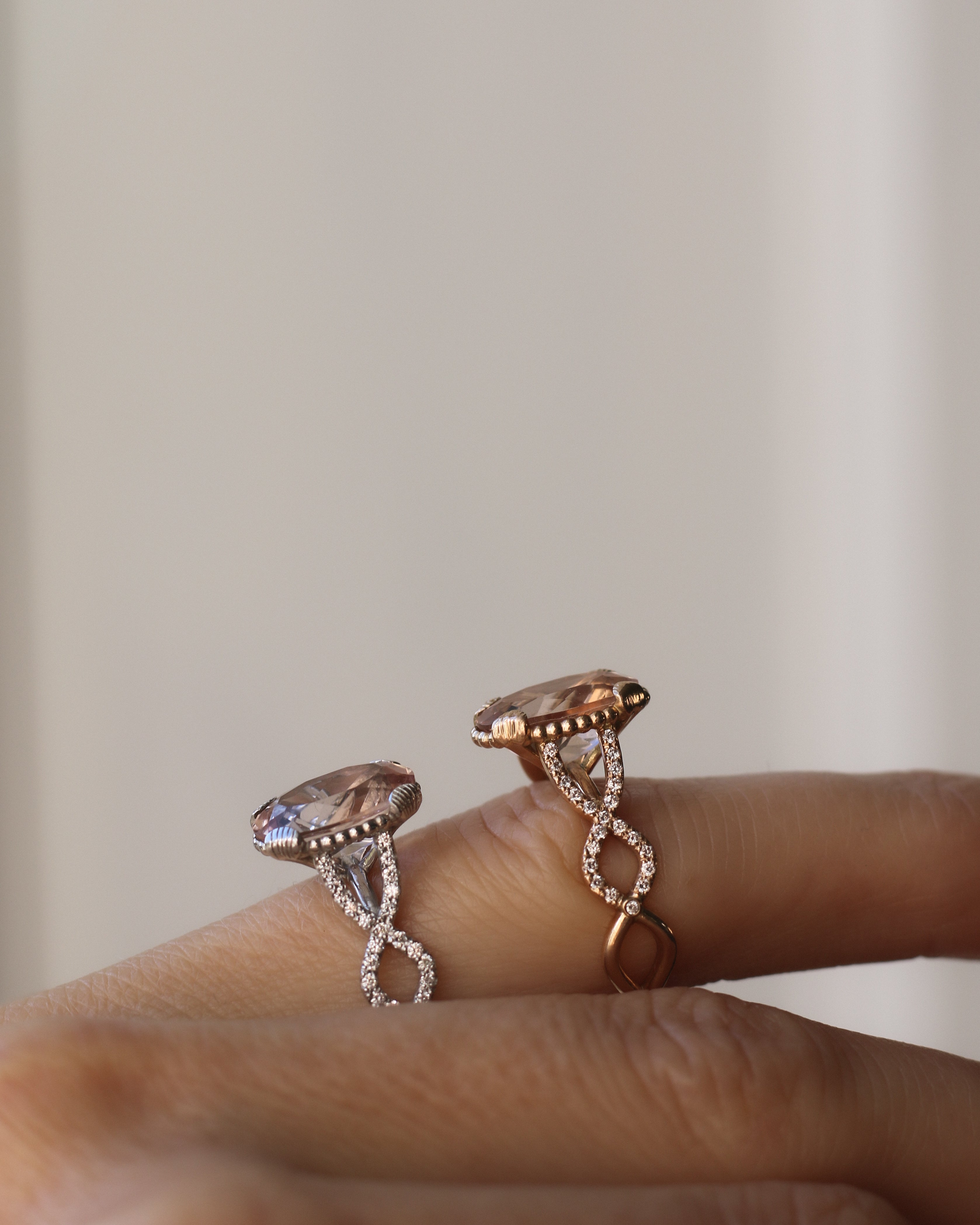 Kollektionen består av tre unika smycken: en cocktailring med diamanter och en varm, champagnerosa morganit i centrum, ett matchande örhänge samt en soiréering – alla med designinslag som för tankarna till havets vågor och Valeries signatursymbol: snäckan.