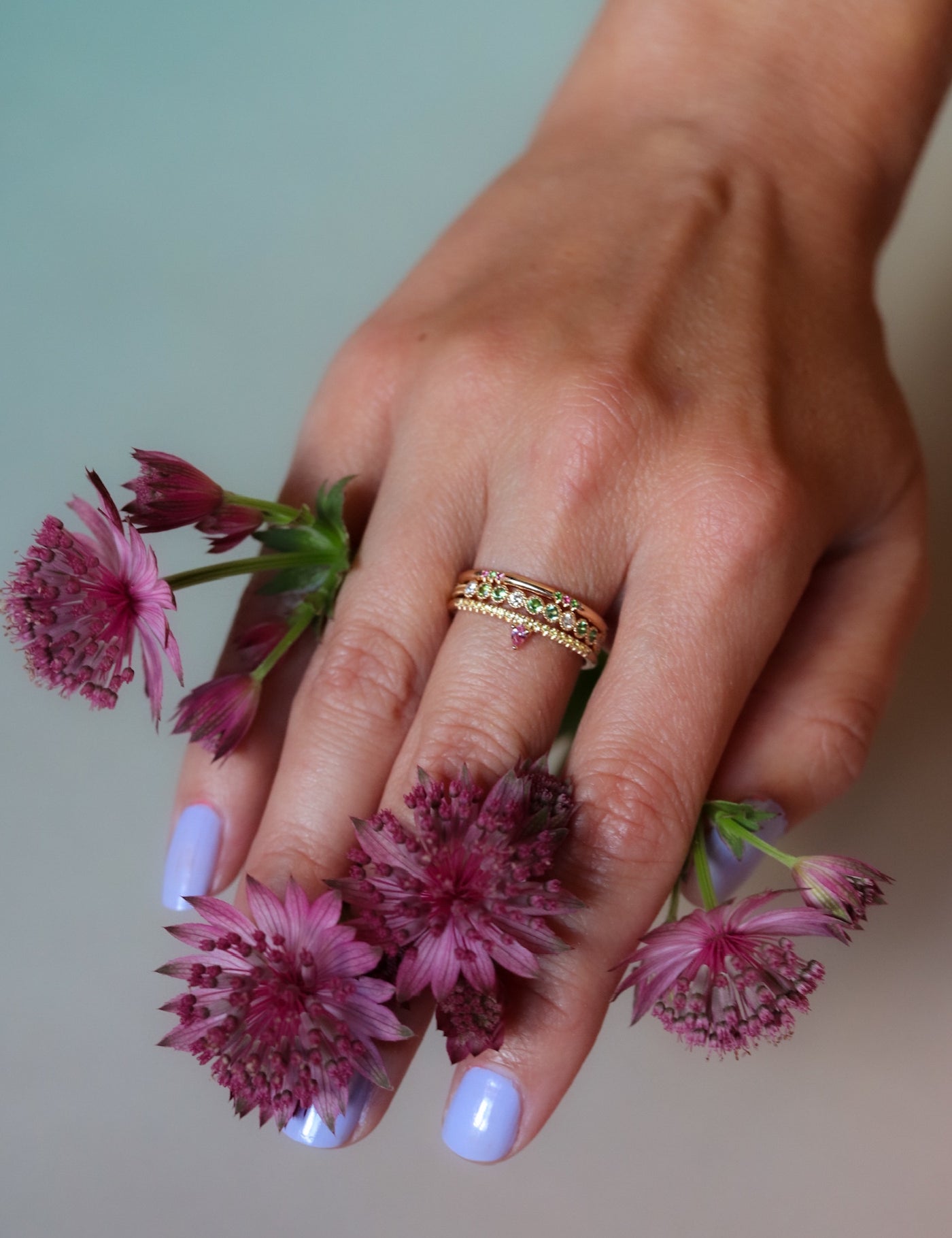 Each ring is created to reflect and amplify the emotions the wearer wants to surround themselves with – where each gemstone color carries a unique energy.