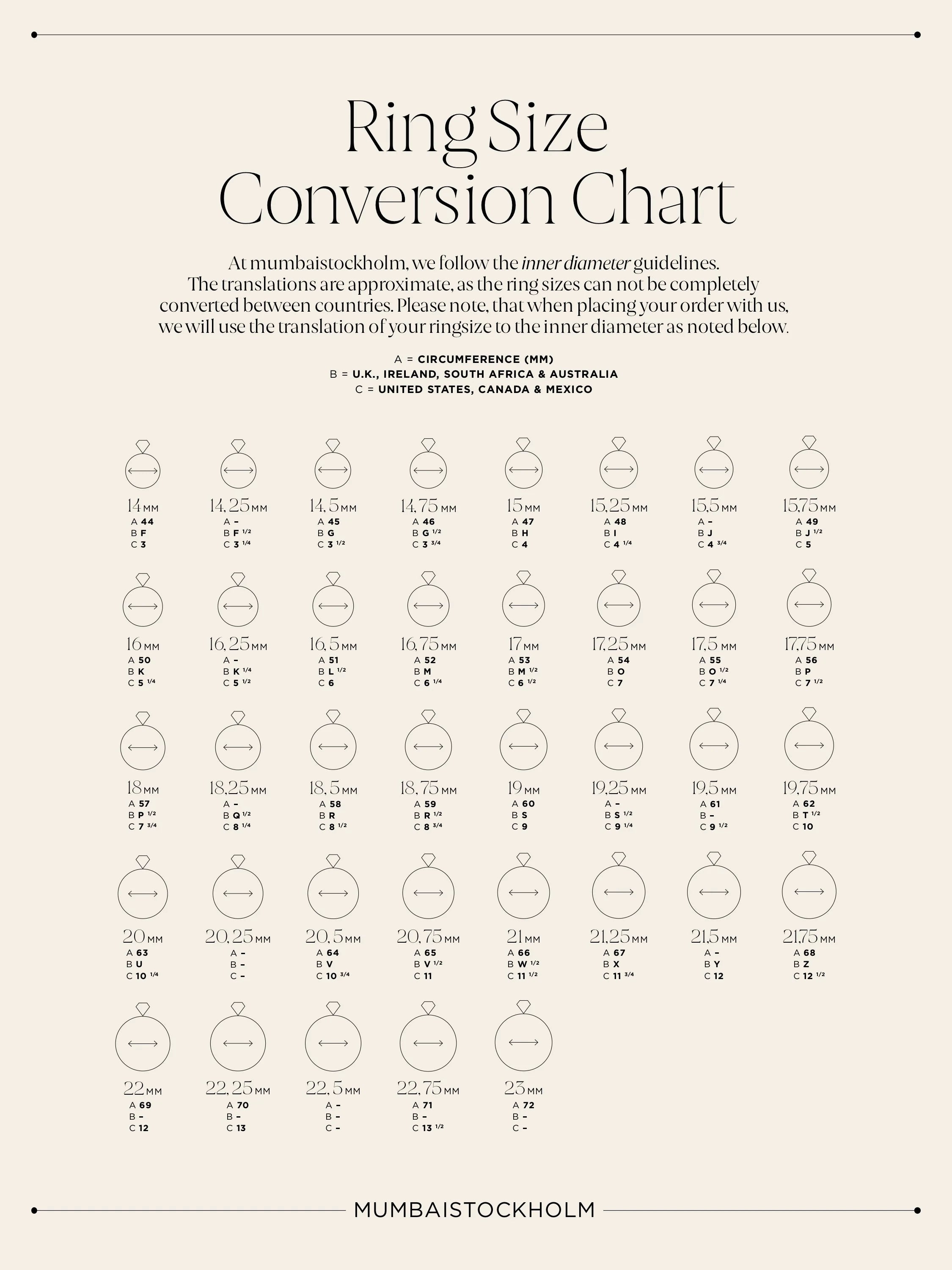 Different countries may use different terms to describe the same ring size. Our International Ring Size Conversion Chart can assist you in finding the right size for your ring.