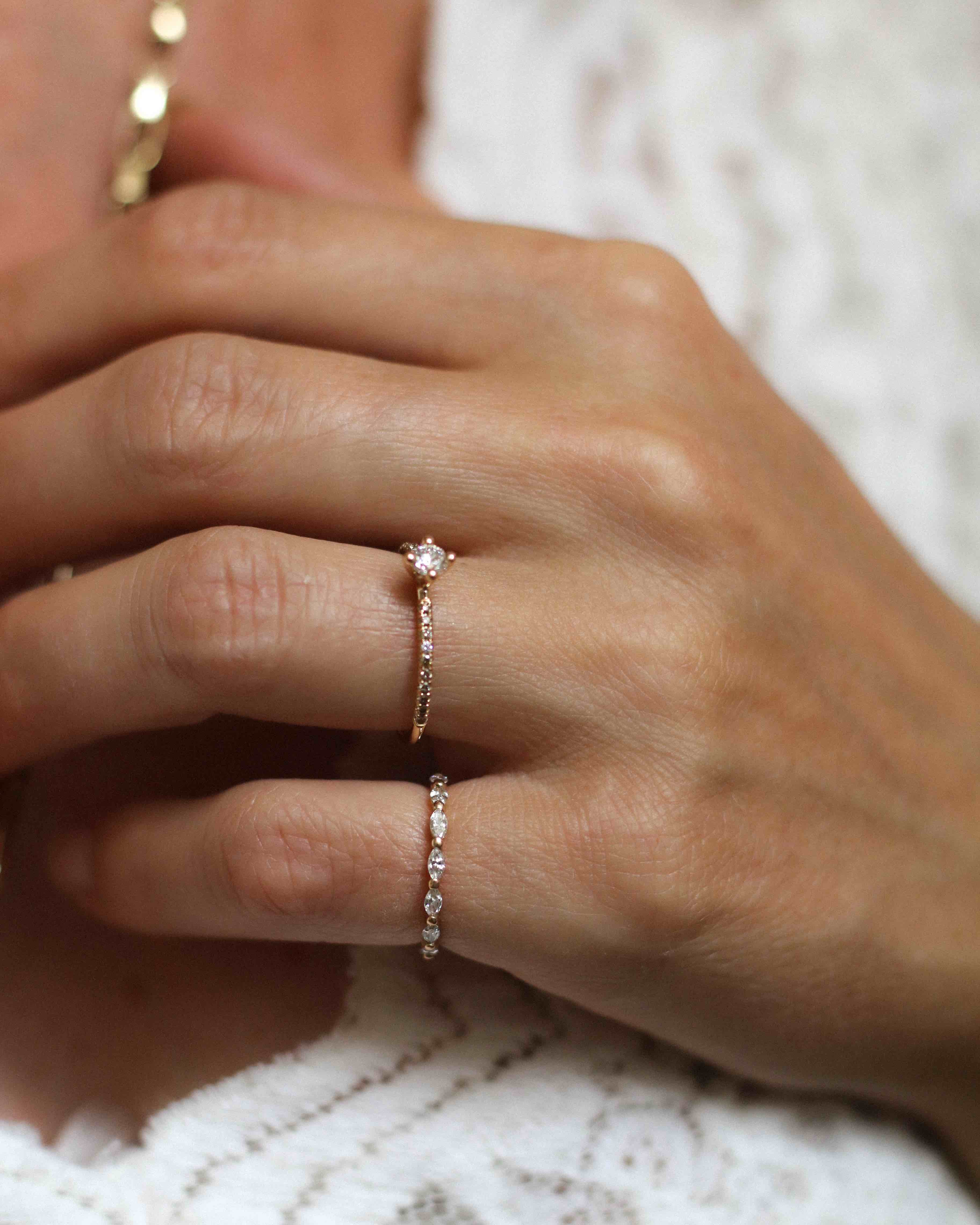 Anita is beautiful on its own as a statement piece, but also fantastic to combine with a thin diamond band such as the Jade Petite Ring or Marquise Ring