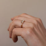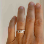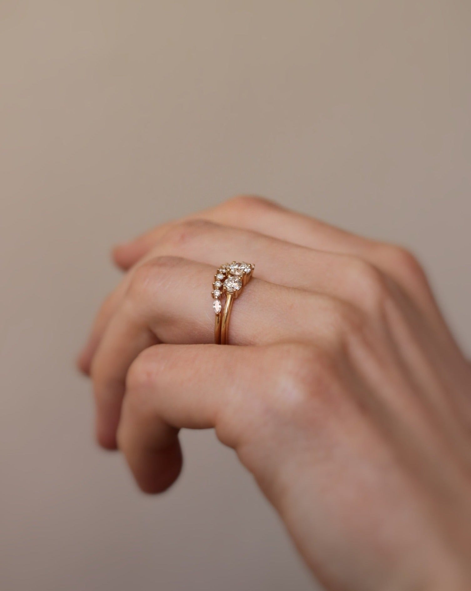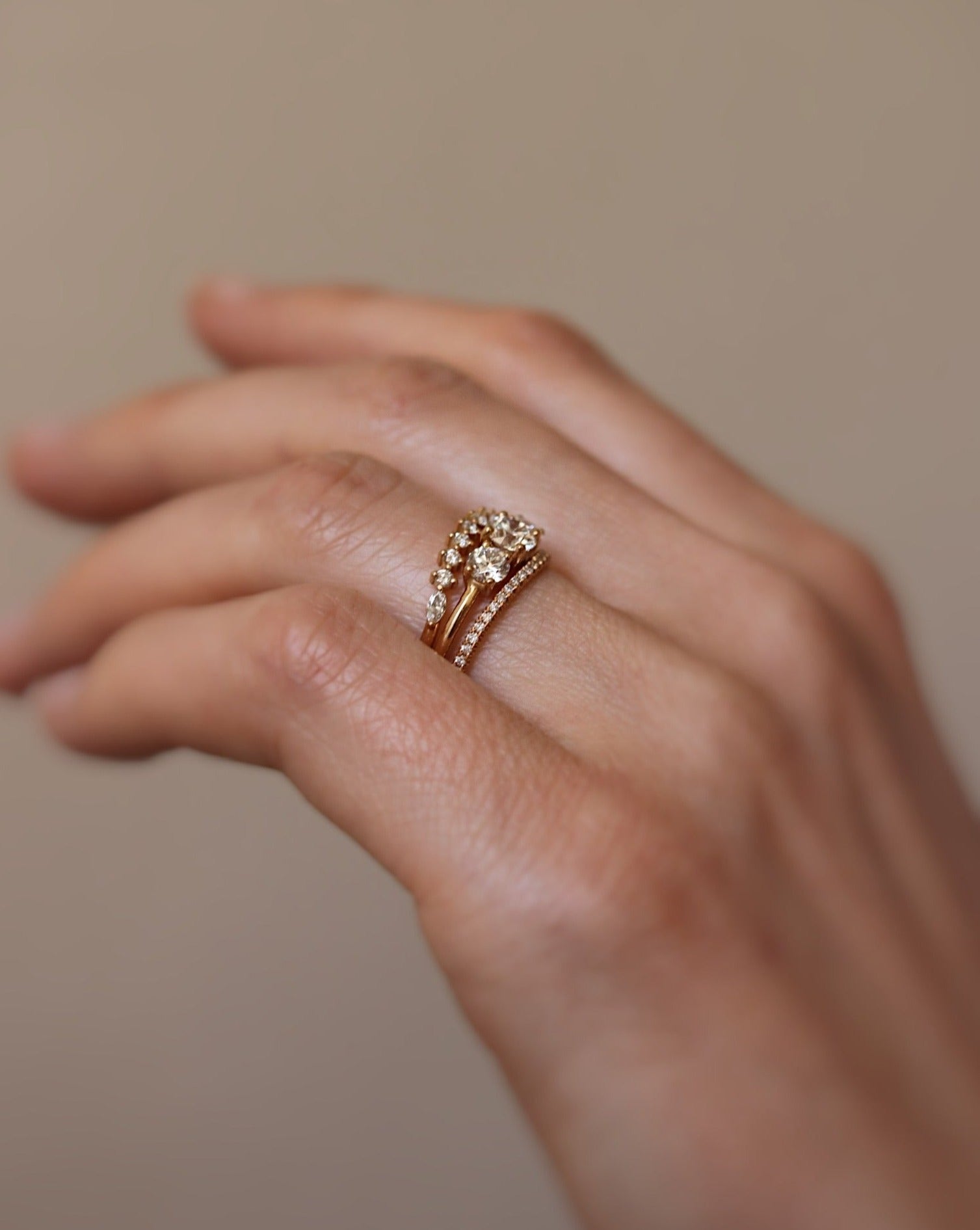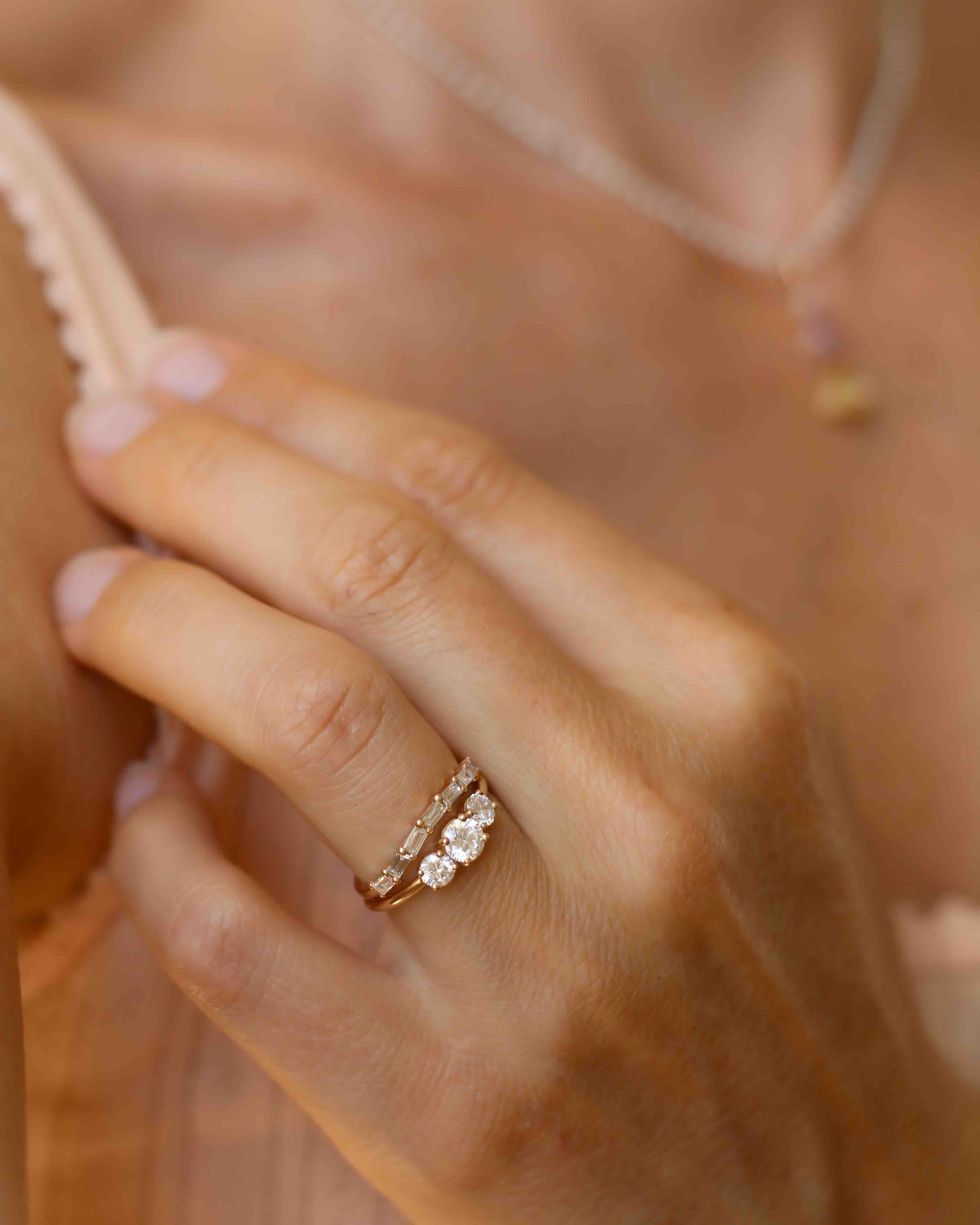 Edith Ring is beautiful worn alone as well as combined with other rings. For you who wish to stack your Edith Ring, we recommend our curved bands. The curvature emphasizes the three diamonds in Edith Ring in a beautiful way.