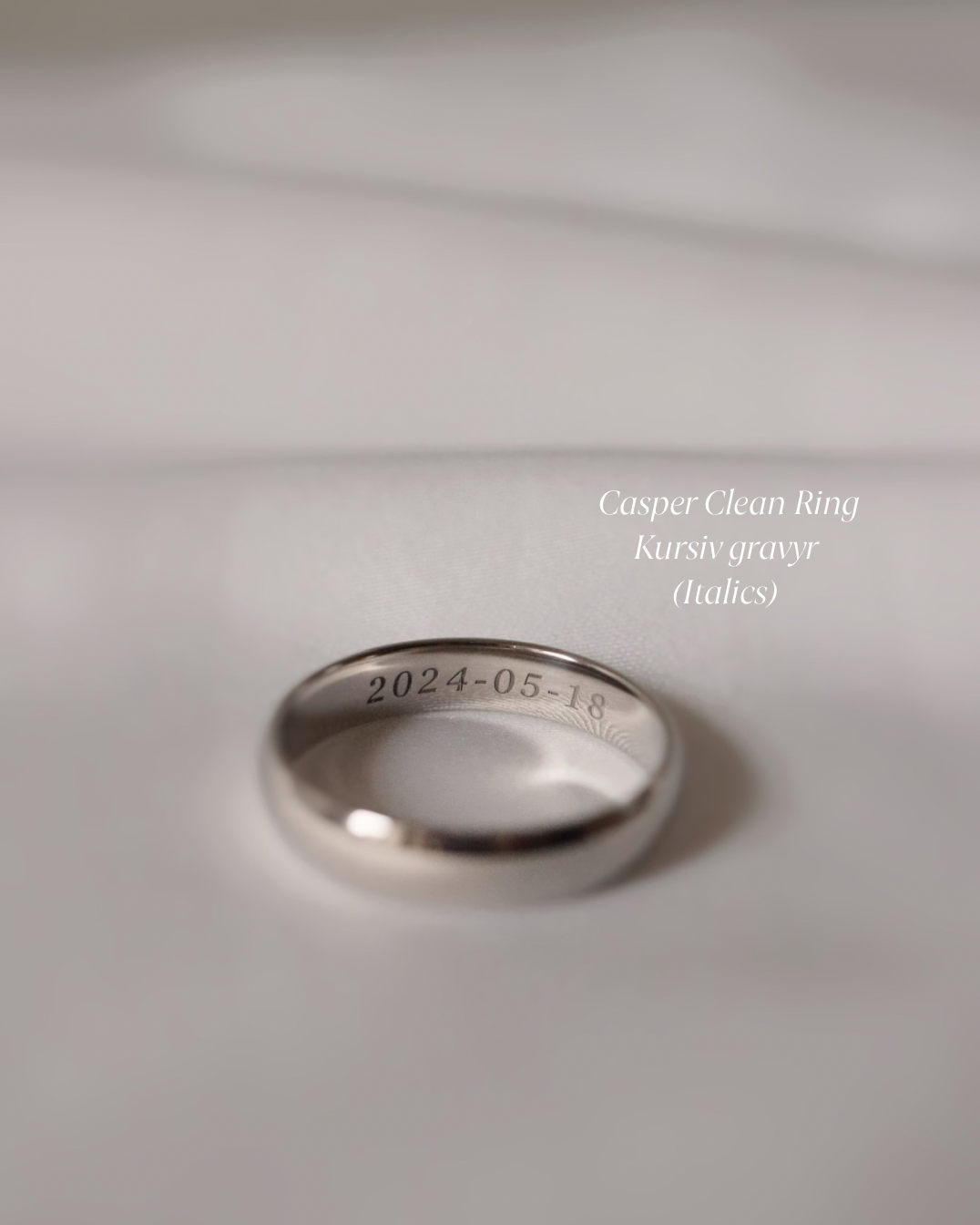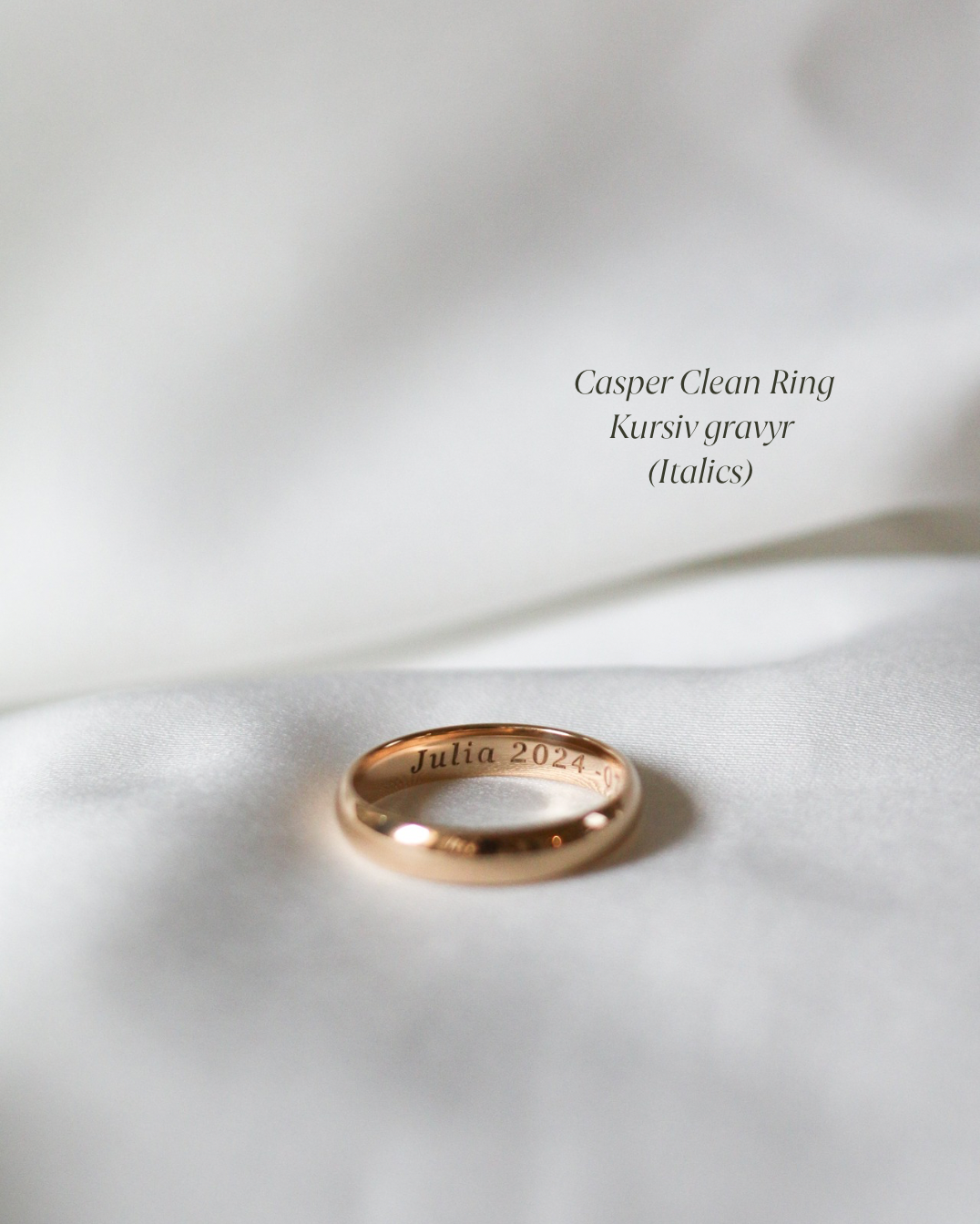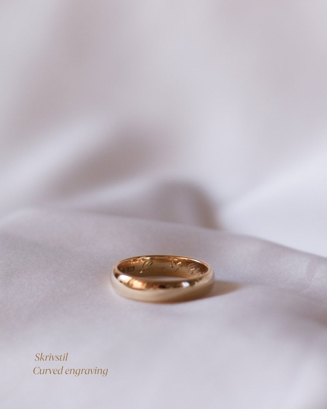 Curved: the engraving style often found in old gold rings worn by your grandfather. The curved style can be selected in all men's rings and in women's rings that are wider than 1.8 mm (such as Nonna's Dome Ring or Classic Goldie)