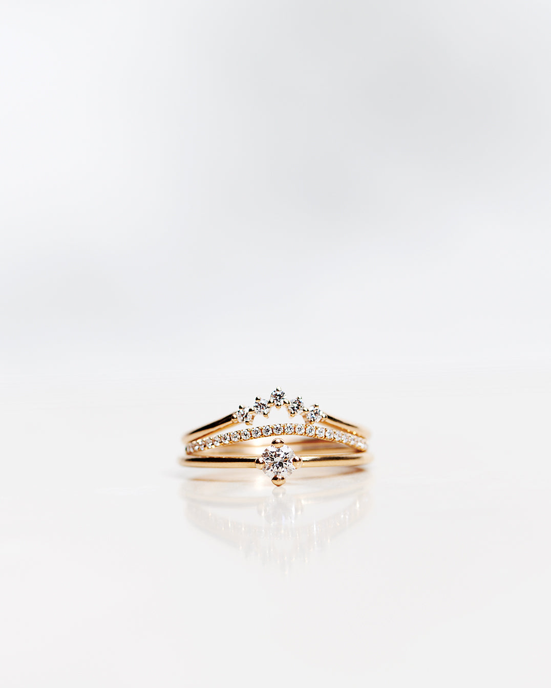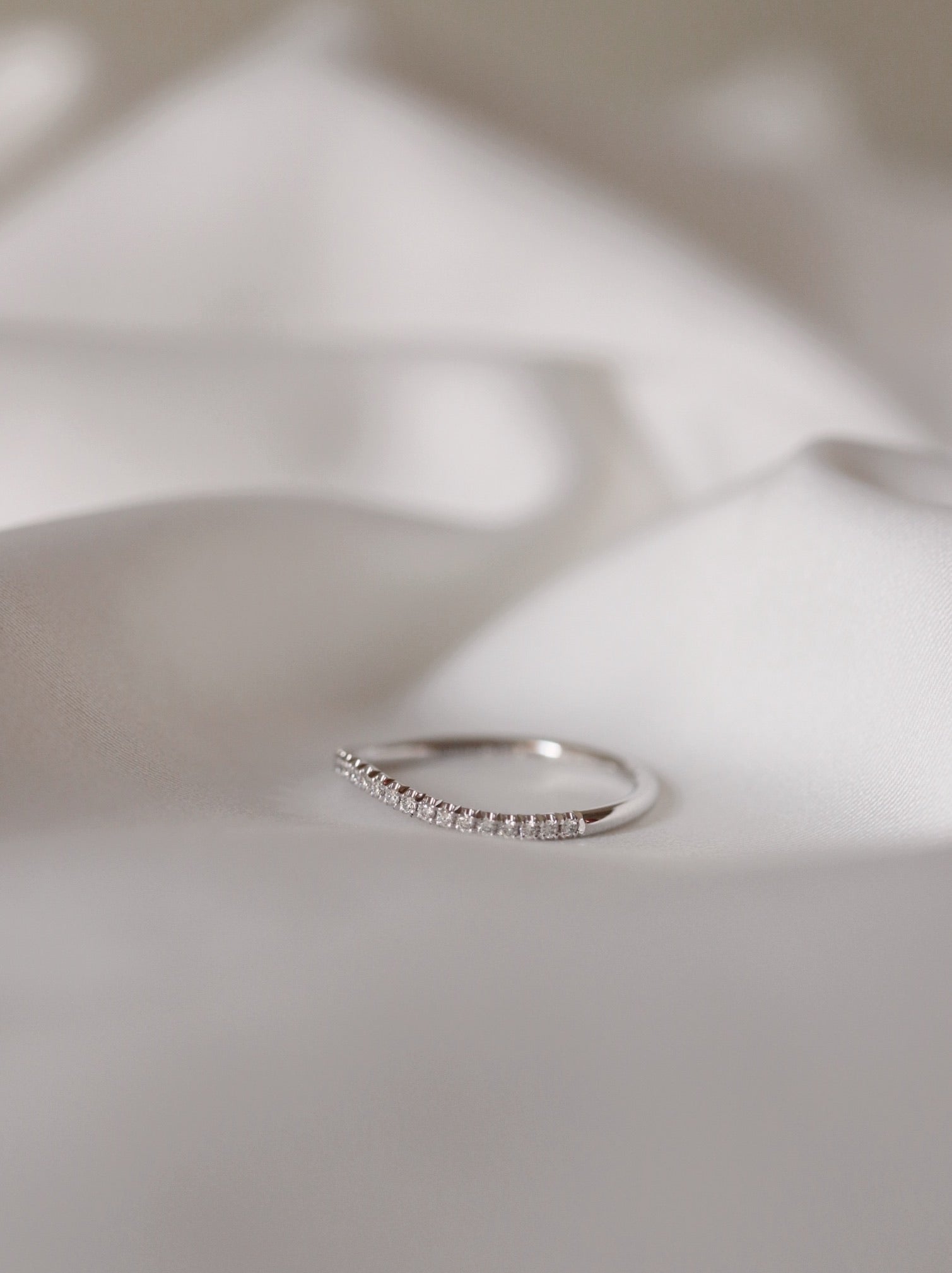 It acts as a beautiful curved band - a so called "diamond jacket" - to our side stone rings Edith, Elise, Greta and Gilda