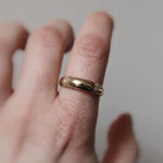 Solid gold - the ring is not hollow and will therefore keep its shape over time. It has a lovely weight to it - which adds to its tactileness. The fact that the ring is solid and so robust also means that it is very durable and can easily be polished up later to keep it in good condition!