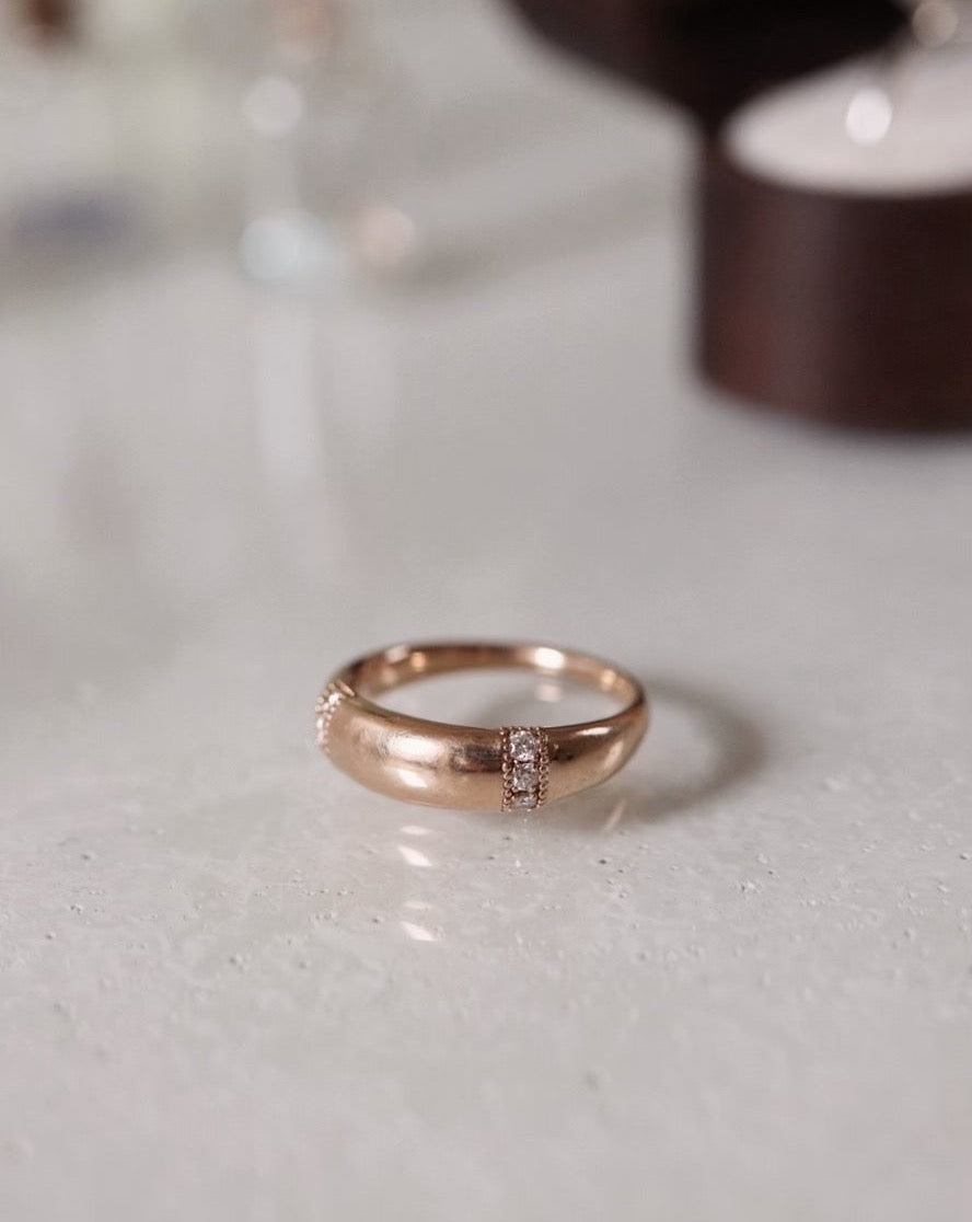 The dome ring is a classic ring model that has a shape that is thicker at the top and narrows down between the fingers. Thanks to its shape, it is so comfortable!