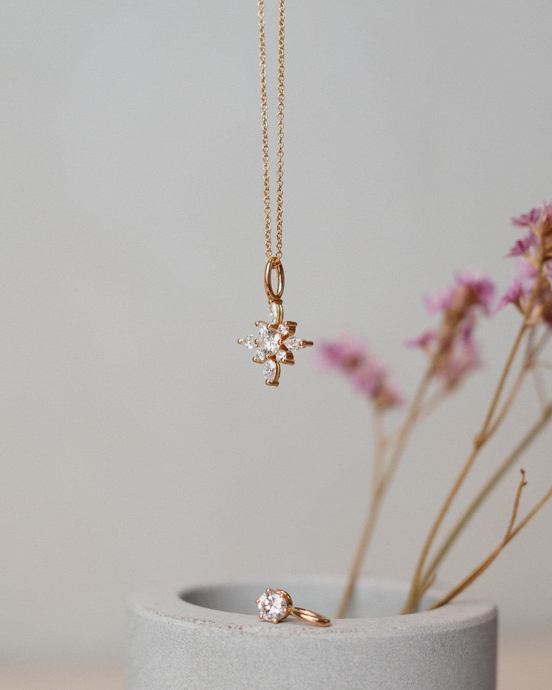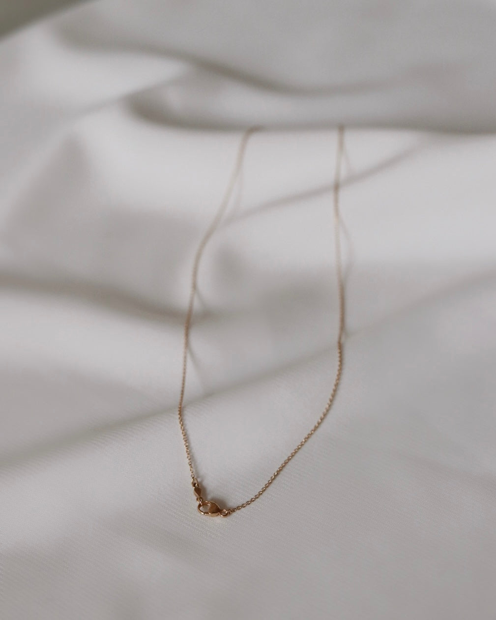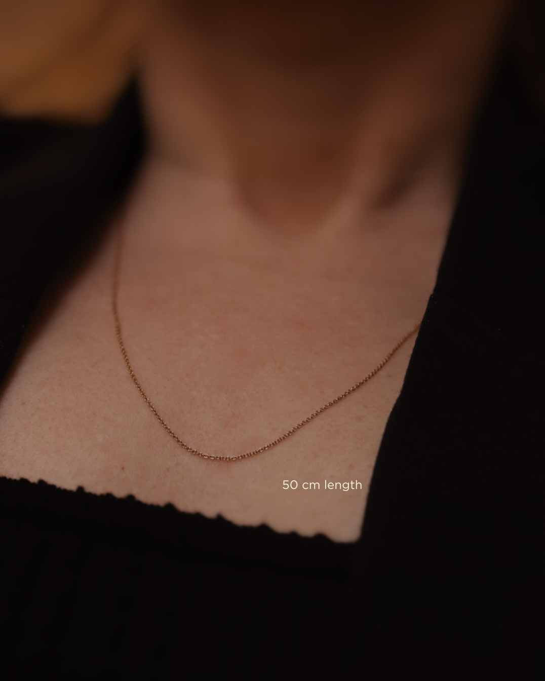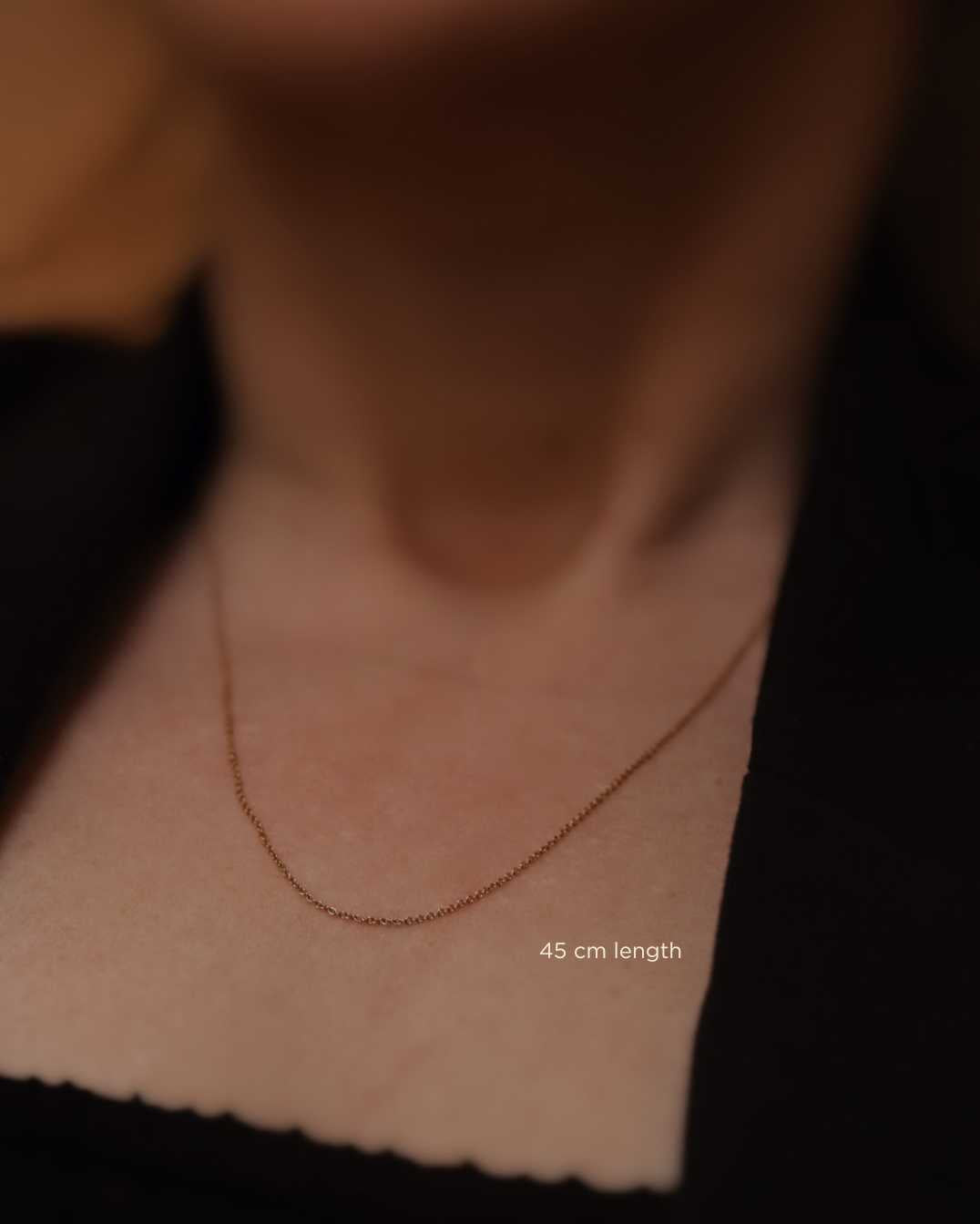 Below you see Helena in our 1 mm bare gold chain, which is the minimalistic chain we use in most of our short necklaces.