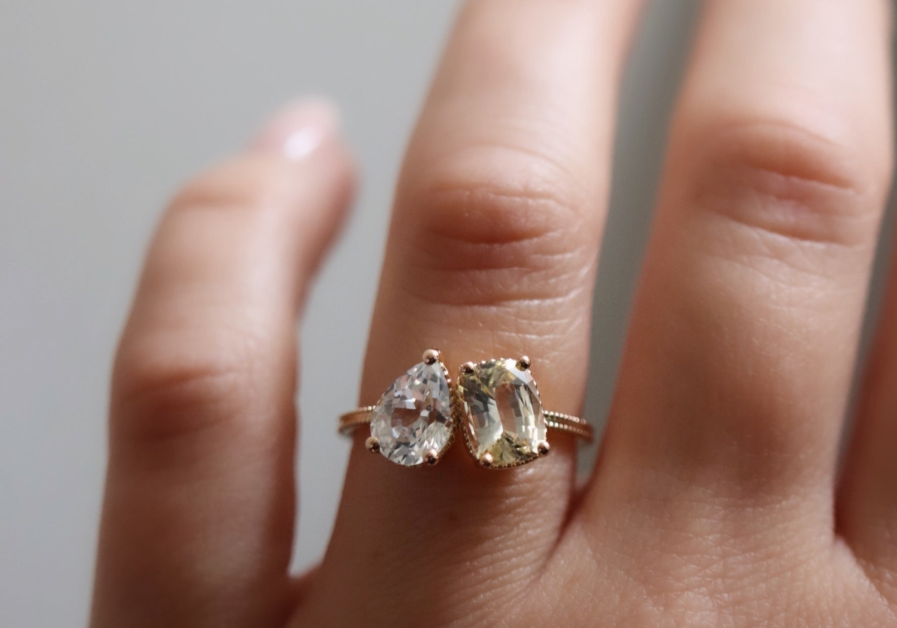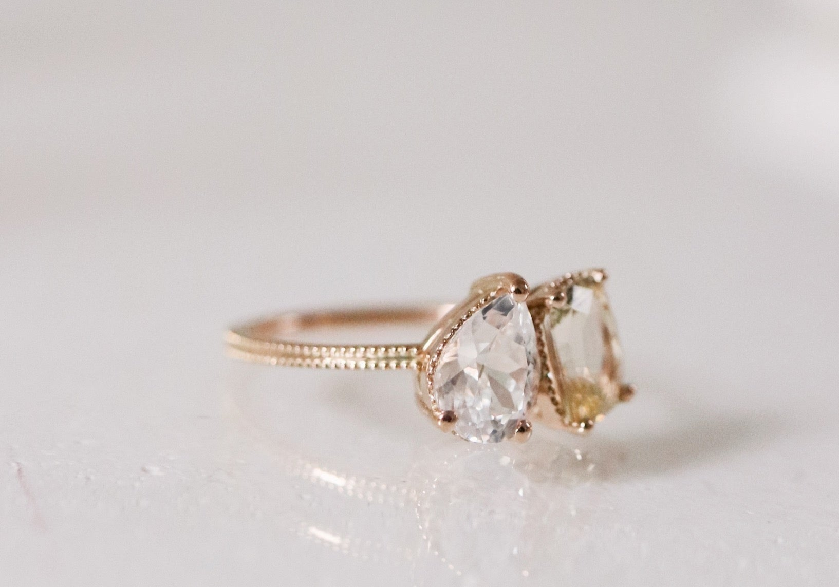 En dubbel solitärring - så kallad Toi et Moi-ring efter franskans "Du och Jag". Vacker dekoration av gammeldags milligriffdekor