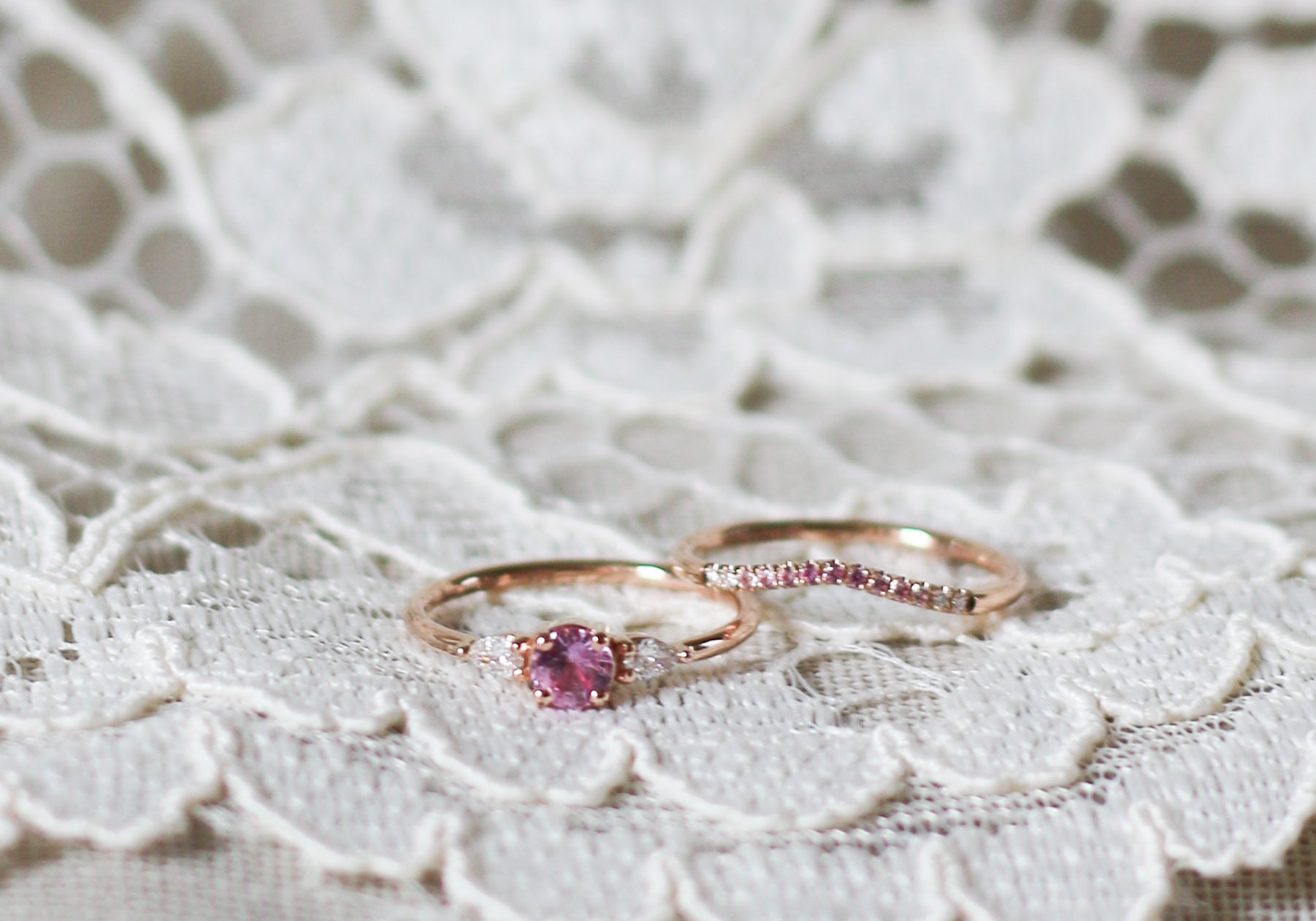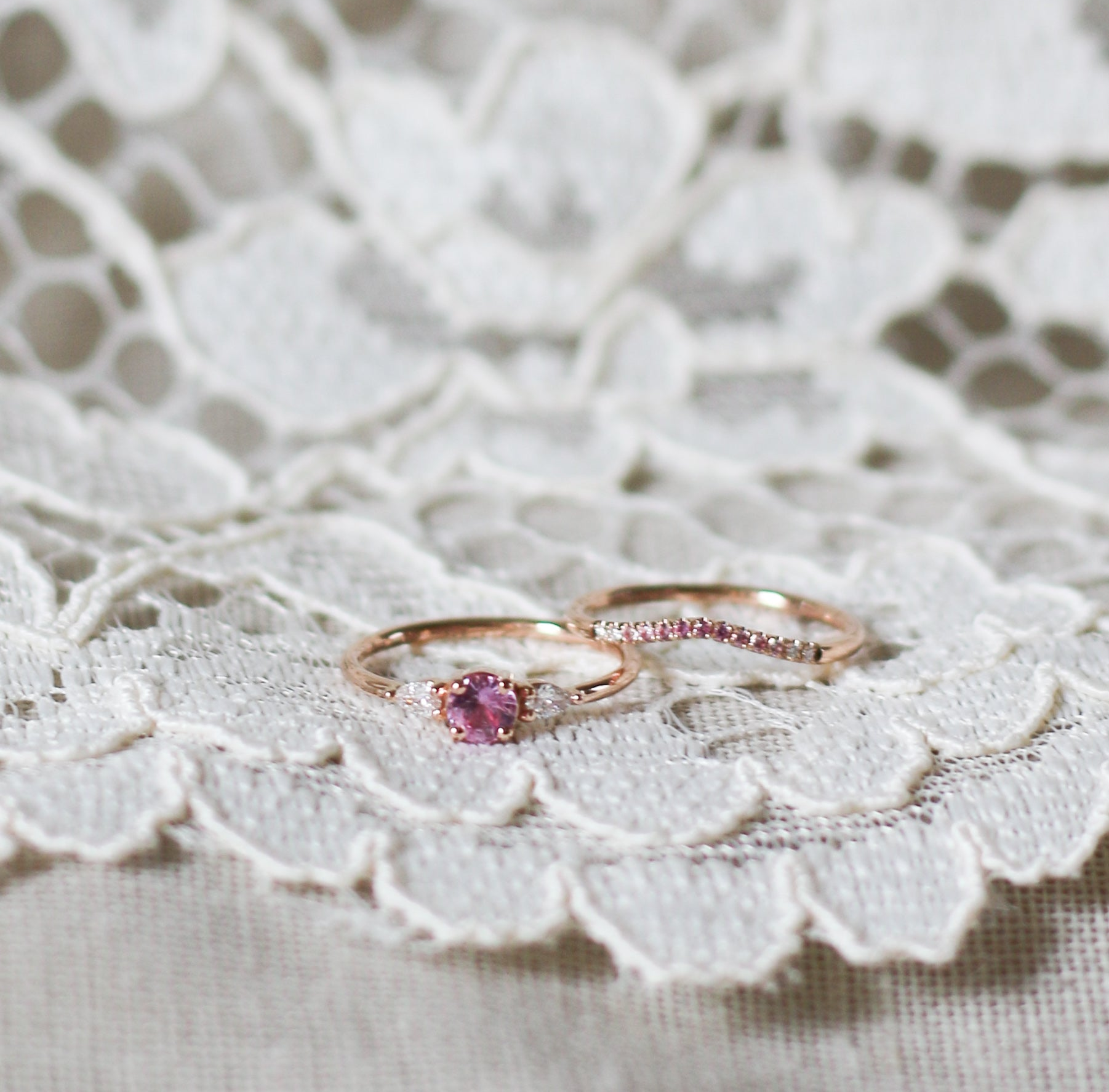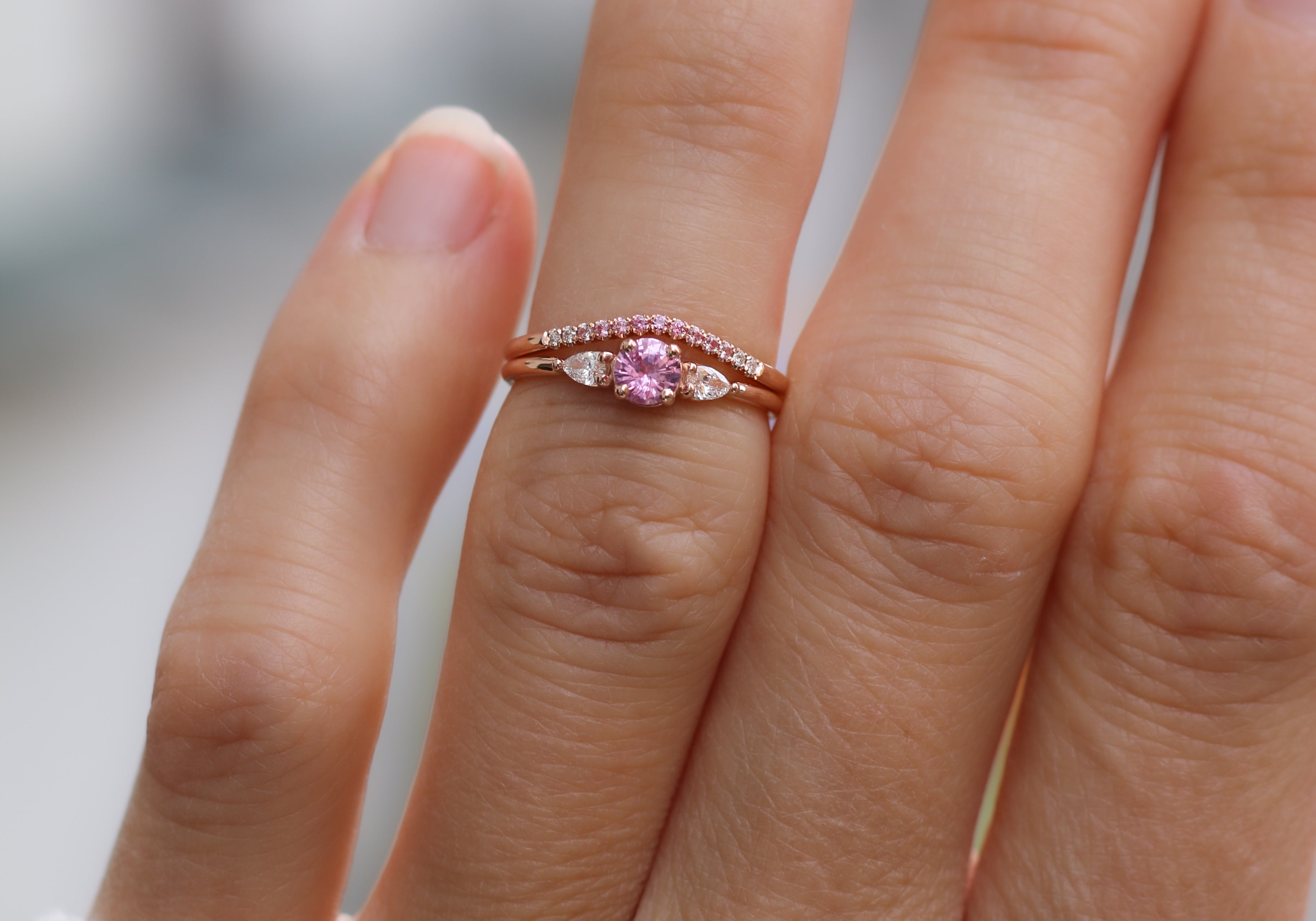 Förlovnings- och vigselring till en kvinna som älskar rosa.
