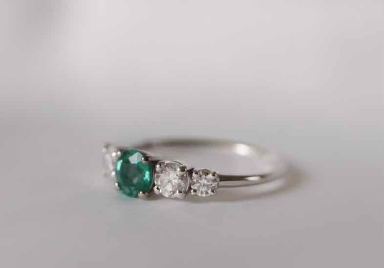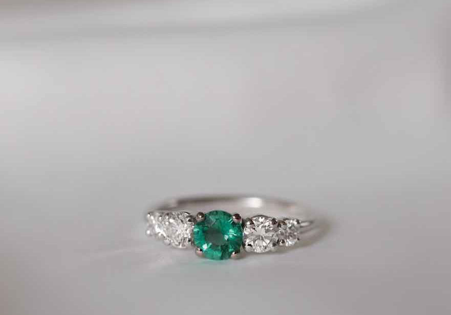 En elektriskt grön 0.41 CT/5 mm smaragd flankerad av vita diamanter av mycket hög kvalitet