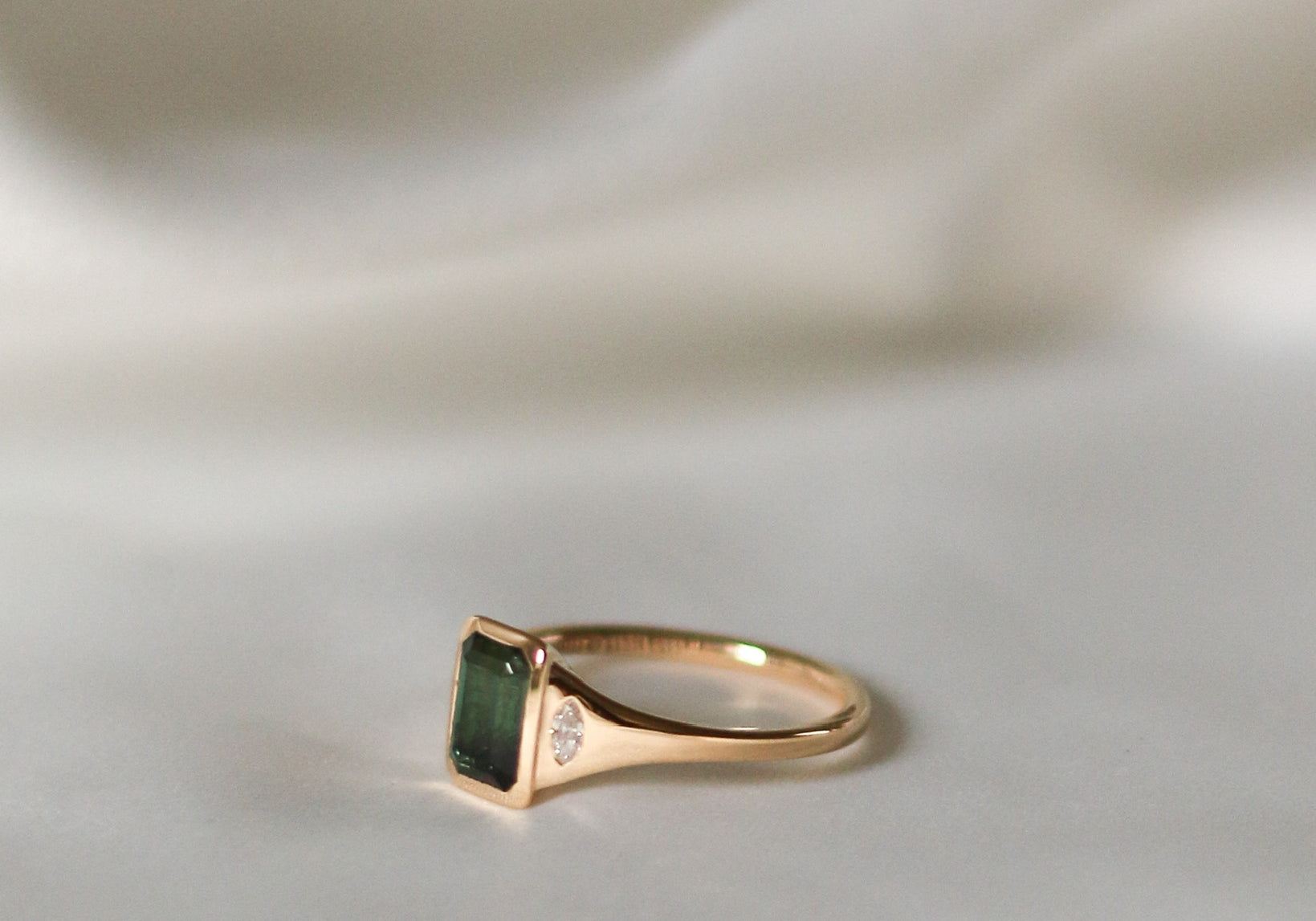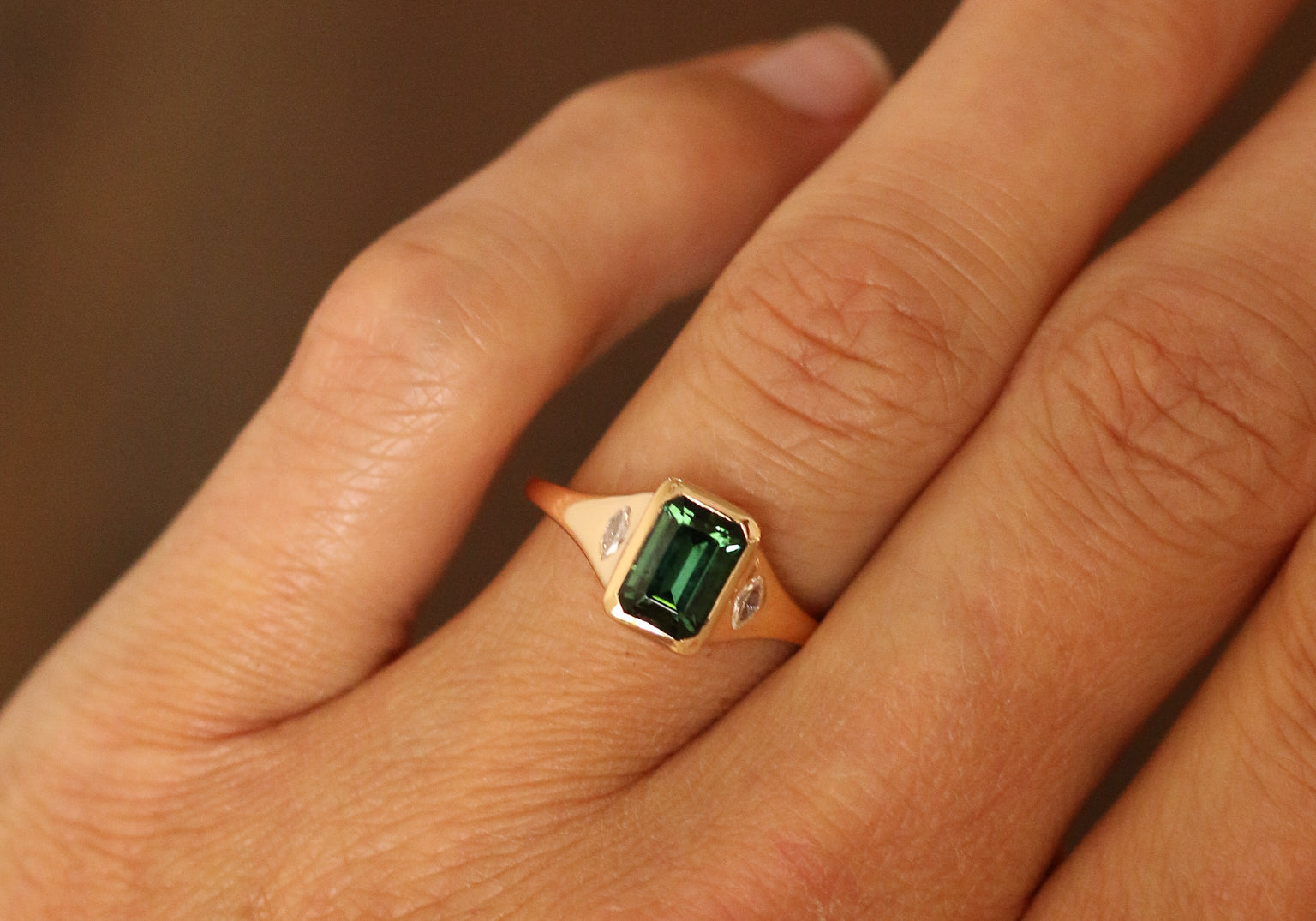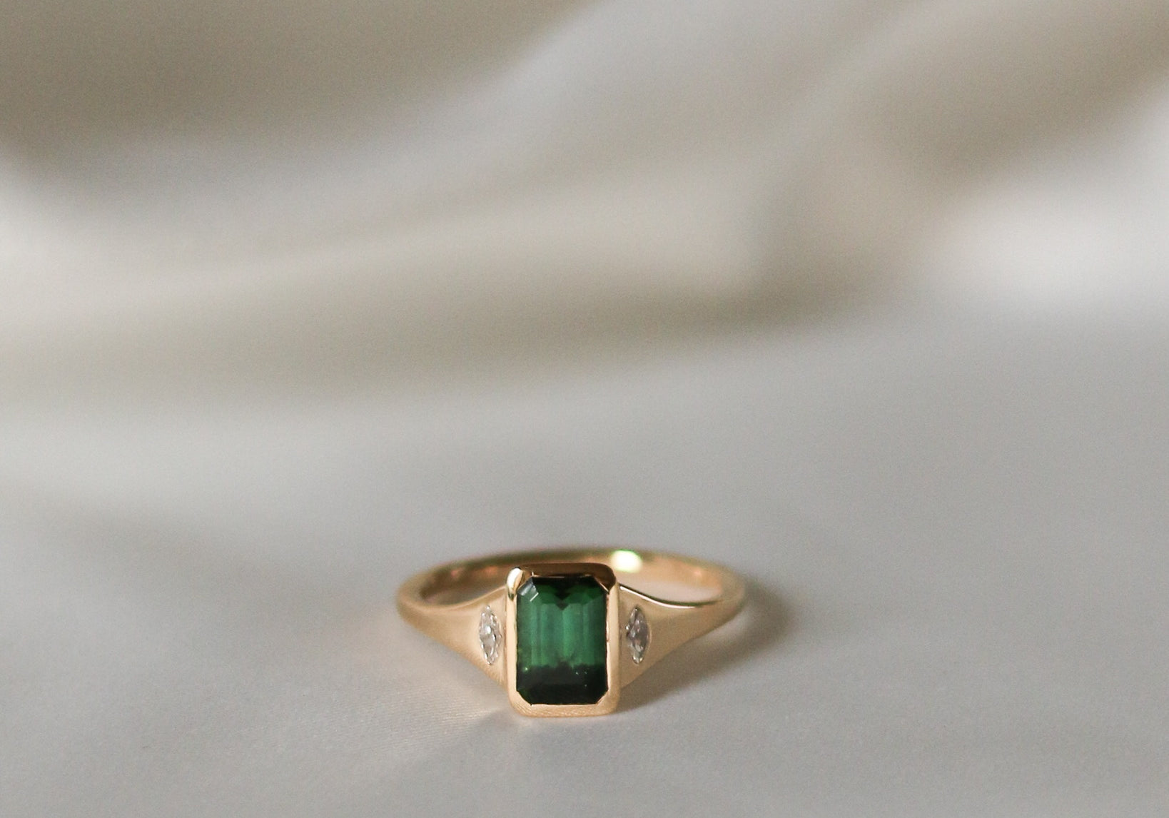 En mörkt grön turmalin med blå undertoner (ca 7,5 x 5,5 mm) och två små marquiseslipade diamanter av mycket hög kvalitet