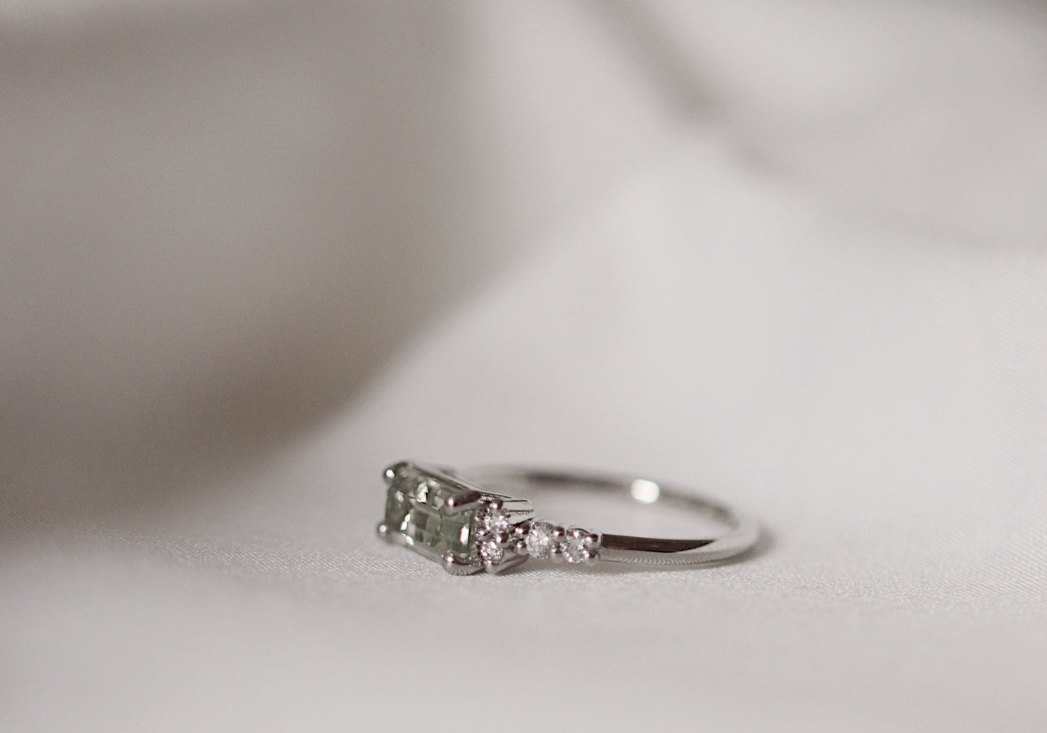 En 0.83 CT (ca 4x8 mm) mjölkigt grön mintberyll och diamanter av mycket hög kvalitet