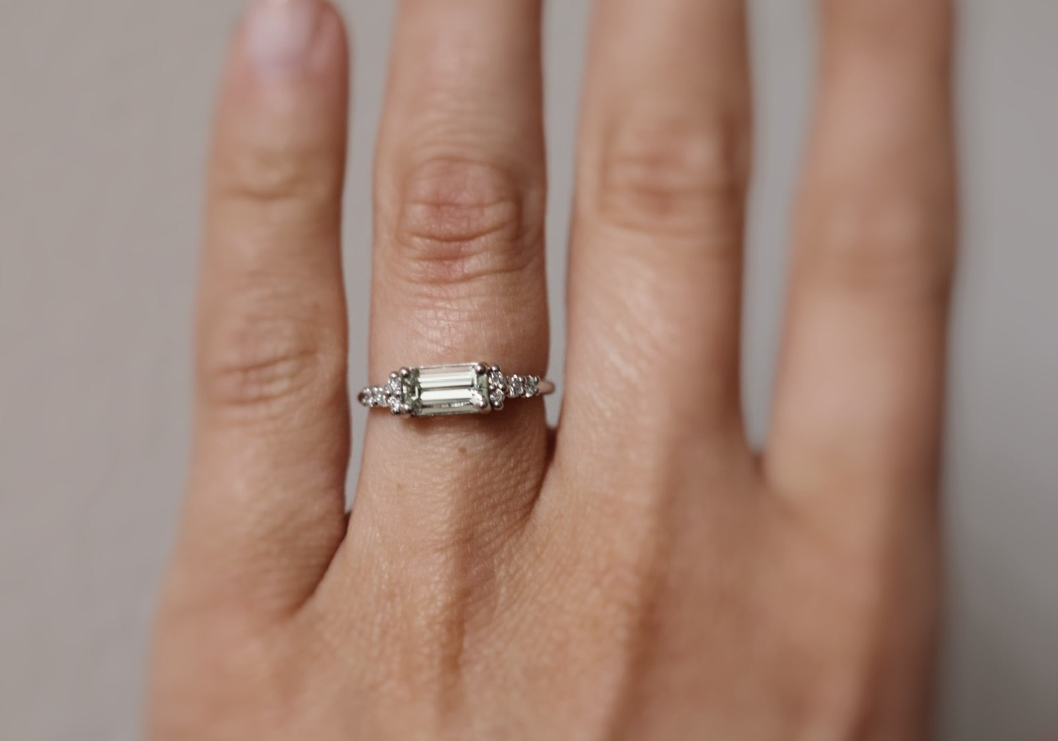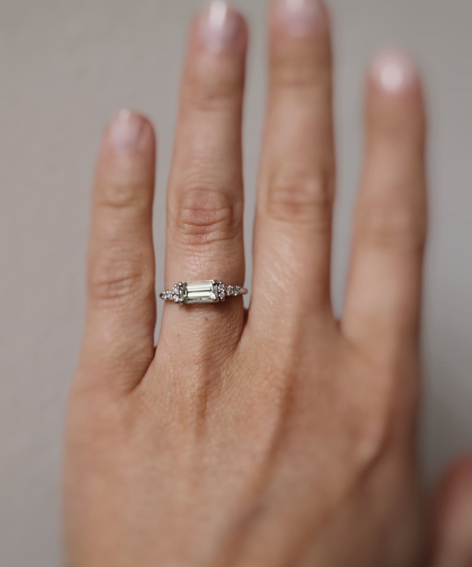Hon önskade en riktig powerring att kunna använda året runt. Stenen skulle vara mycket urblekt - på gränsen till färglös - för att smälta in så mycket som möjligt och inte sticka ut.