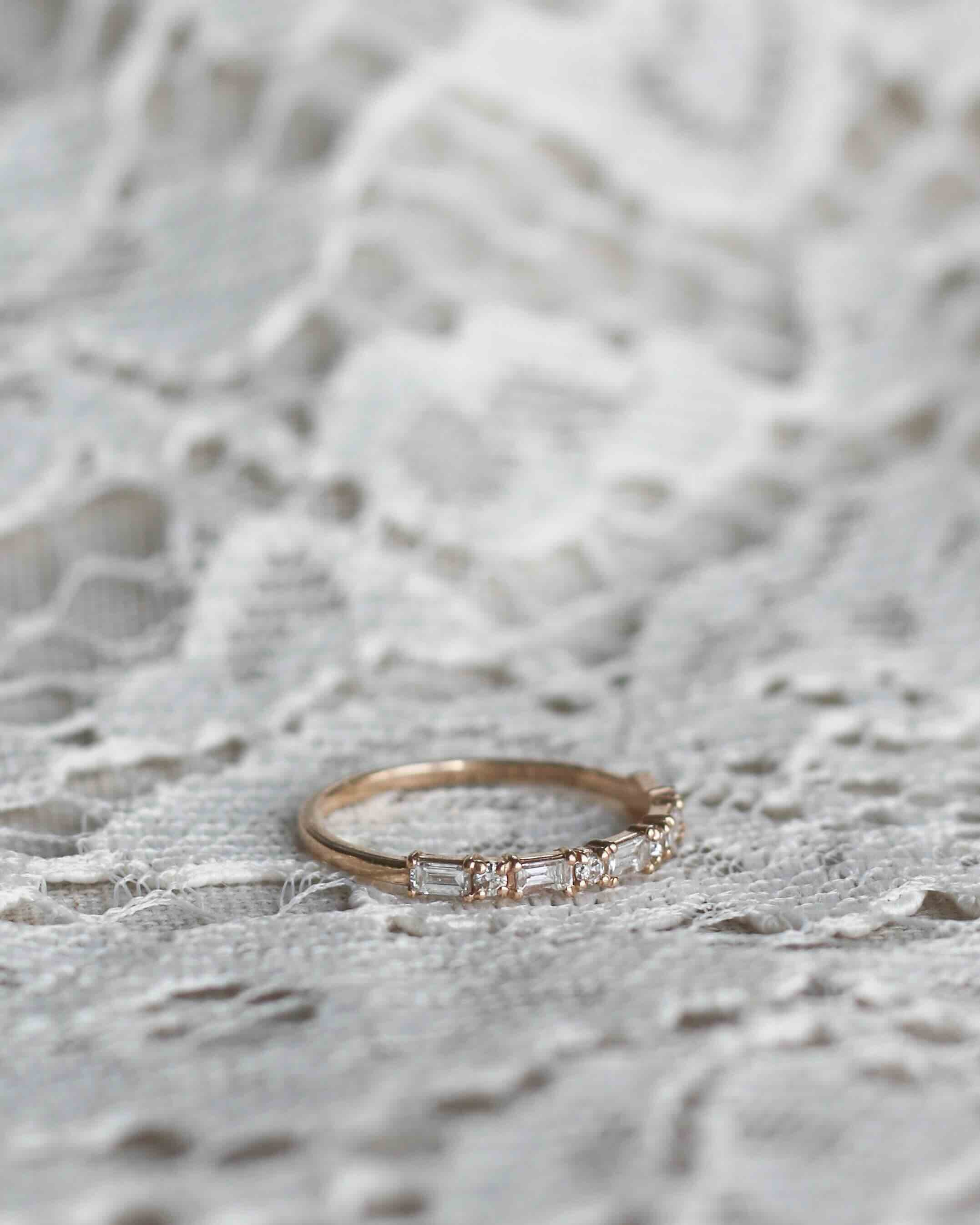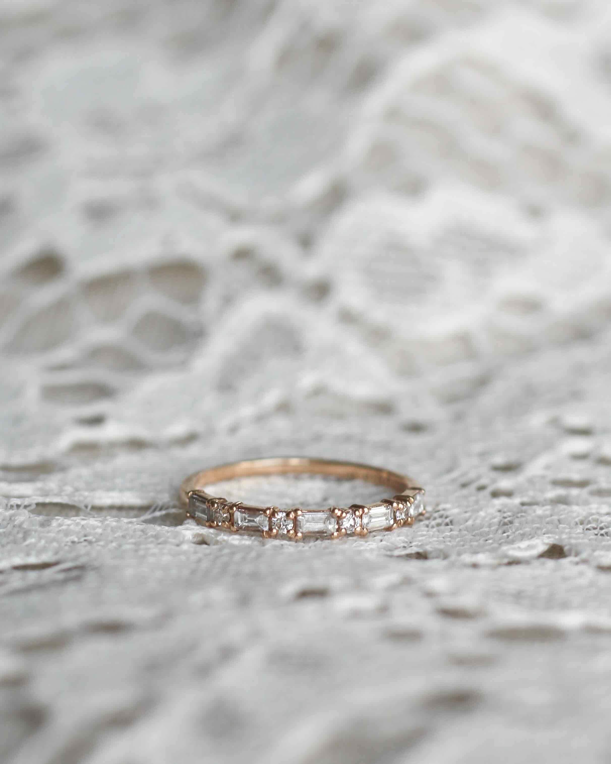 Alternerande baguettediamanter och briljantslipade diamanter runtom hela ringen