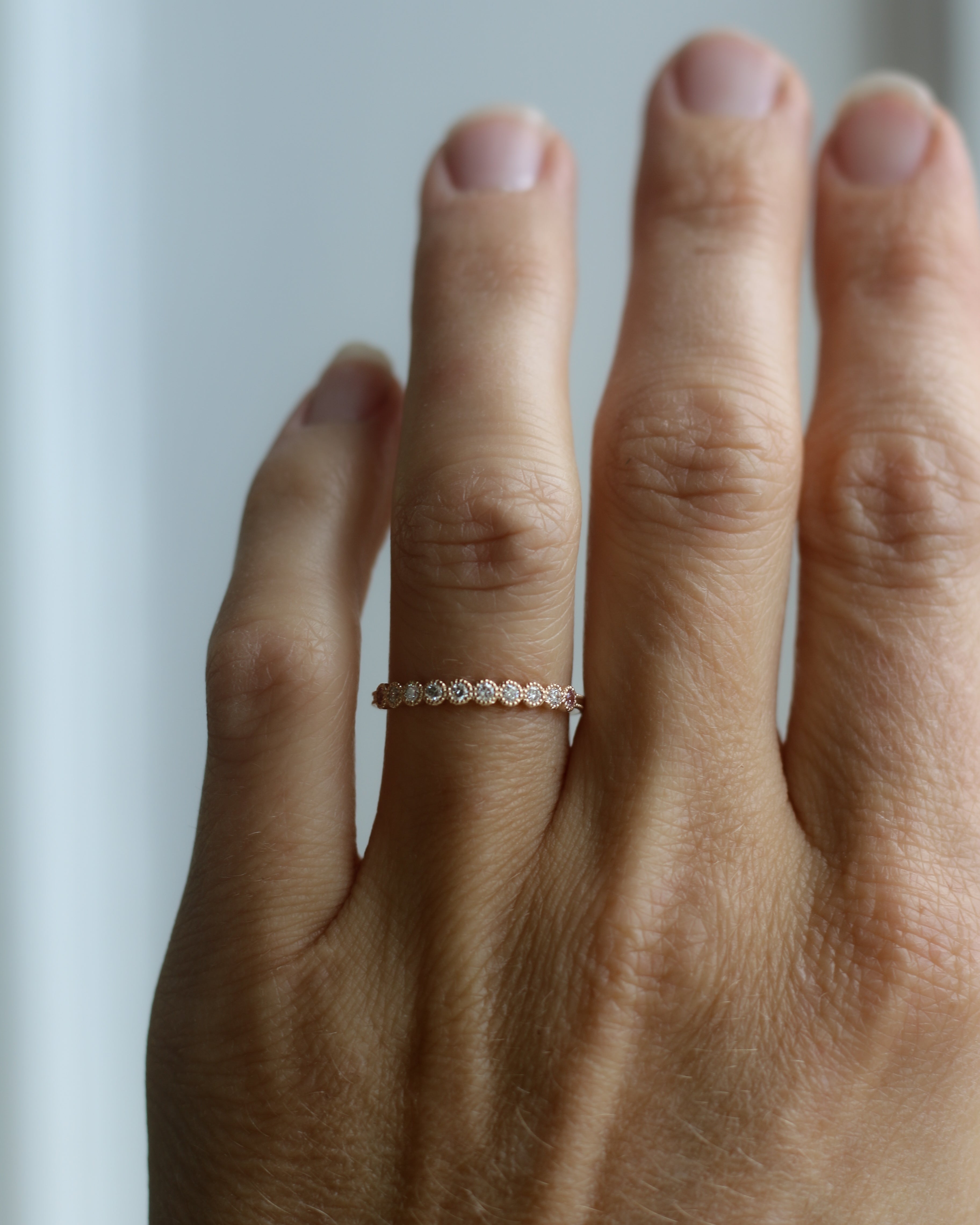 Astrid Vintage Diamond Band fantastiskt vackert diamantband som har en underbar vintagekänsla. Dekoren runt fattningen är en underbar milligriffdekor som var vanlig i smycken under förra sekelskiftet (1800/1900).