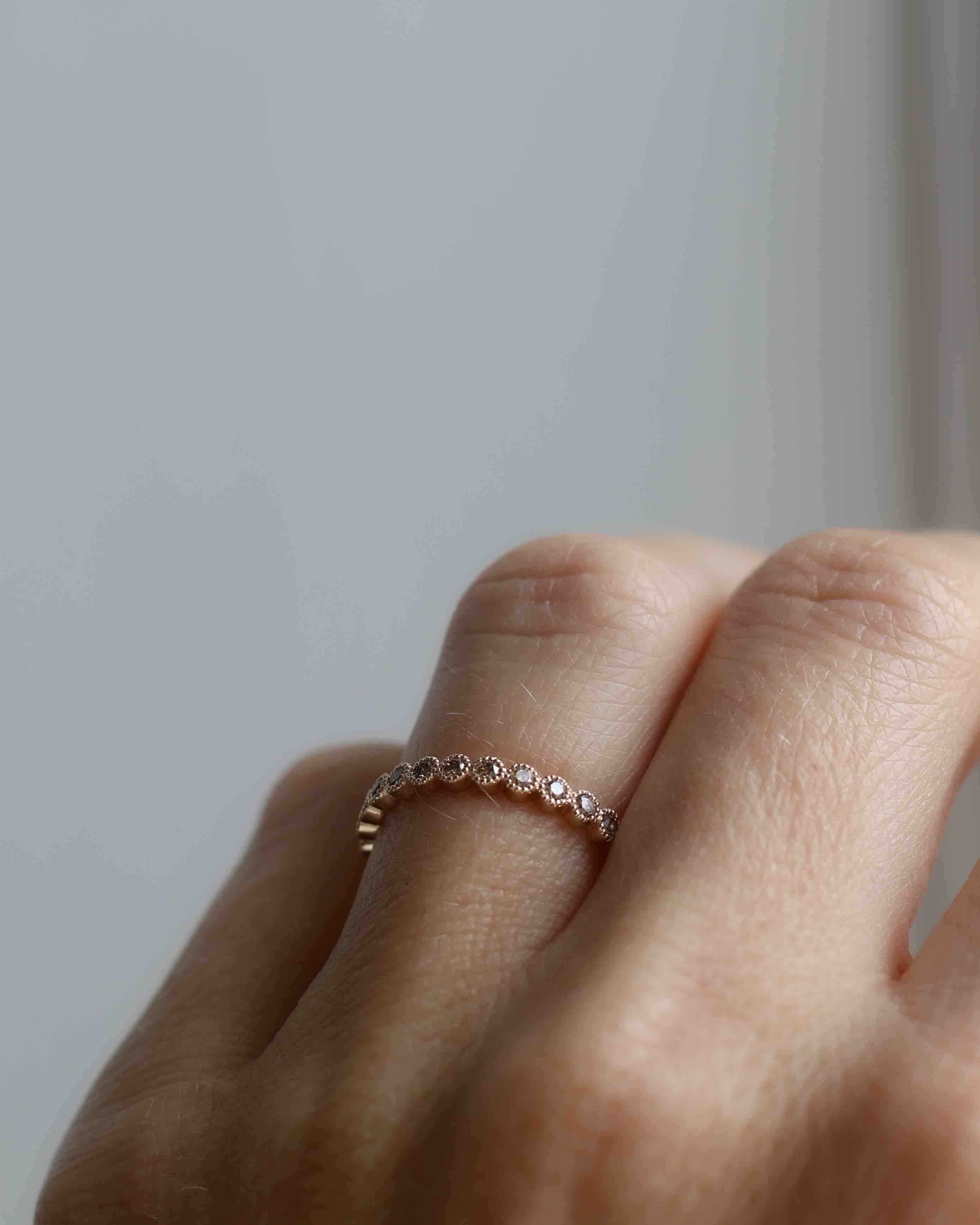 Astrid är ett evighetsband med ett unik skimmer, tack vare de små guldprickarna, milligriffen. Milligriff var en vanlig dekor på smycken i början av förra sekelskiftet (18/1900).
