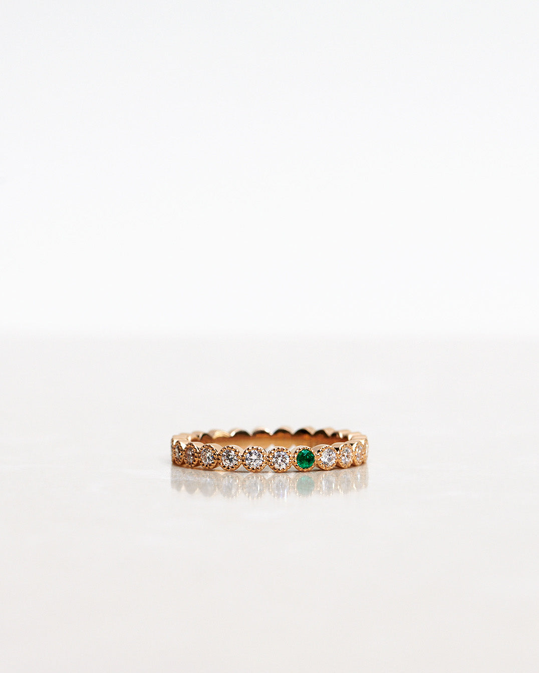 Ringen består av 0.02 CT diamanter hela vägen runt, och en kontrasterande grön smaragd