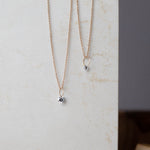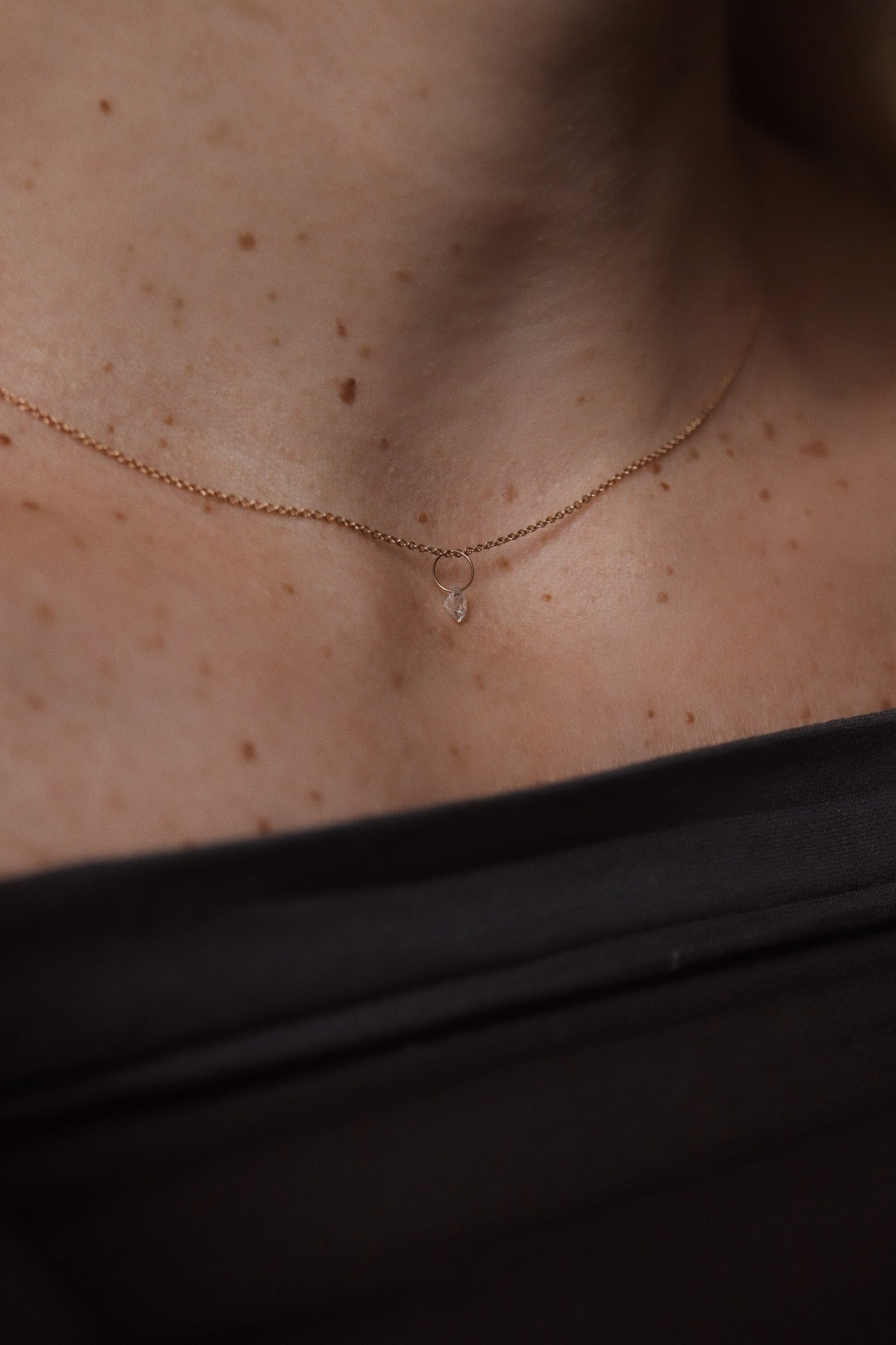 We highly recommend you to add our bare gold chain to your order, as it is very minimal and truly complements this super minimalistic diamond pendant!