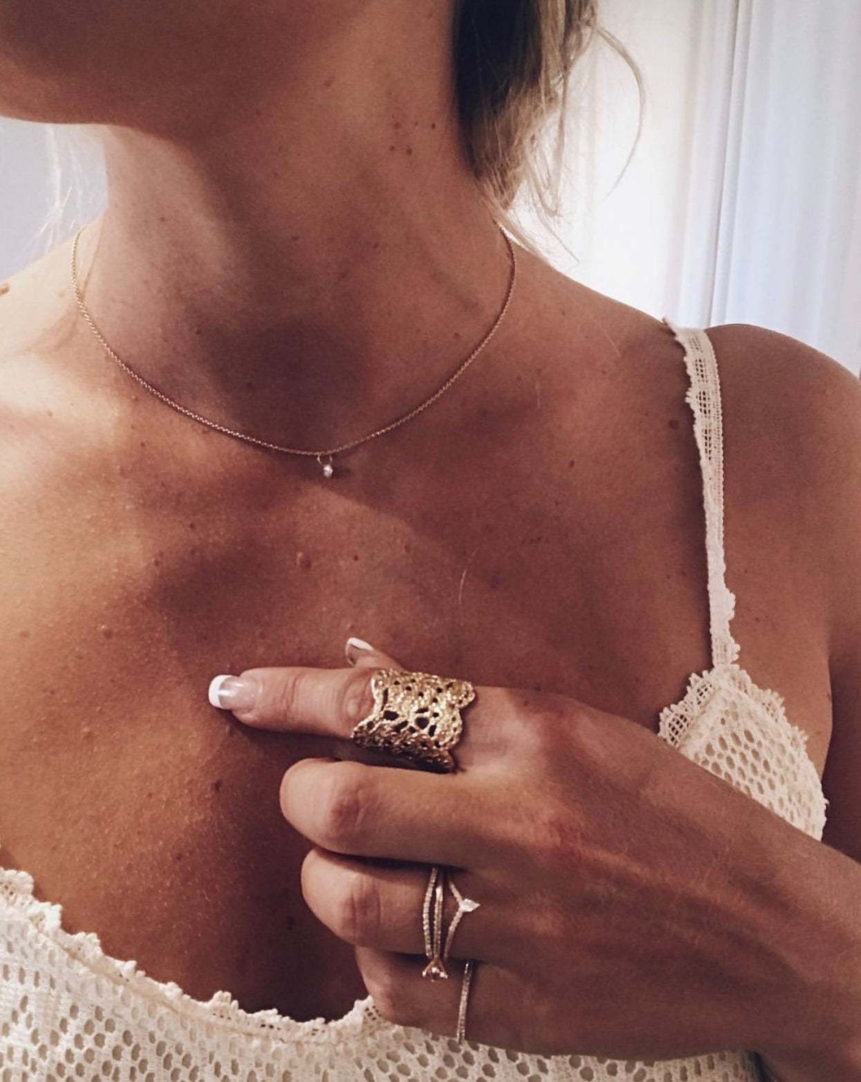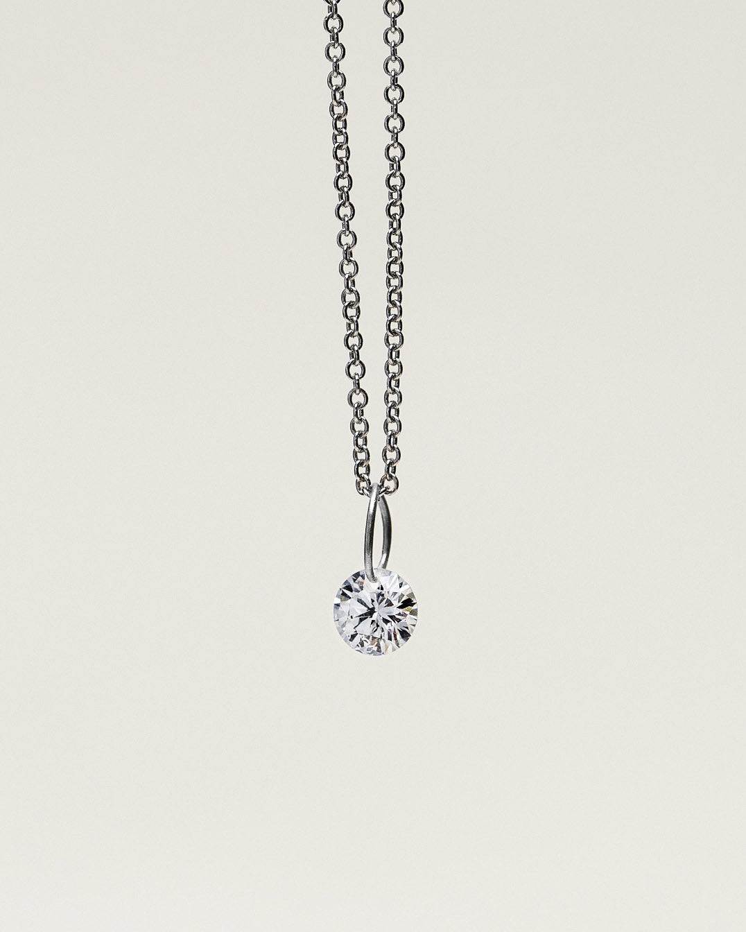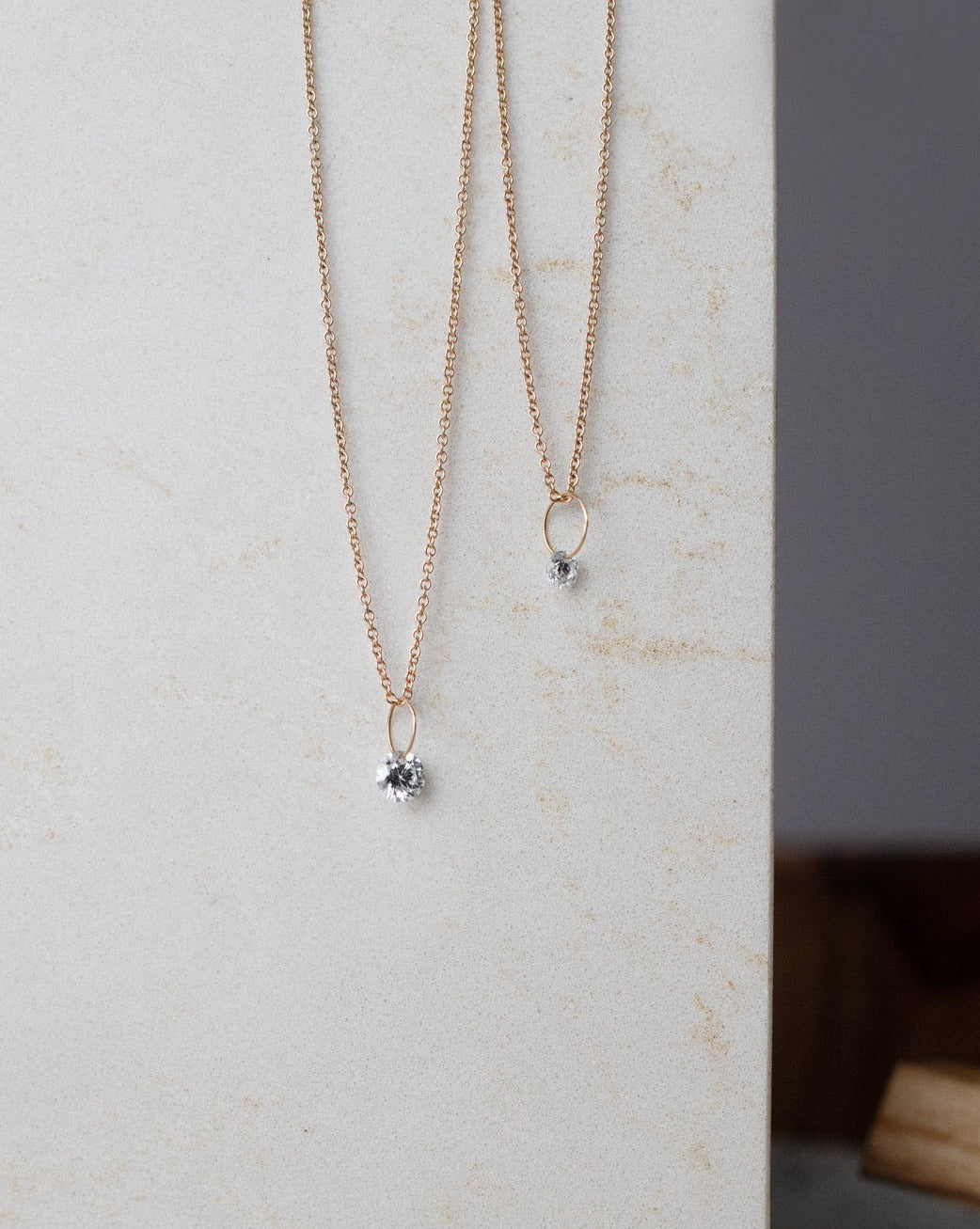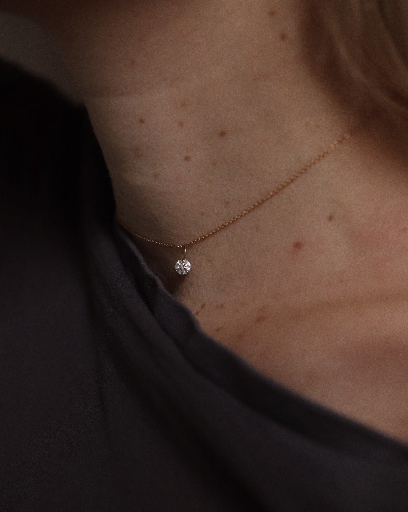 If wearing on a chain you already have: the loop of the pendant is 4 mm, so it should be able to be worn on any necklace chain you have at home. We recommend wearing the pendant on a very thin chain like this one, so it appears as if the diamond is floating on your bare skin.