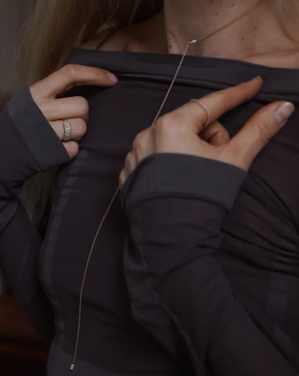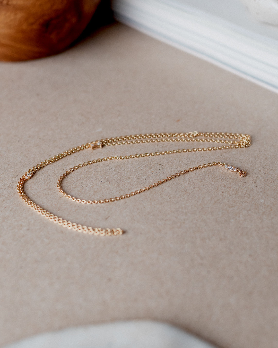 The small brilliant diamonds are spread out along the chain, creating a subtle sparkle around your neck. The baguette diamond hangs freely at the end of the chain, to be worn on the outside or inside of your clothes.
