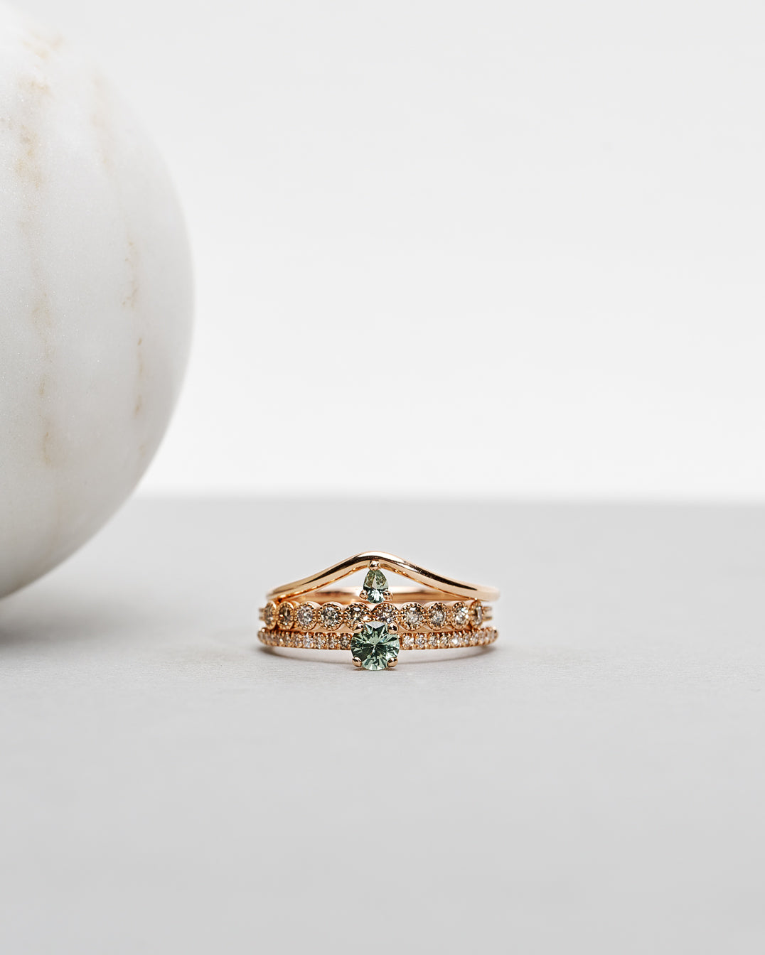 The Lily Fallen Drop Ring is a unique design with a gemstone in the shape of a drop. In this rose gold version of the ring we've used a rare olive green sapphire drop that "falls" from the top.