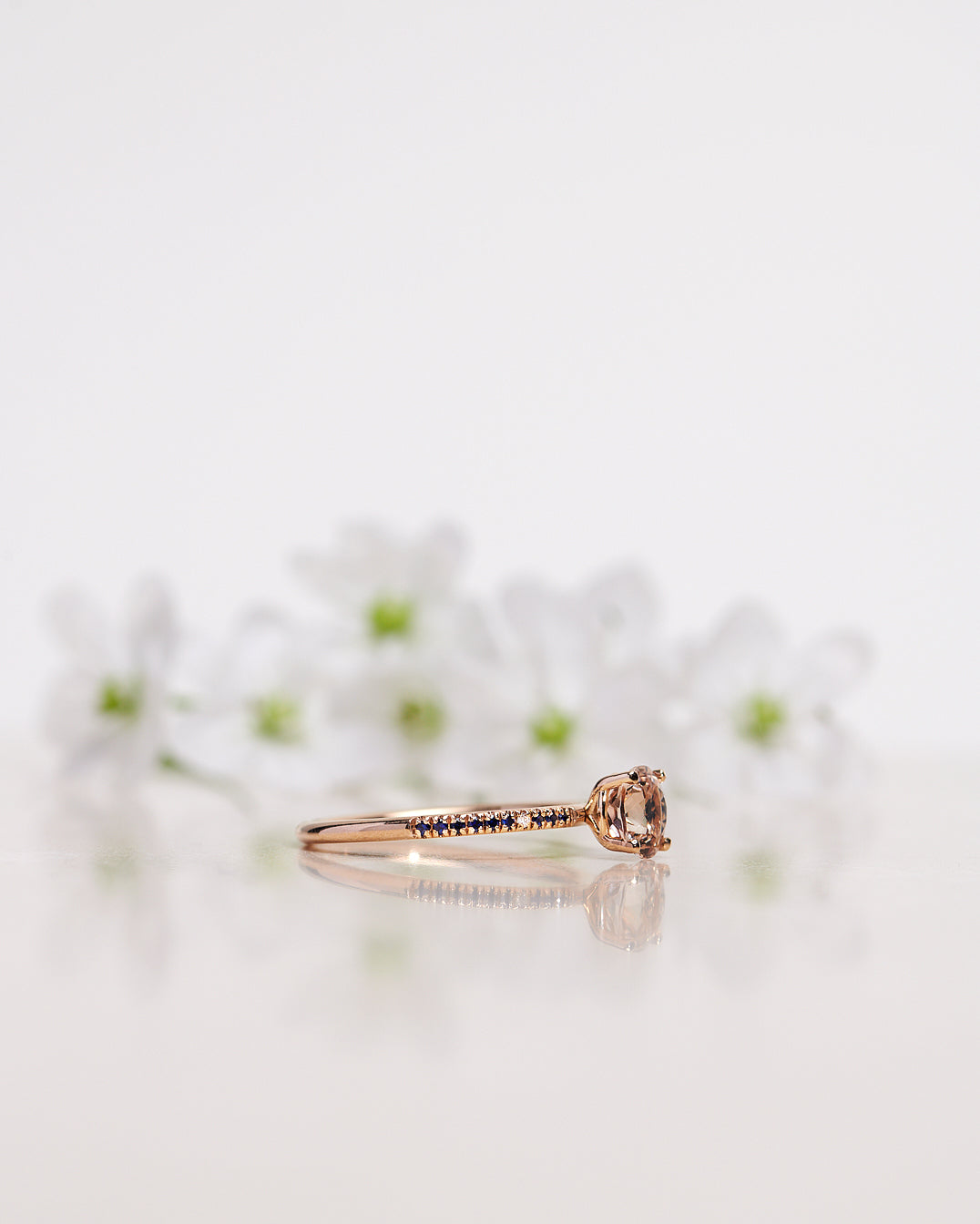 - Low Classic Solitaire Sparkle Ring with Champagne Morganite and Dark Blue Sapphires