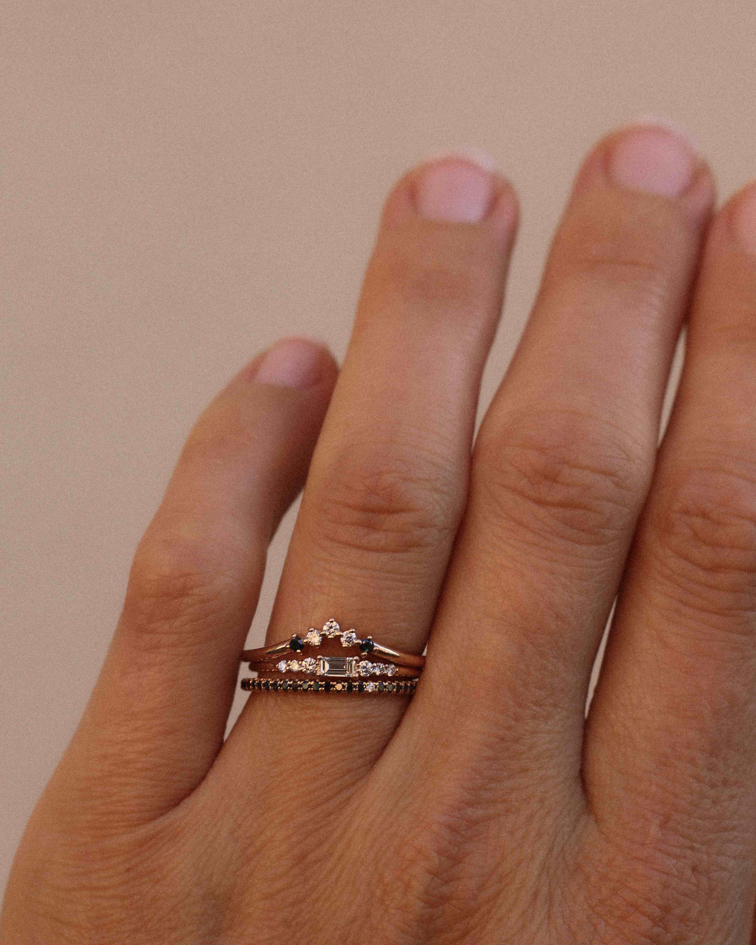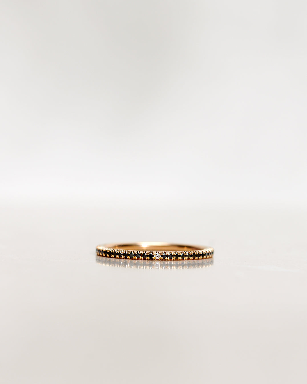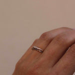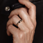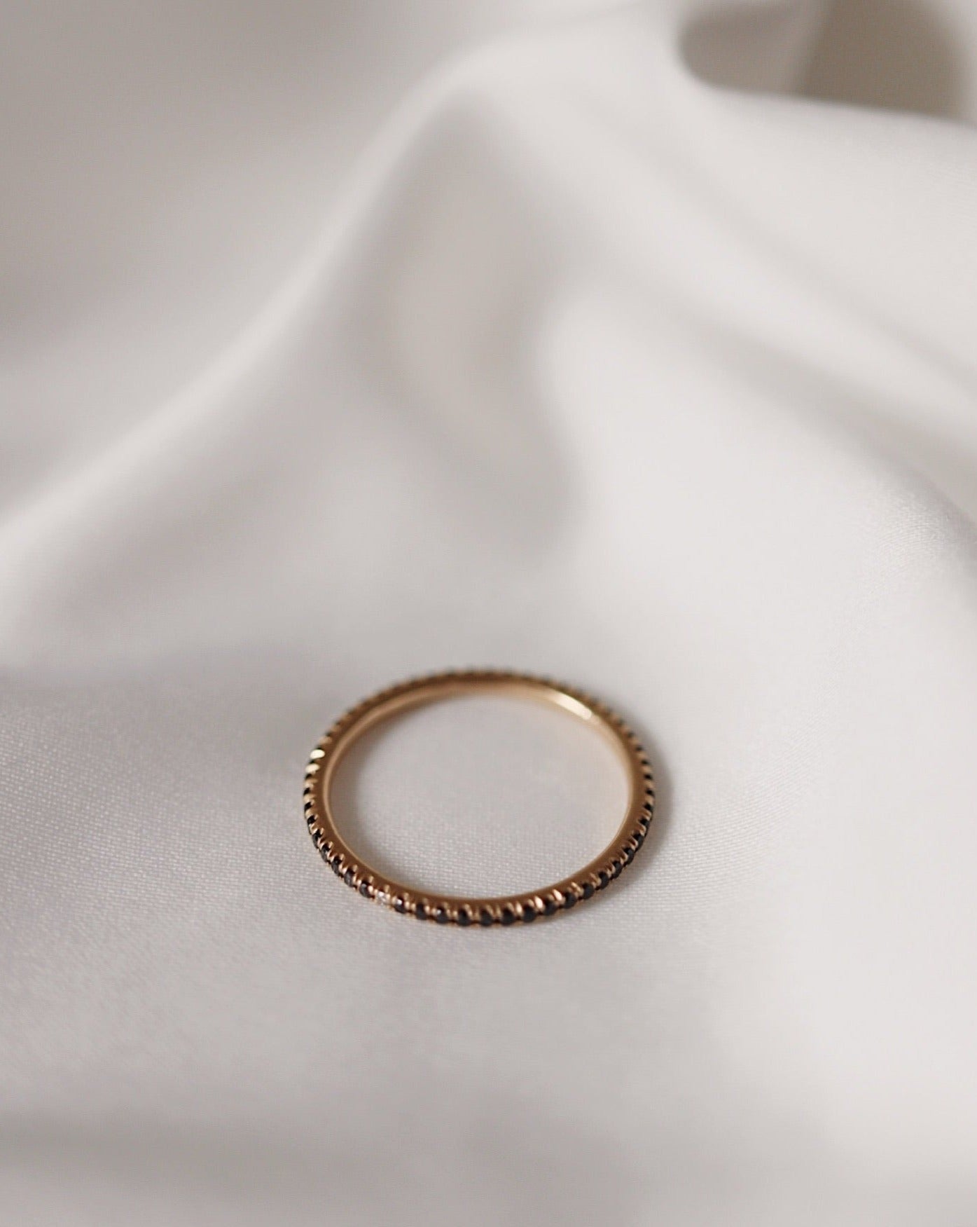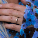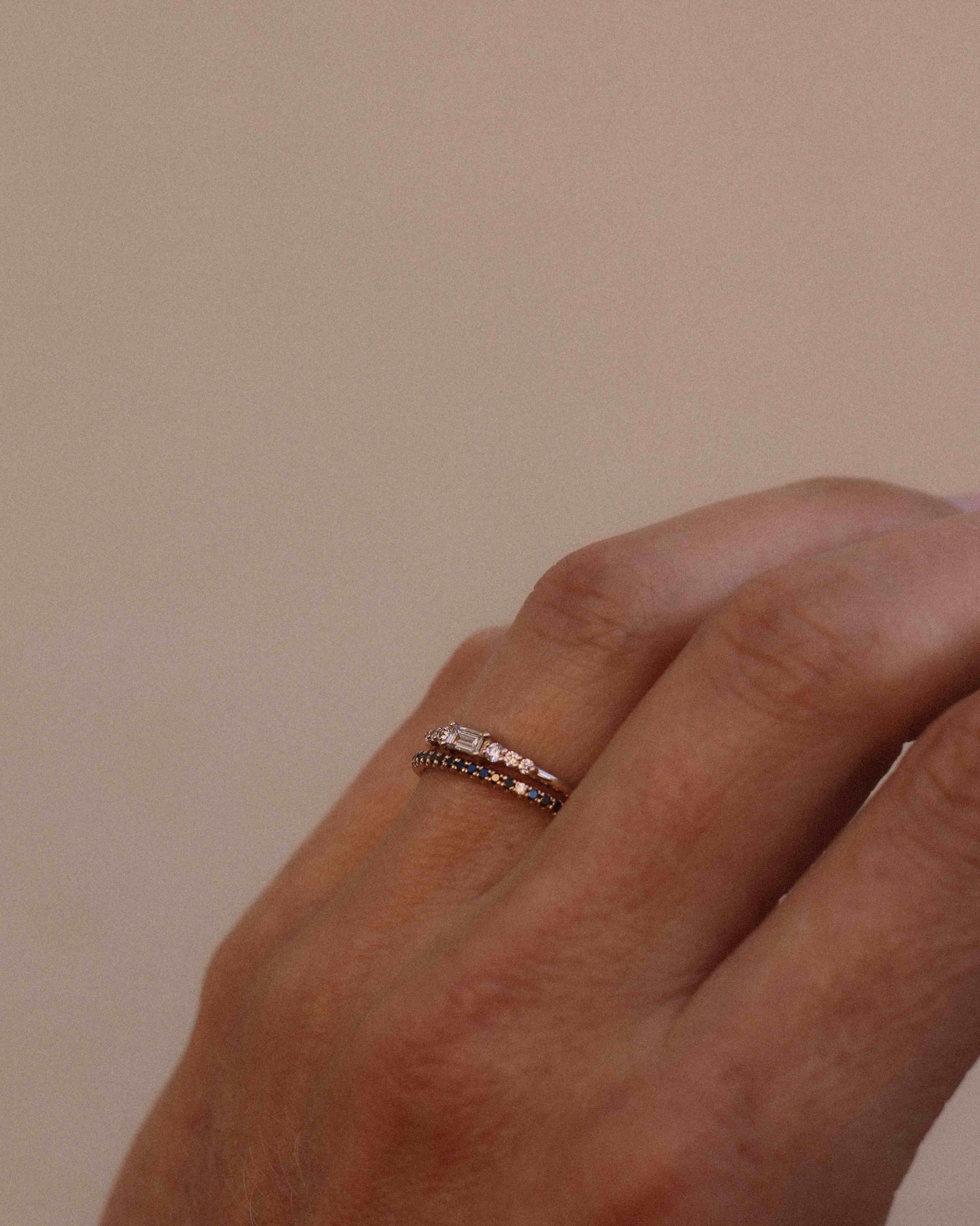 Ädelstenarna är fattade i en infattning där så lite guld som möjligt syns ovanifrån - nästan som att de svävar som ett glitterband över fingret. Det ger ringen en extra nätt och minimalistisk känsla!