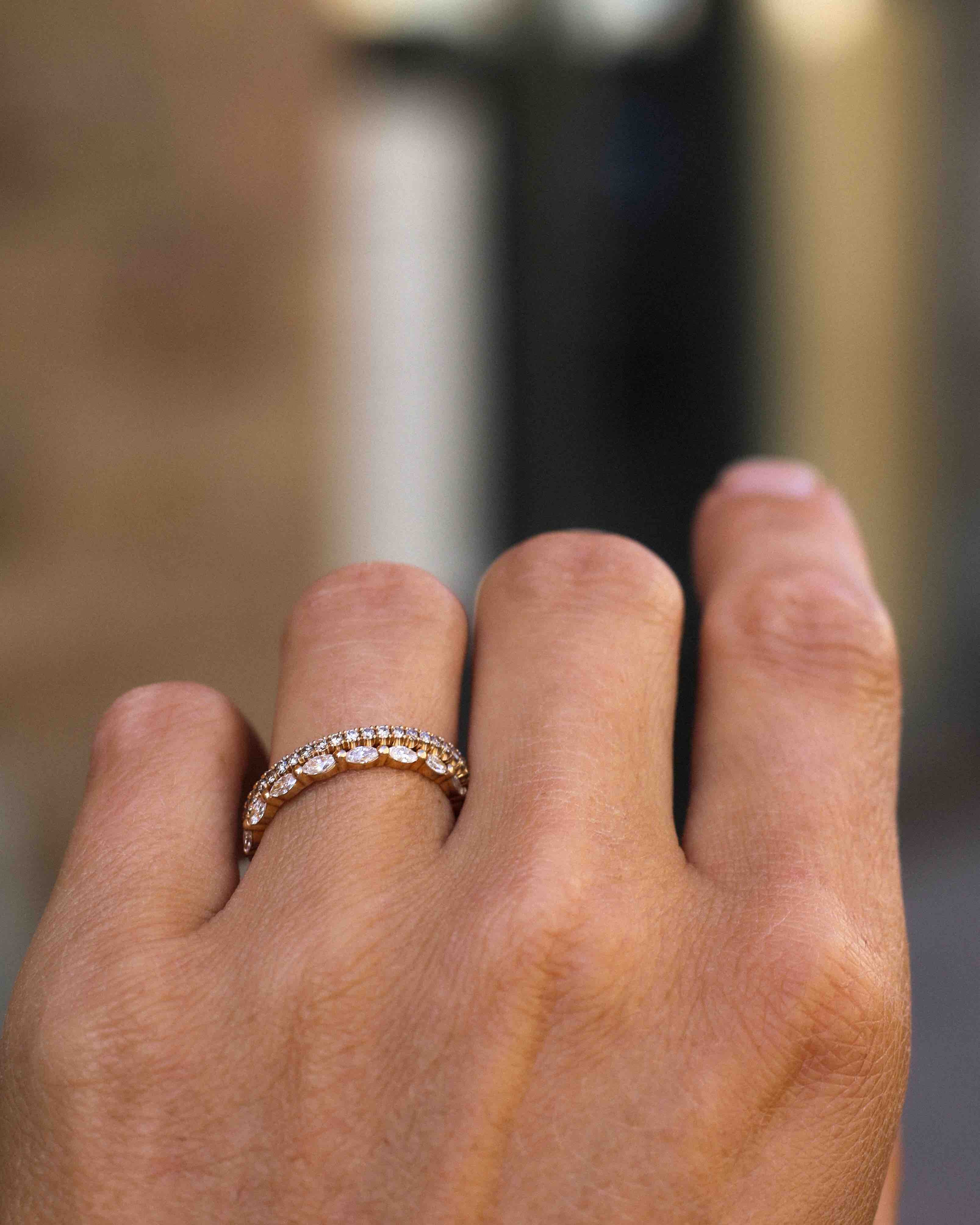 The ring on the picture is in size 17,25/54 and is fully covered with 45 diamonds, in total 0.45 CT.