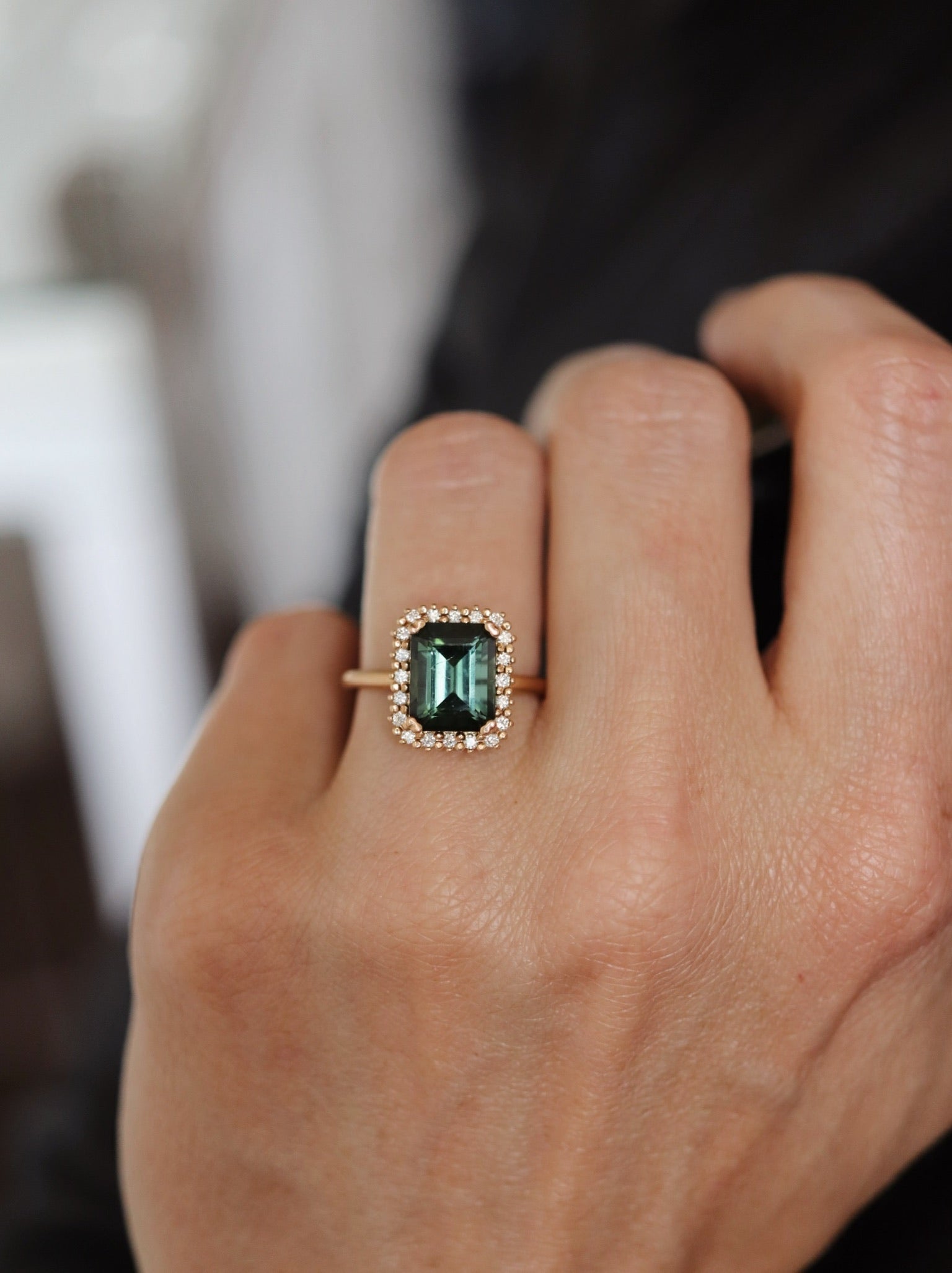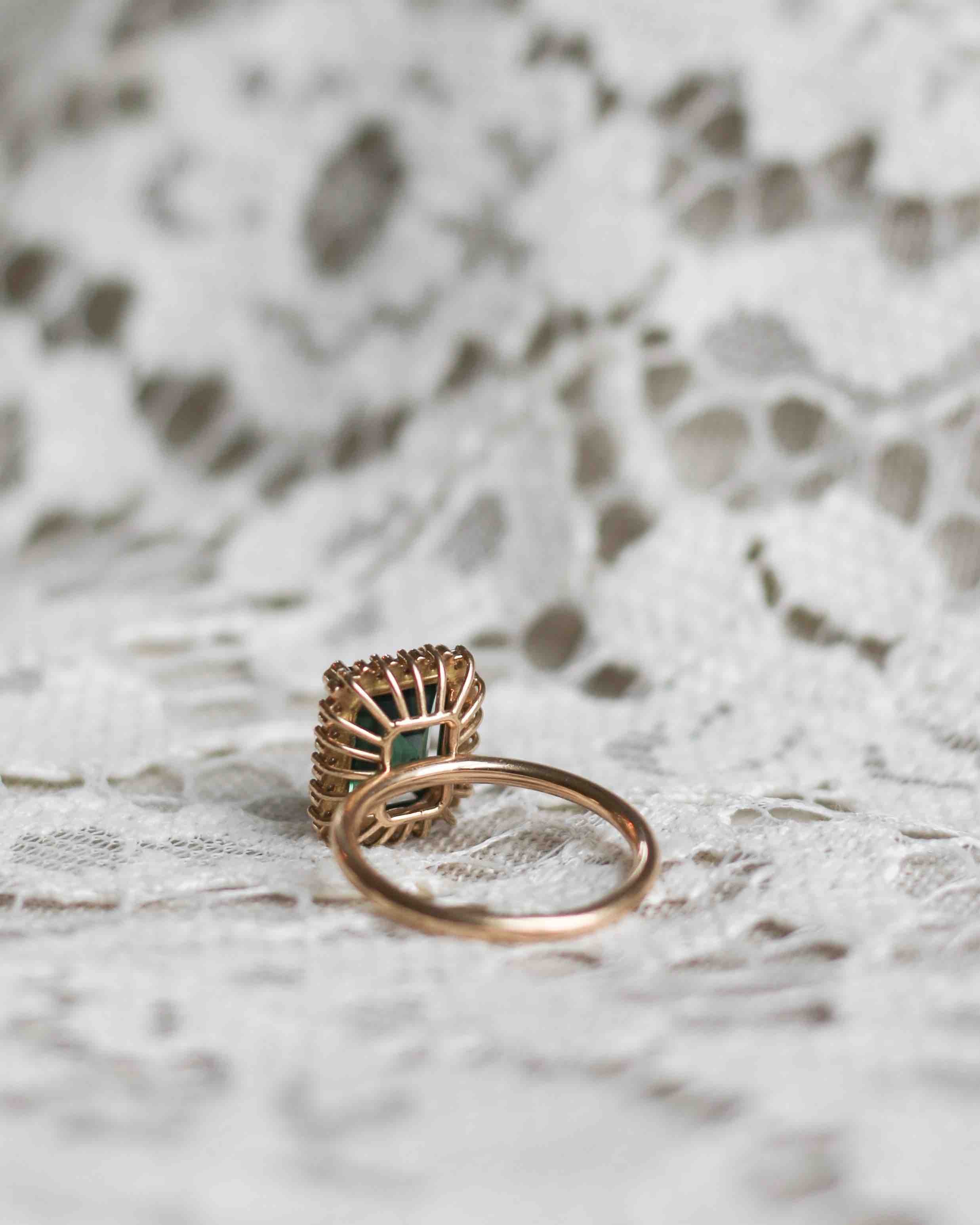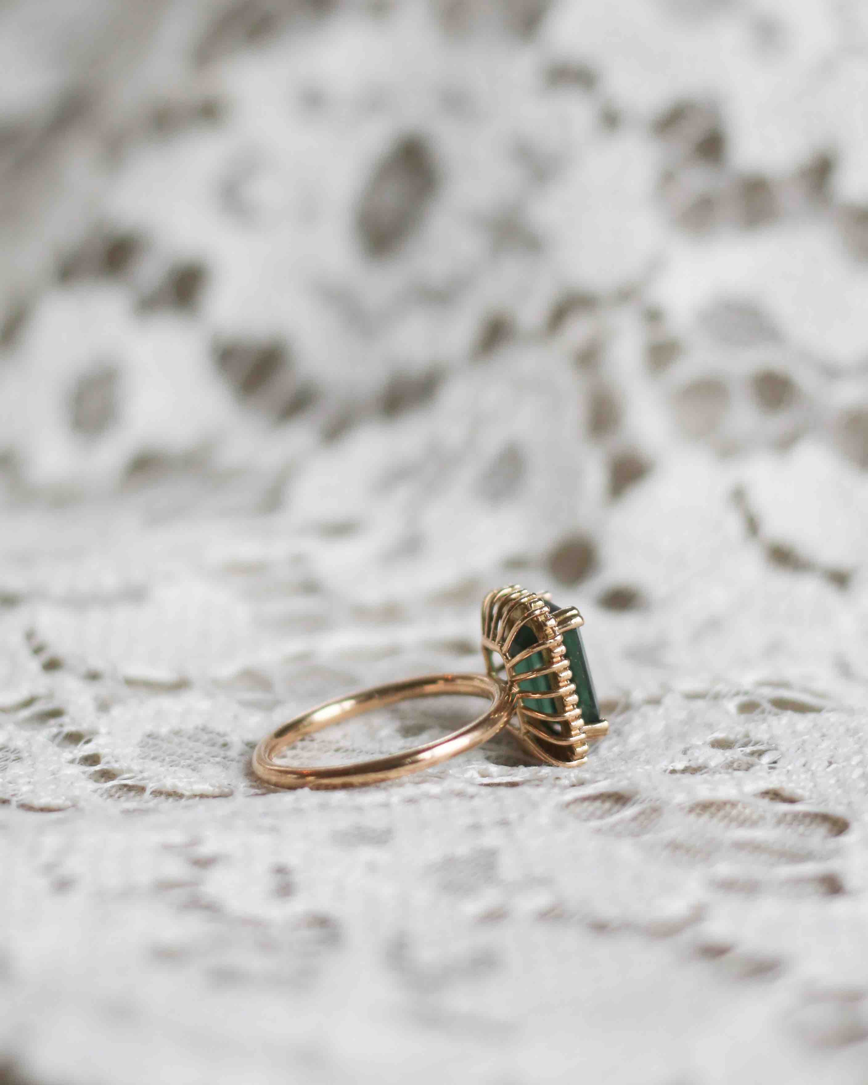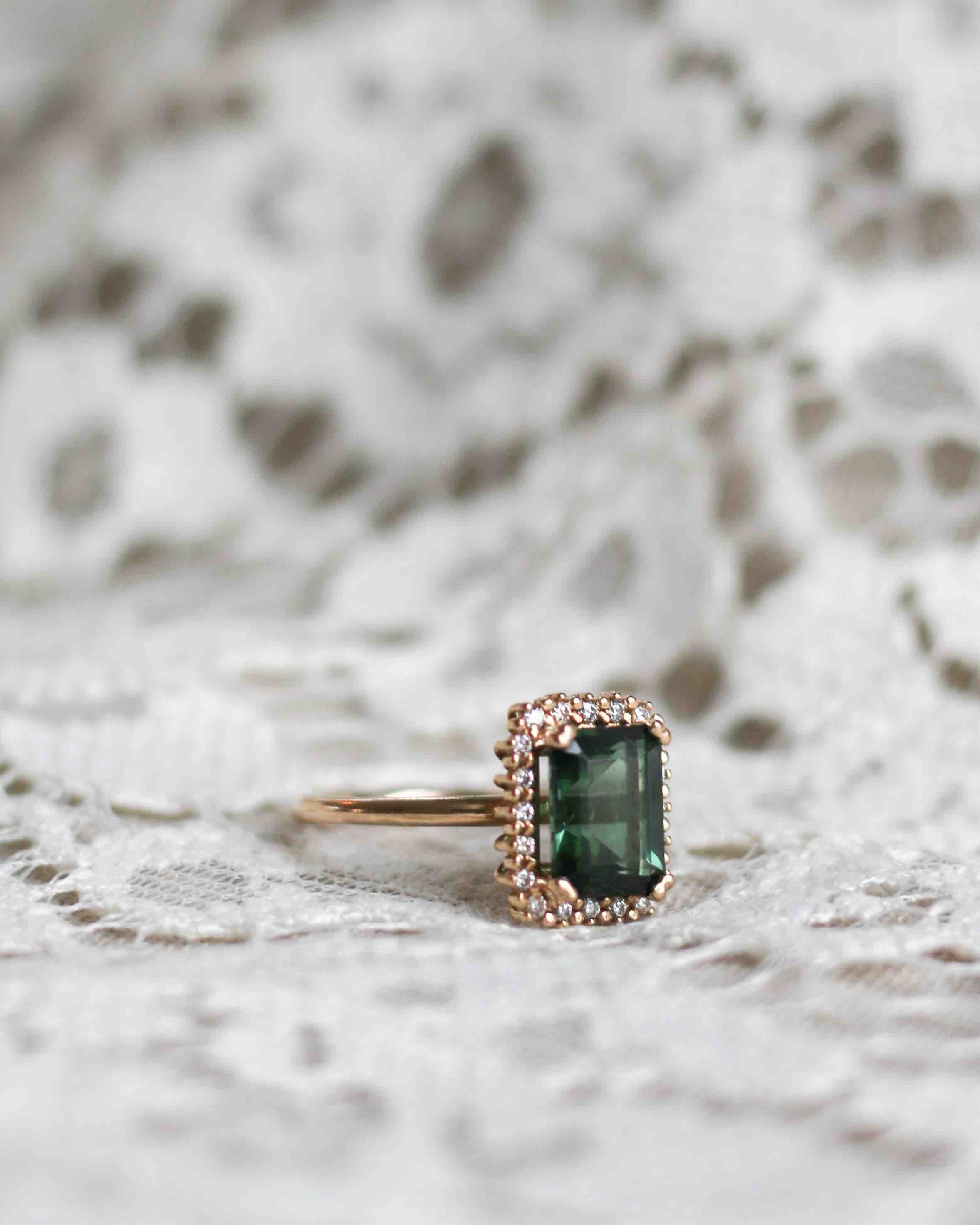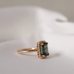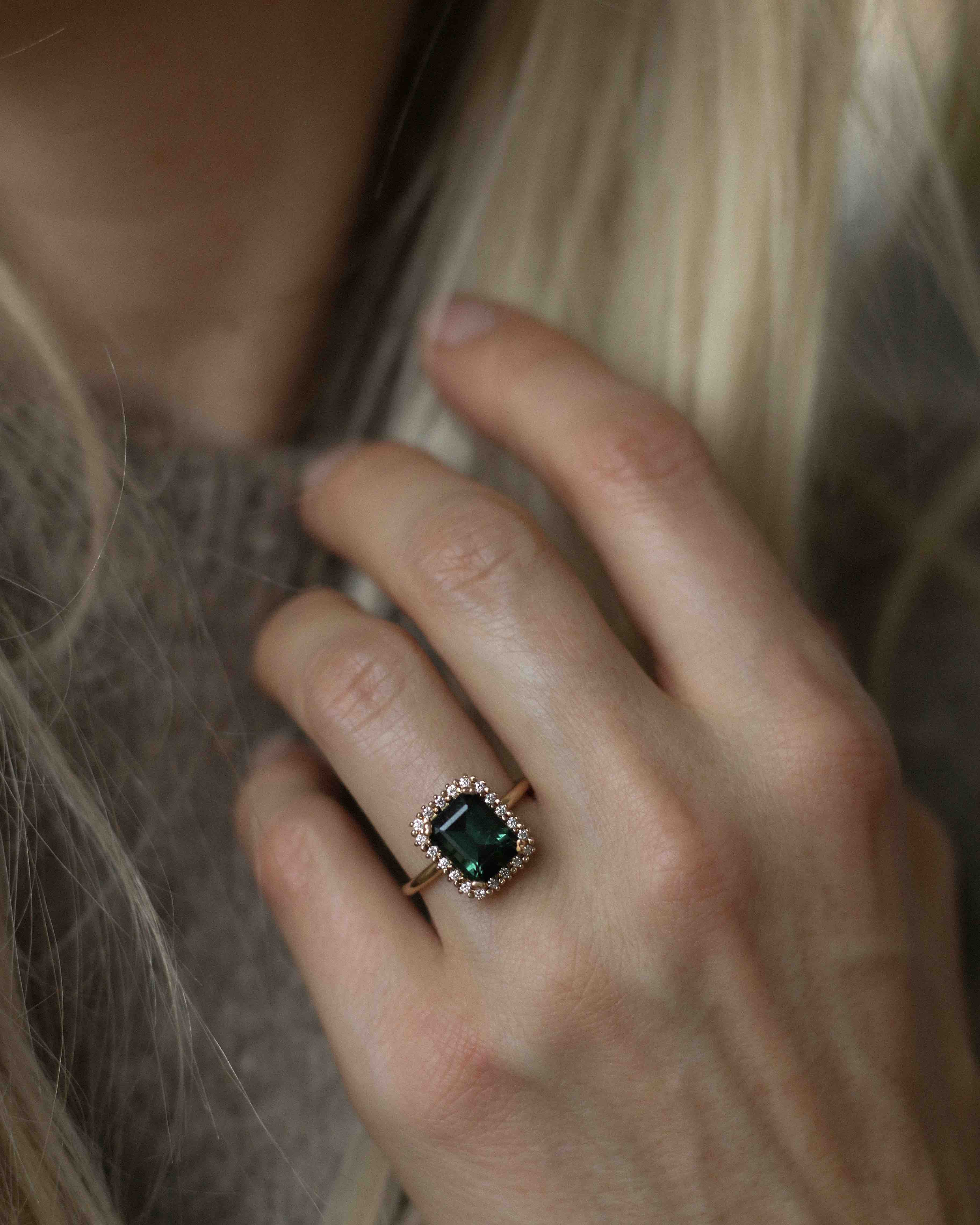 The stunning tourmaline used in this ring is in a perfect shade of dark green and has a beautiful clarity. It has been expertly cut into an exclusive emerald cut.