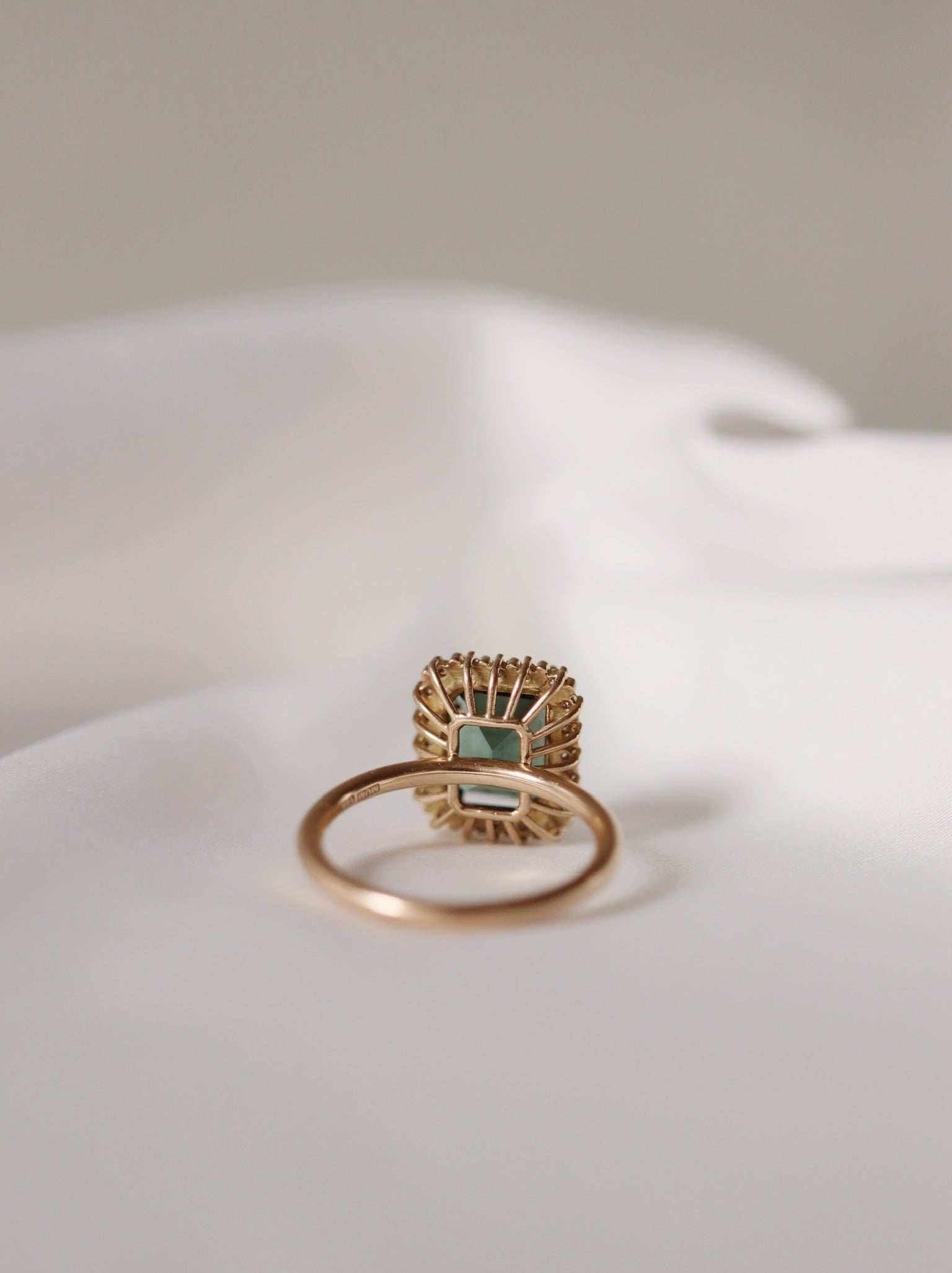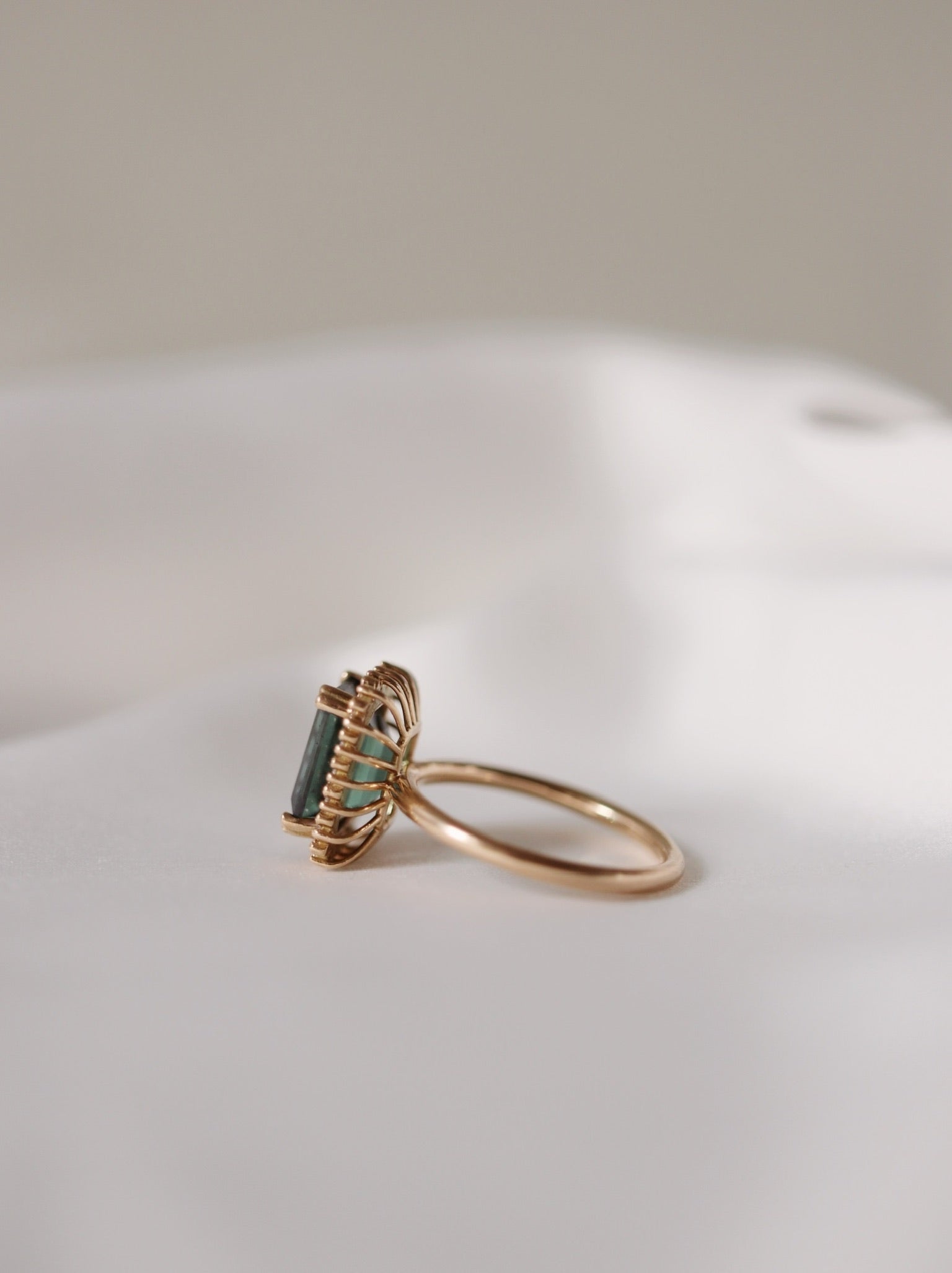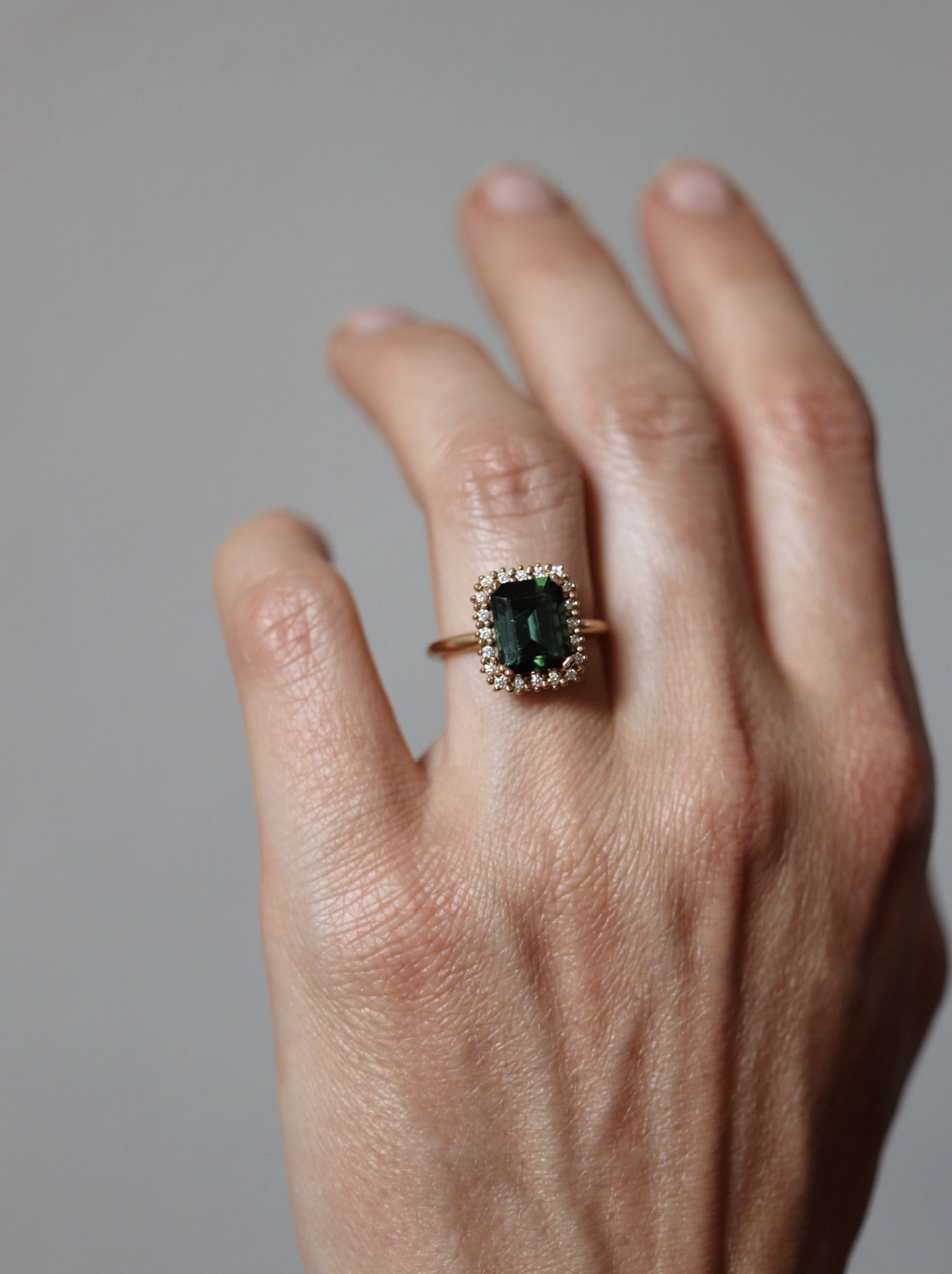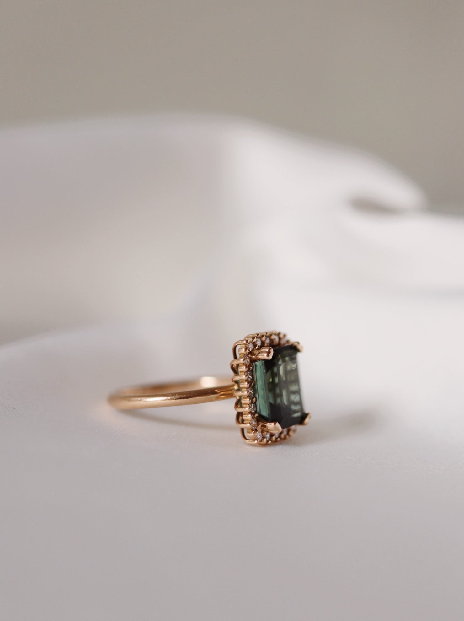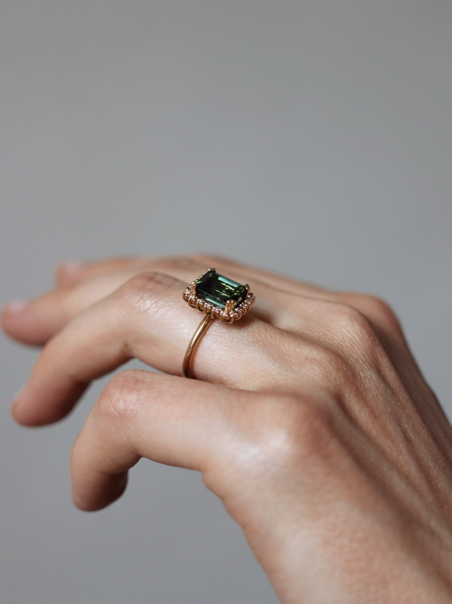 The stunning tourmaline used in this ring is in a perfect shade of dark green and has a beautiful clarity. It has been expertly cut into an exclusive emerald cut.
