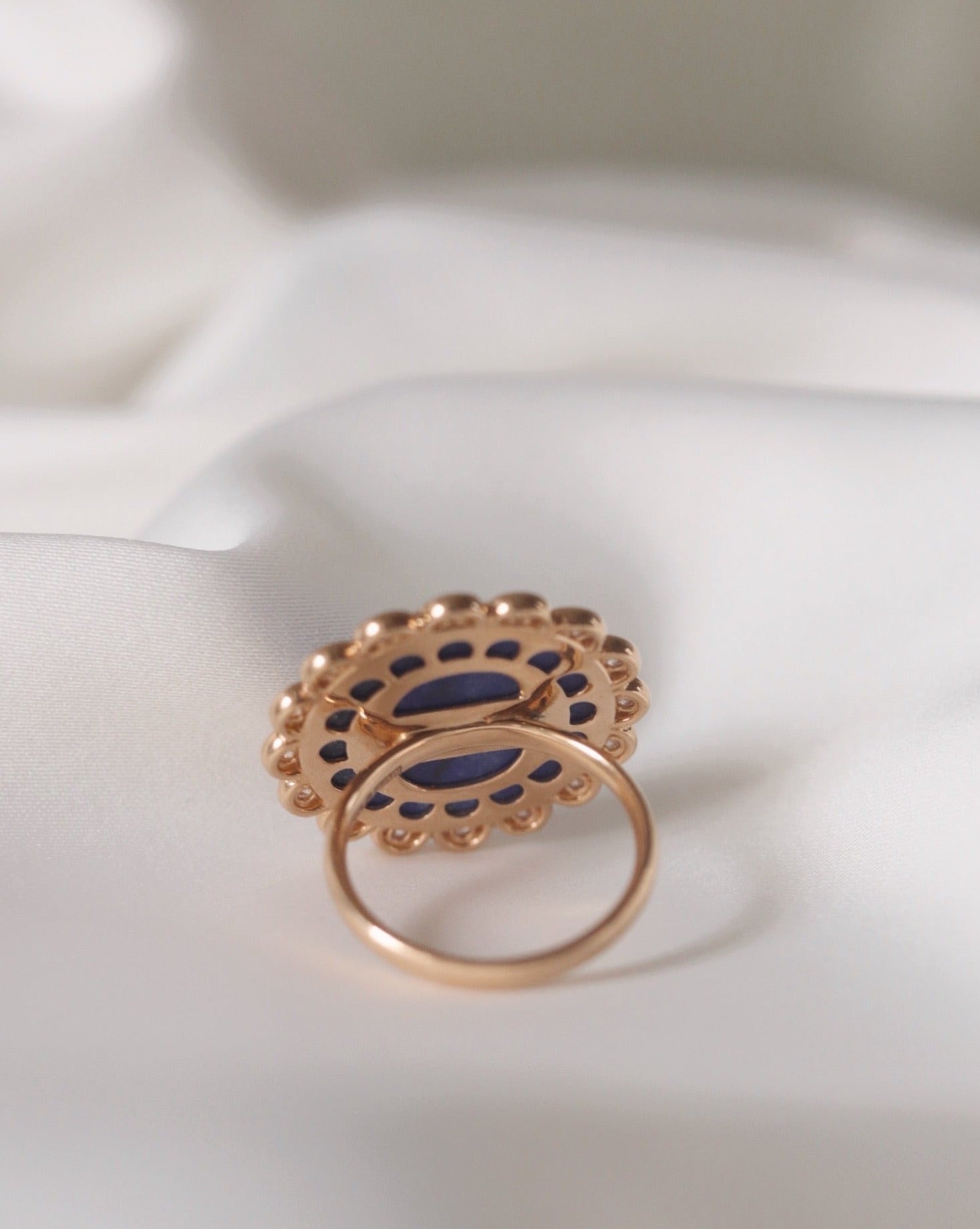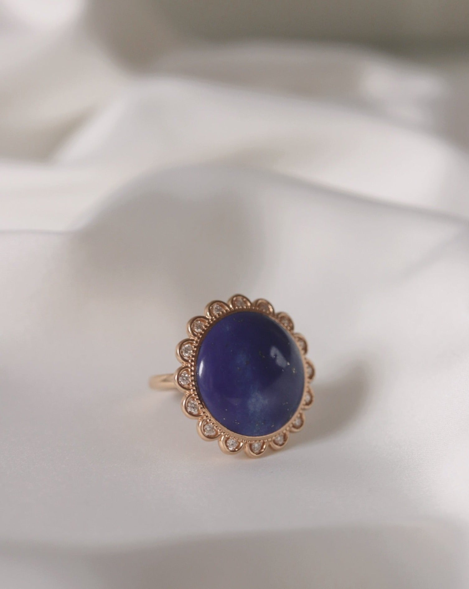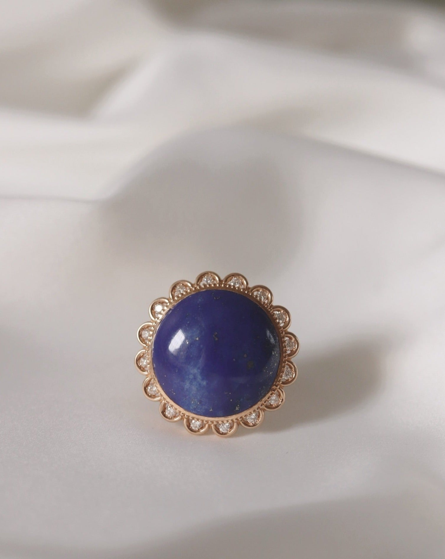 A stunning head-turner with a deep blue natural Lapis Lazuli decorated with a garland of diamonds.