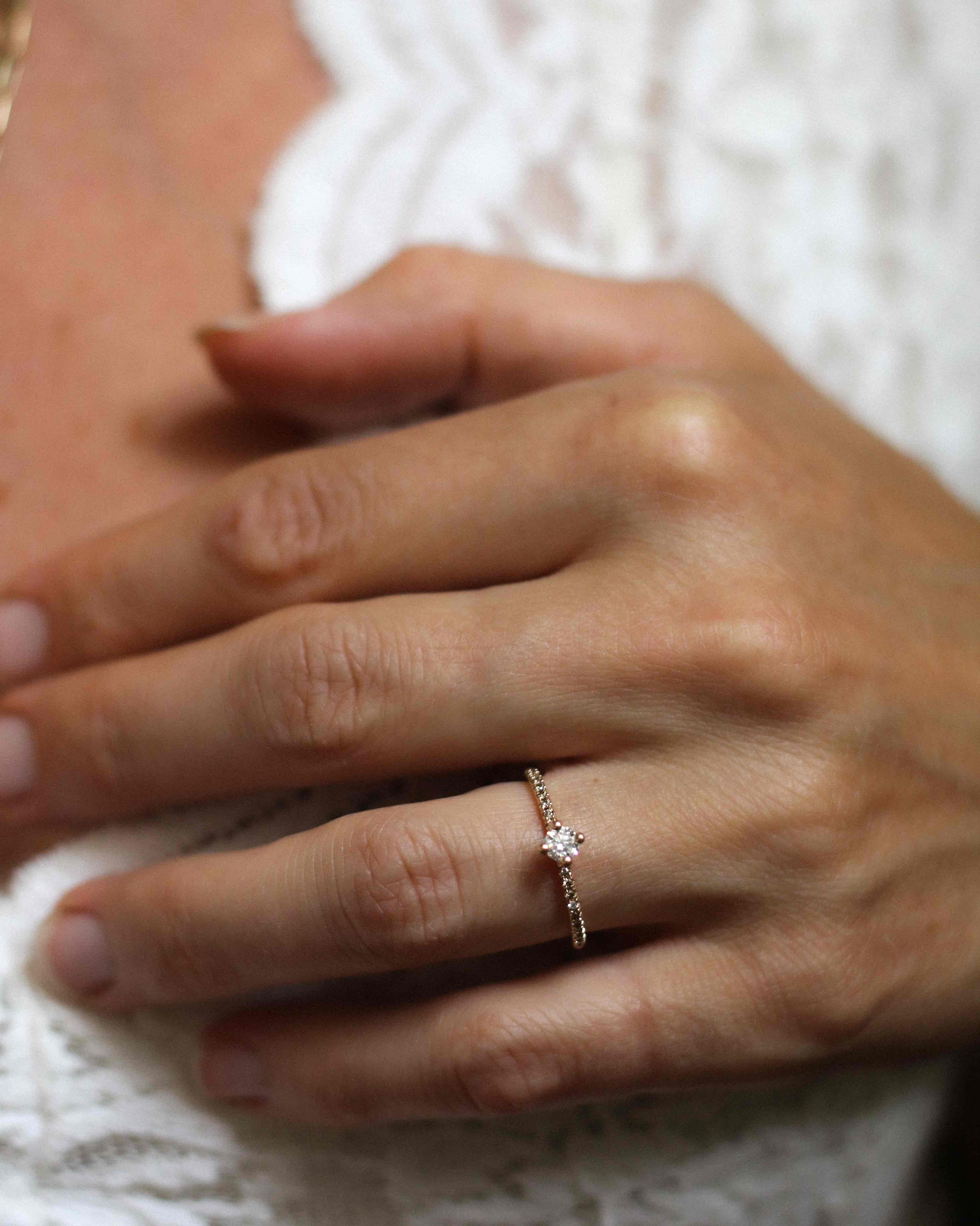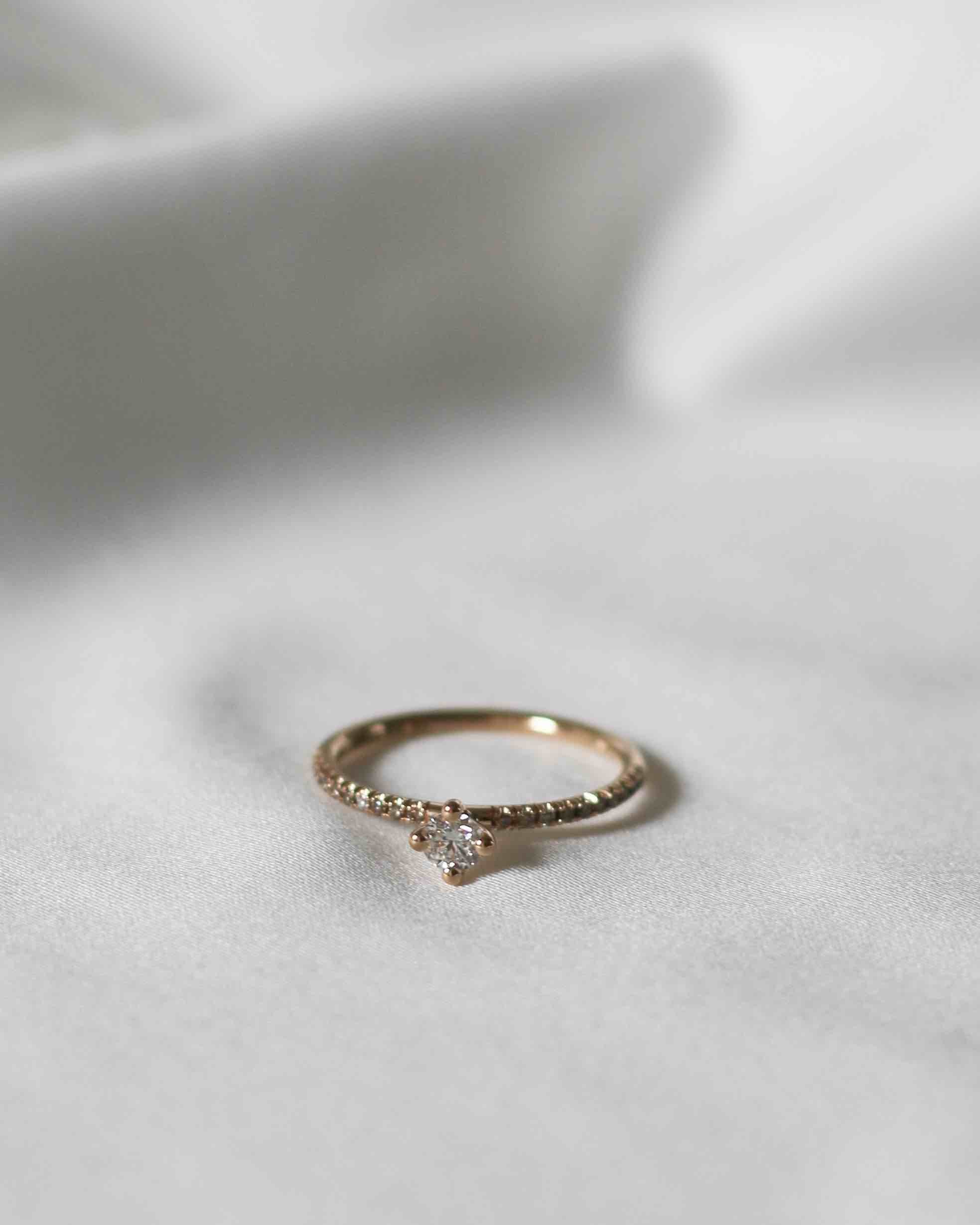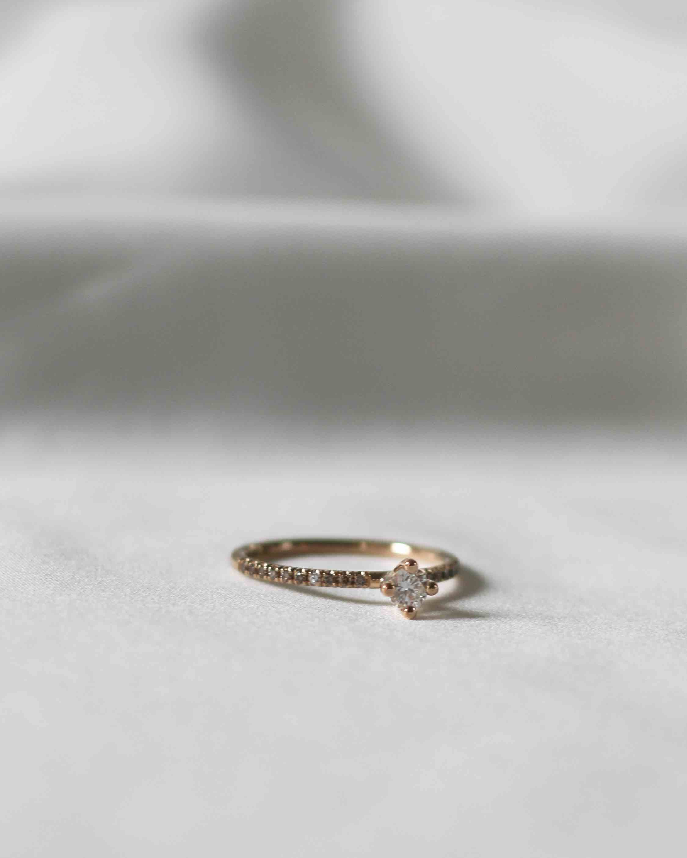 Den färglösa solitärdiamanten är tillräckligt liten för att behålla sin subtila känsla, samtidigt som chokladdiamanterna i ringbandet skapar det perfekta, skimrande bakgrundsglittret.