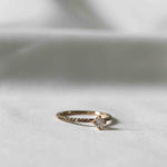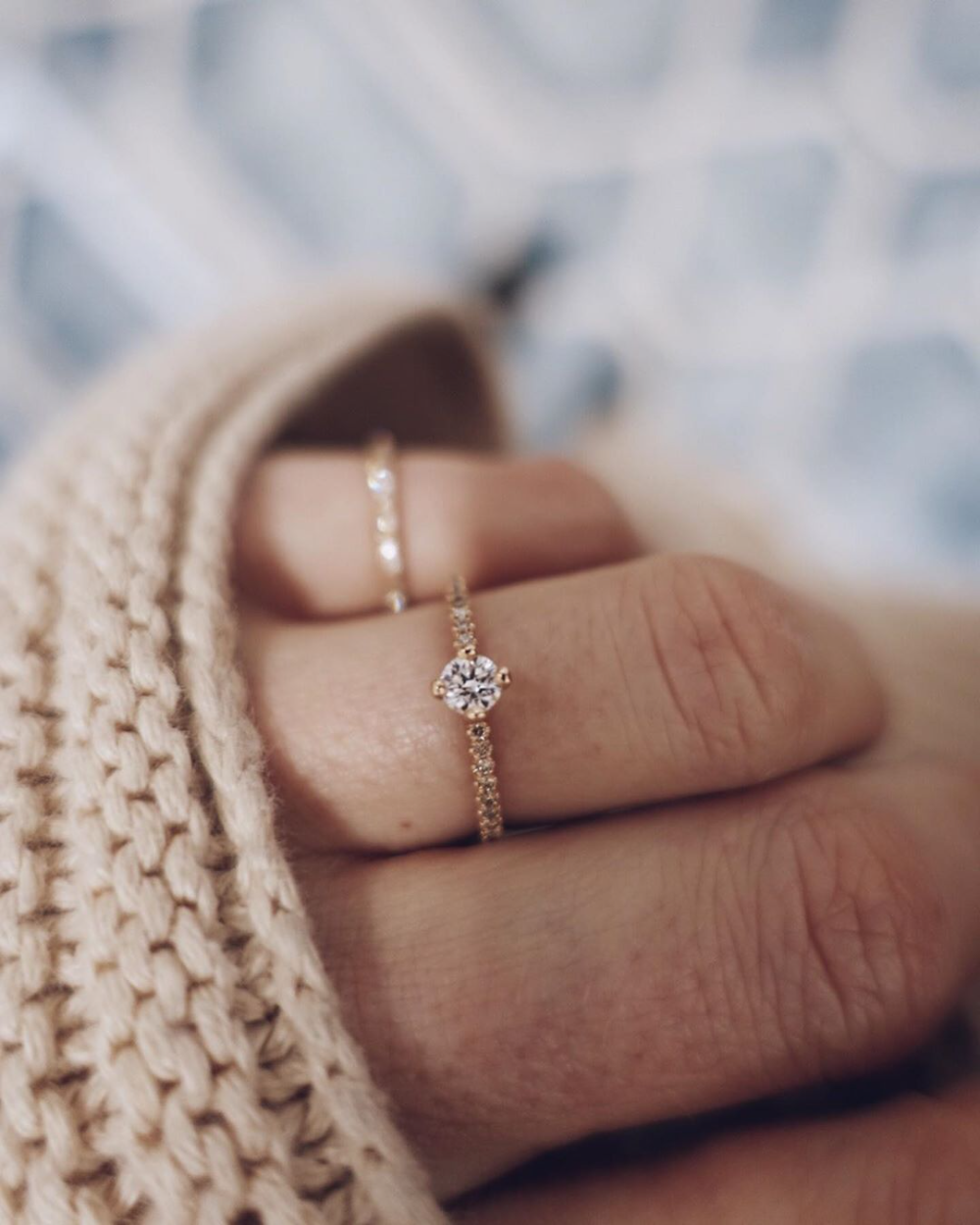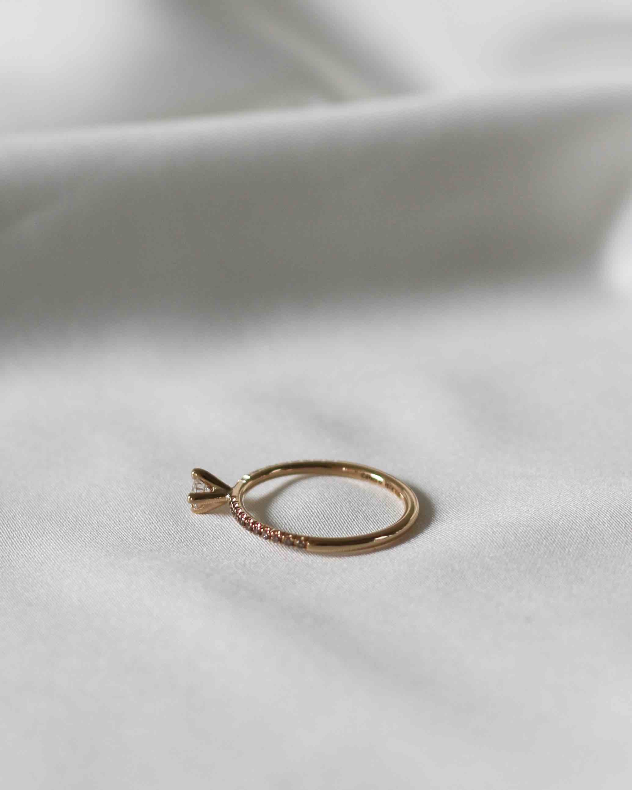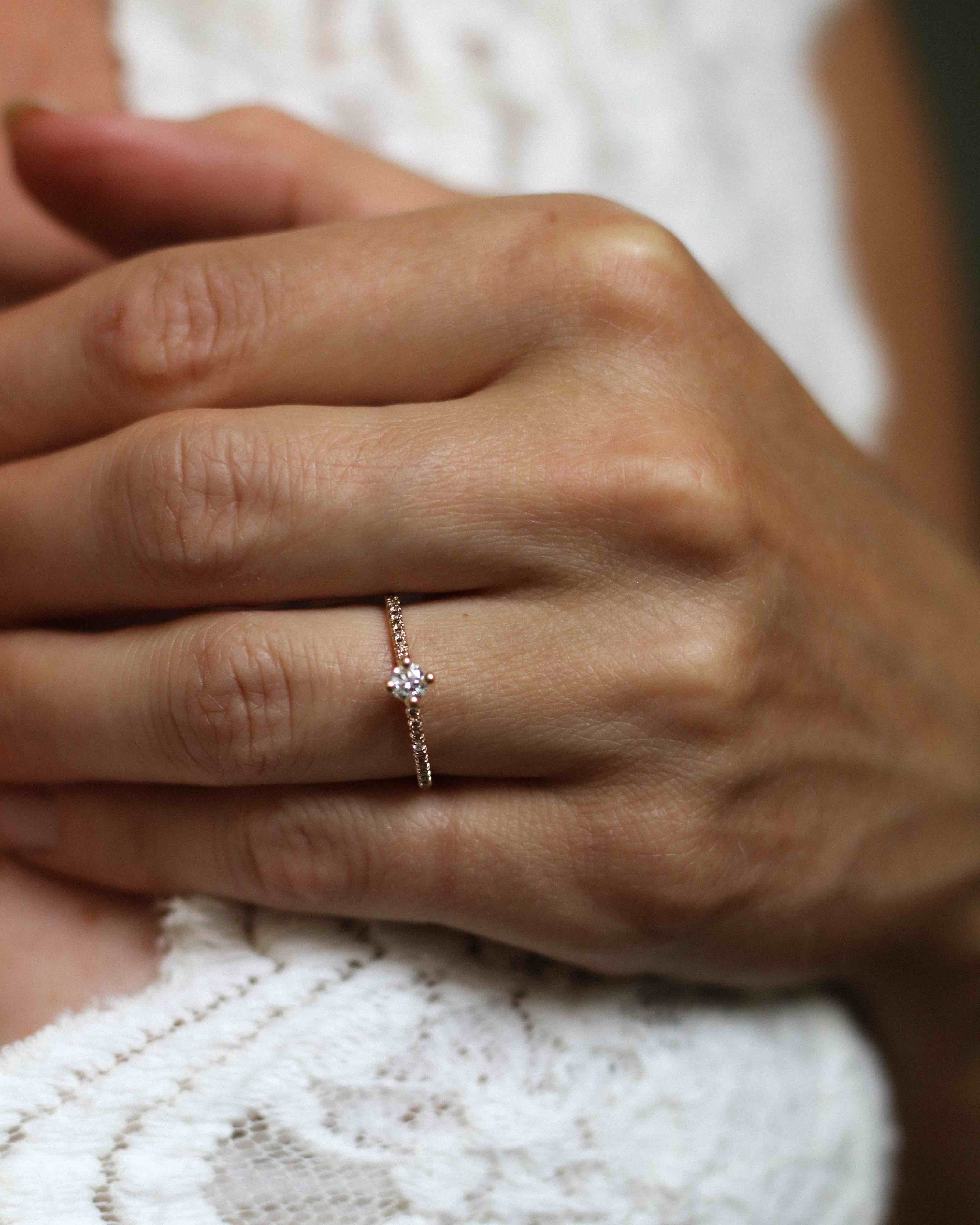 Den färglösa solitärdiamanten är tillräckligt liten för att behålla sin subtila känsla, samtidigt som chokladdiamanterna i ringbandet skapar det perfekta, skimrande bakgrundsglittret.
