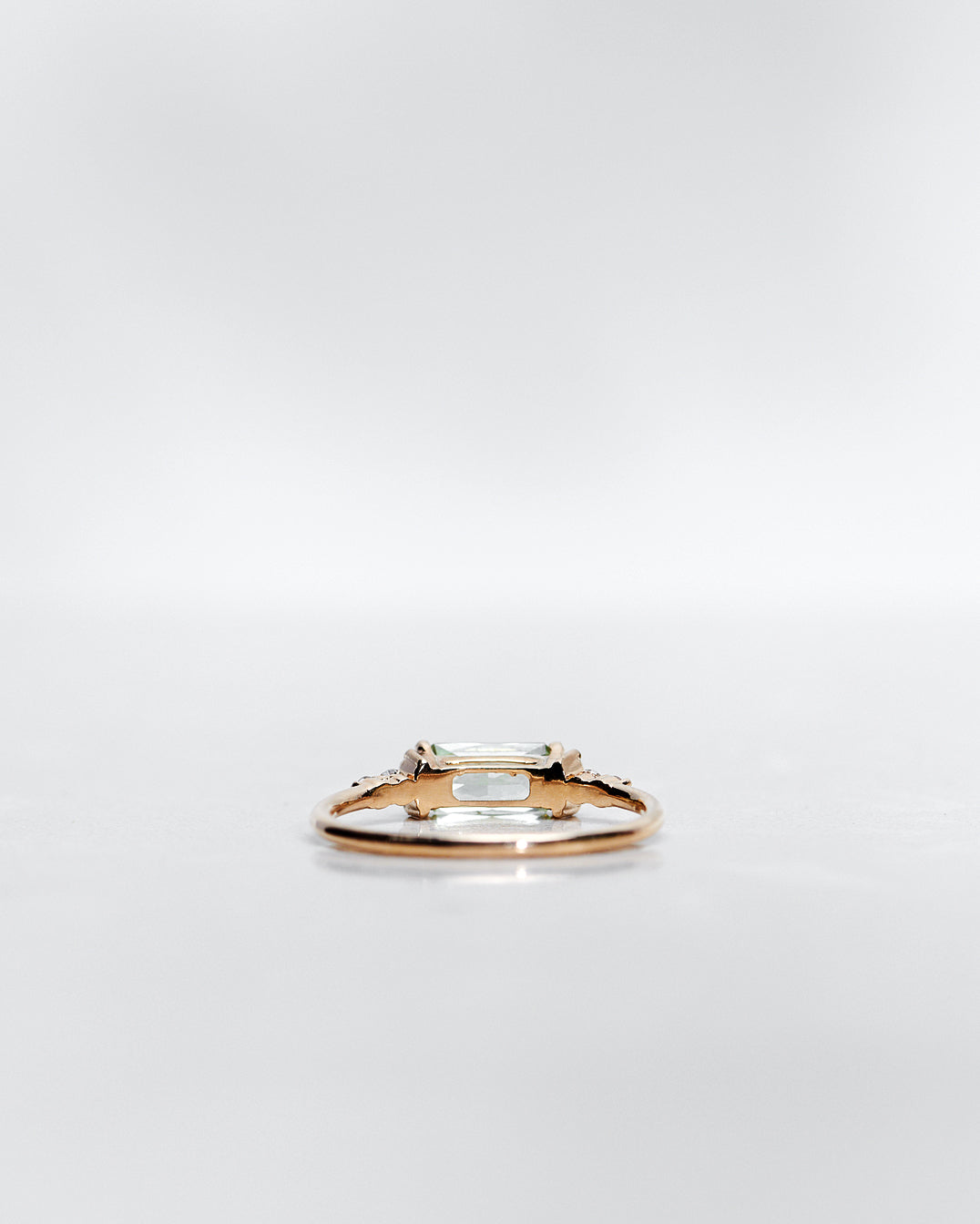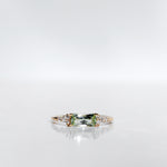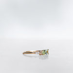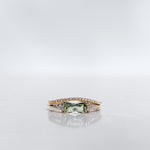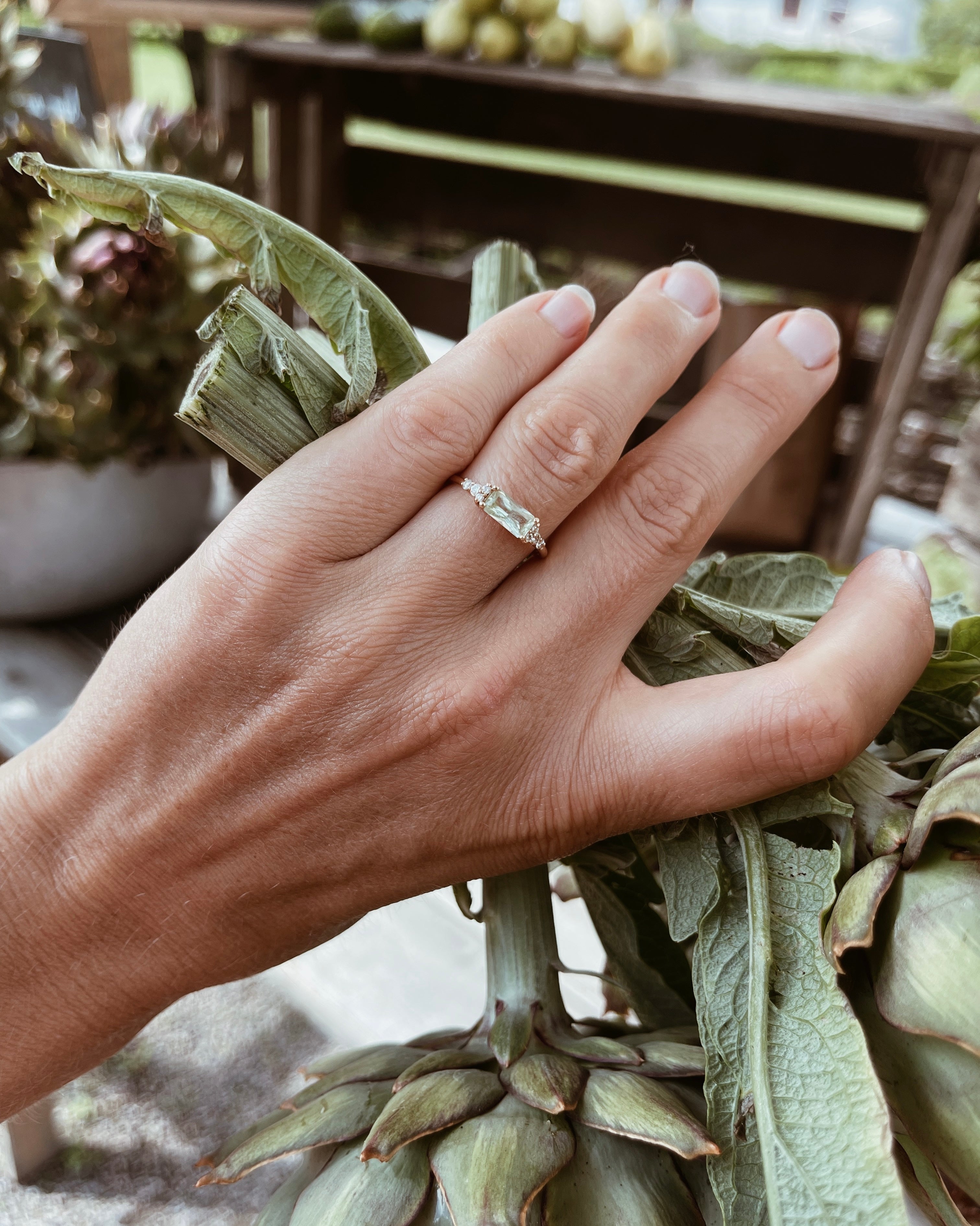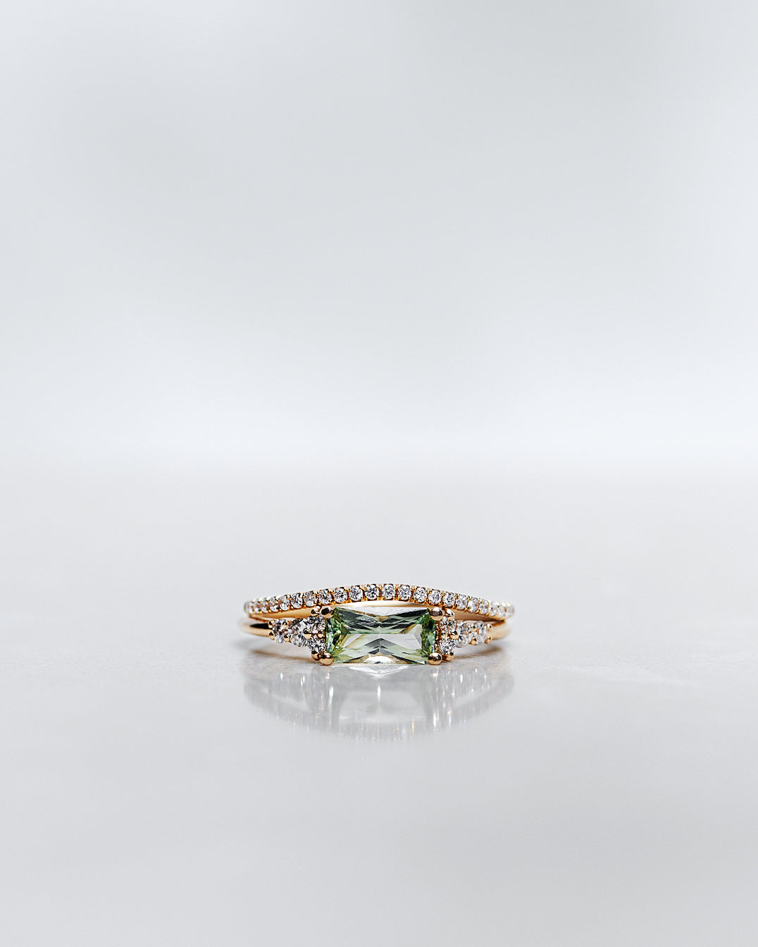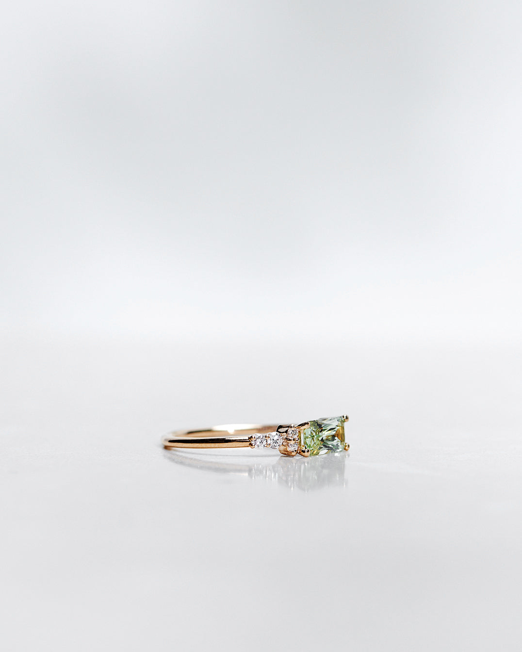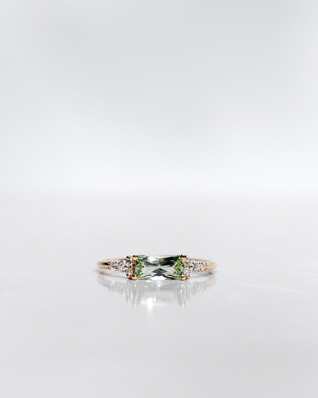A unique, one-of-a-kind cluster ring featuring a natural, light green radiant-cut sapphire and six brilliant diamonds.