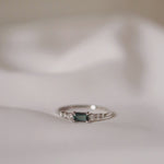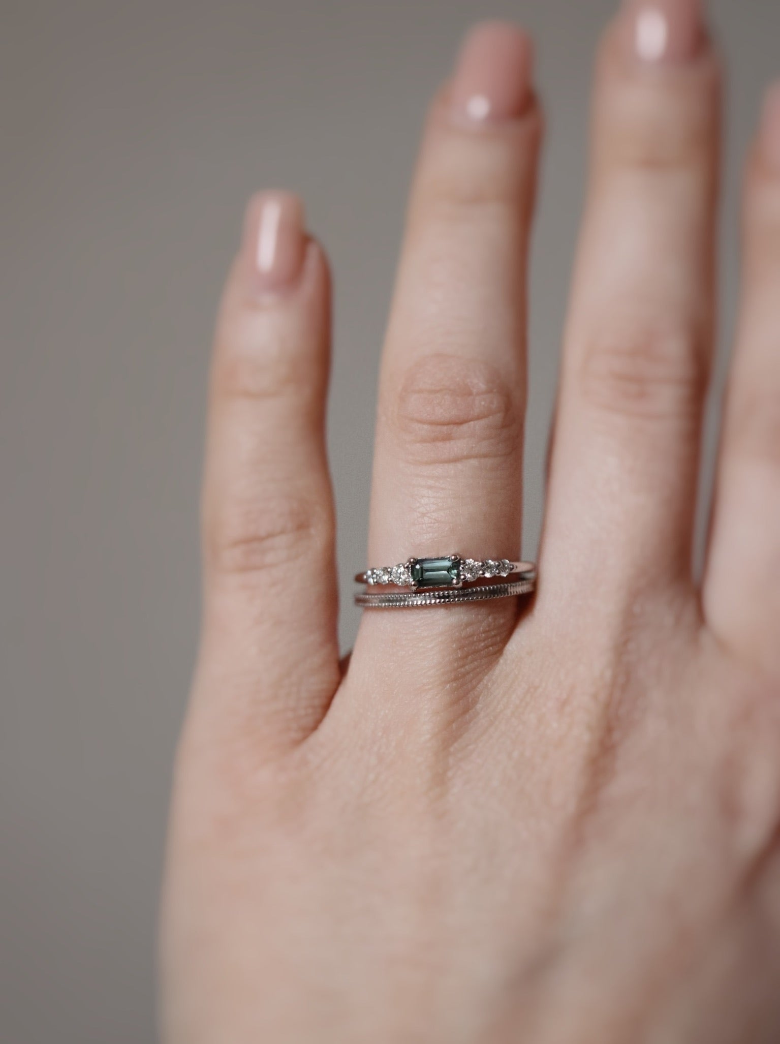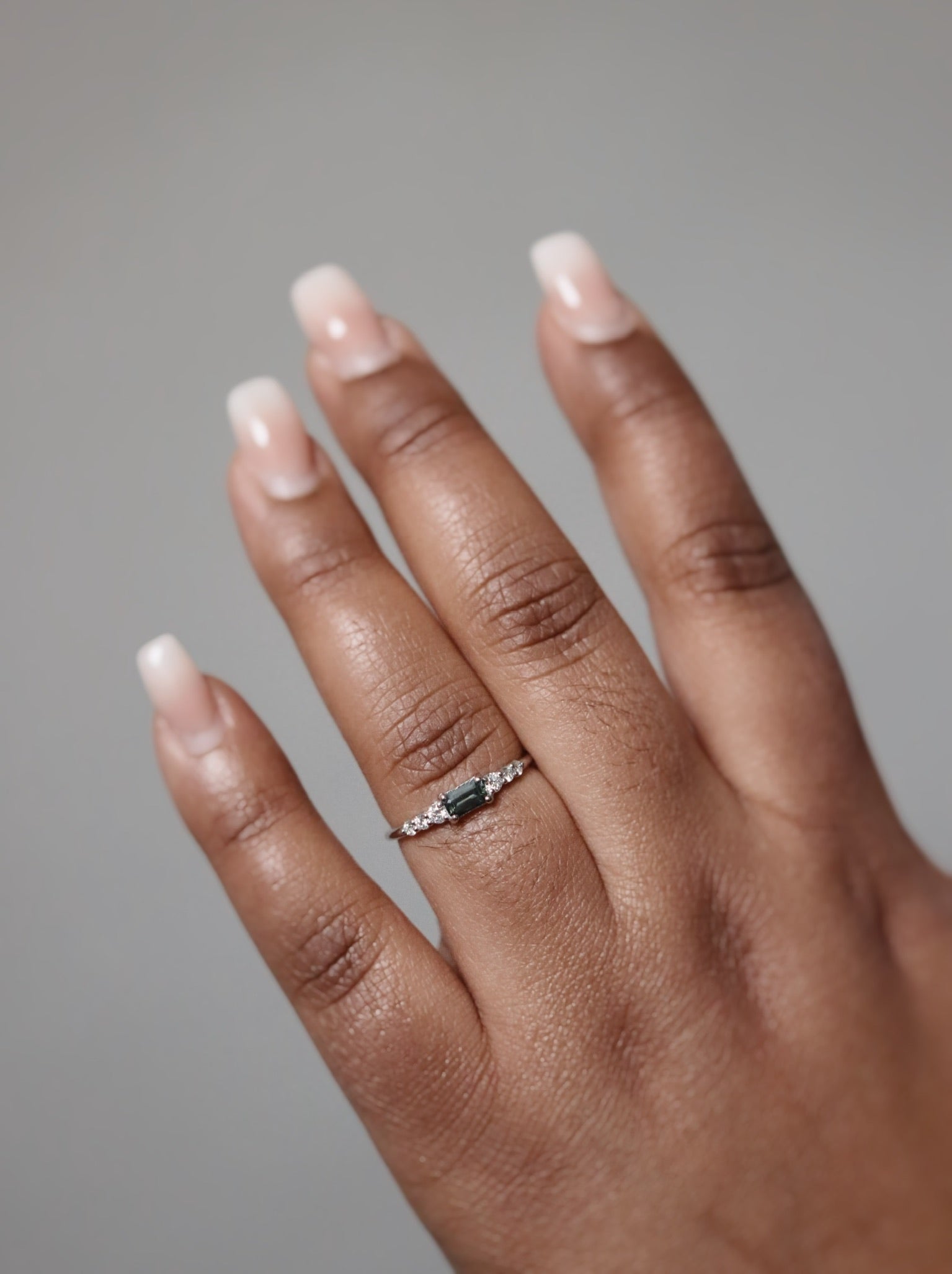 One-Of-A-Kind Midi Baguette Cluster Ring with a Teal Sapphire and Diamonds in White Gold