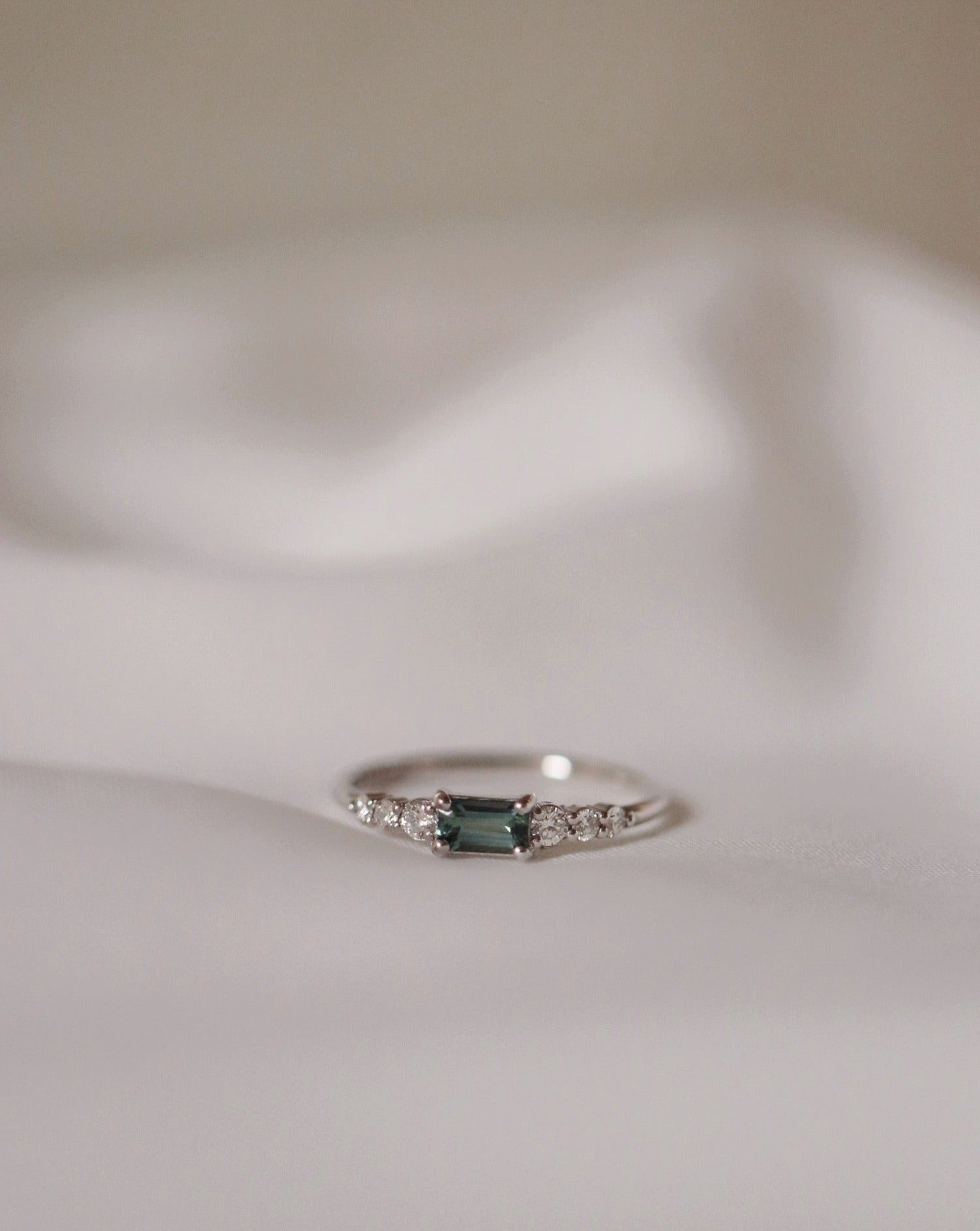 A natural teal sapphire set in white gold and combined with white diamonds.