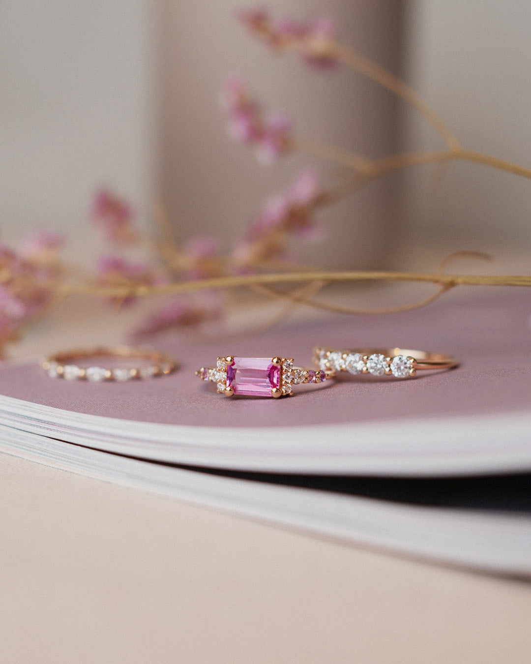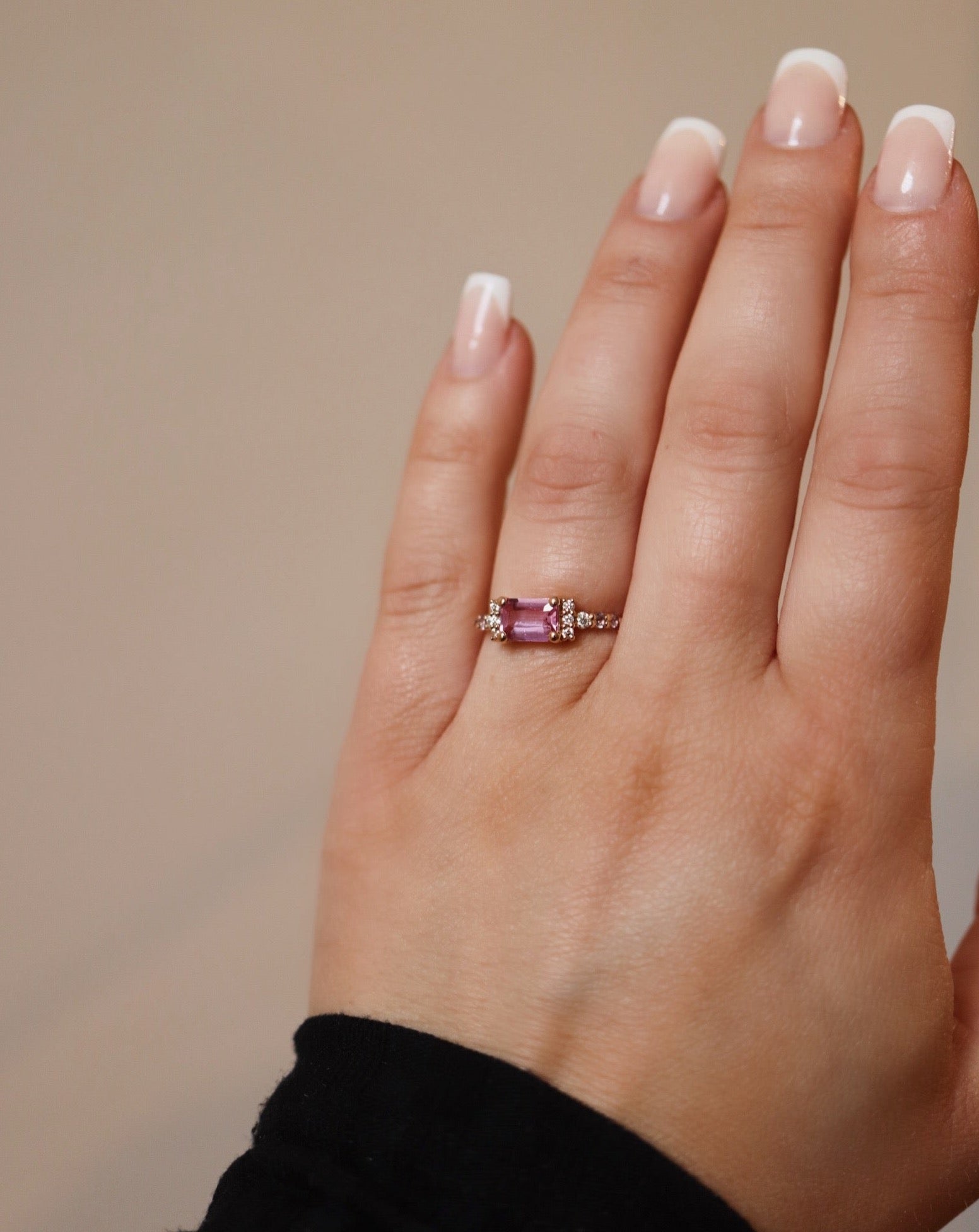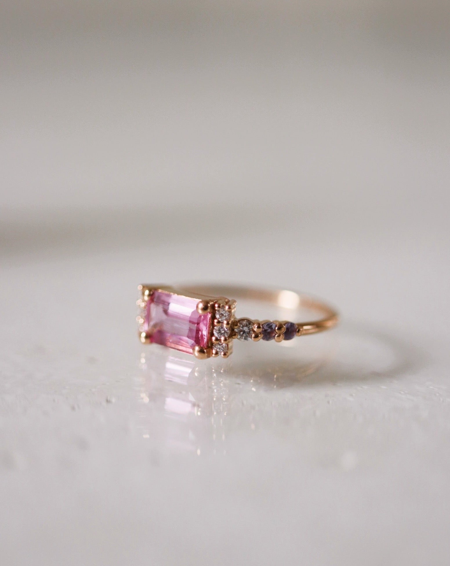 It comes with an emerald-cut hot pink sapphire together with diamonds and lavender sapphires in an exquisite cluster design.