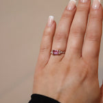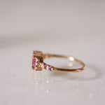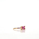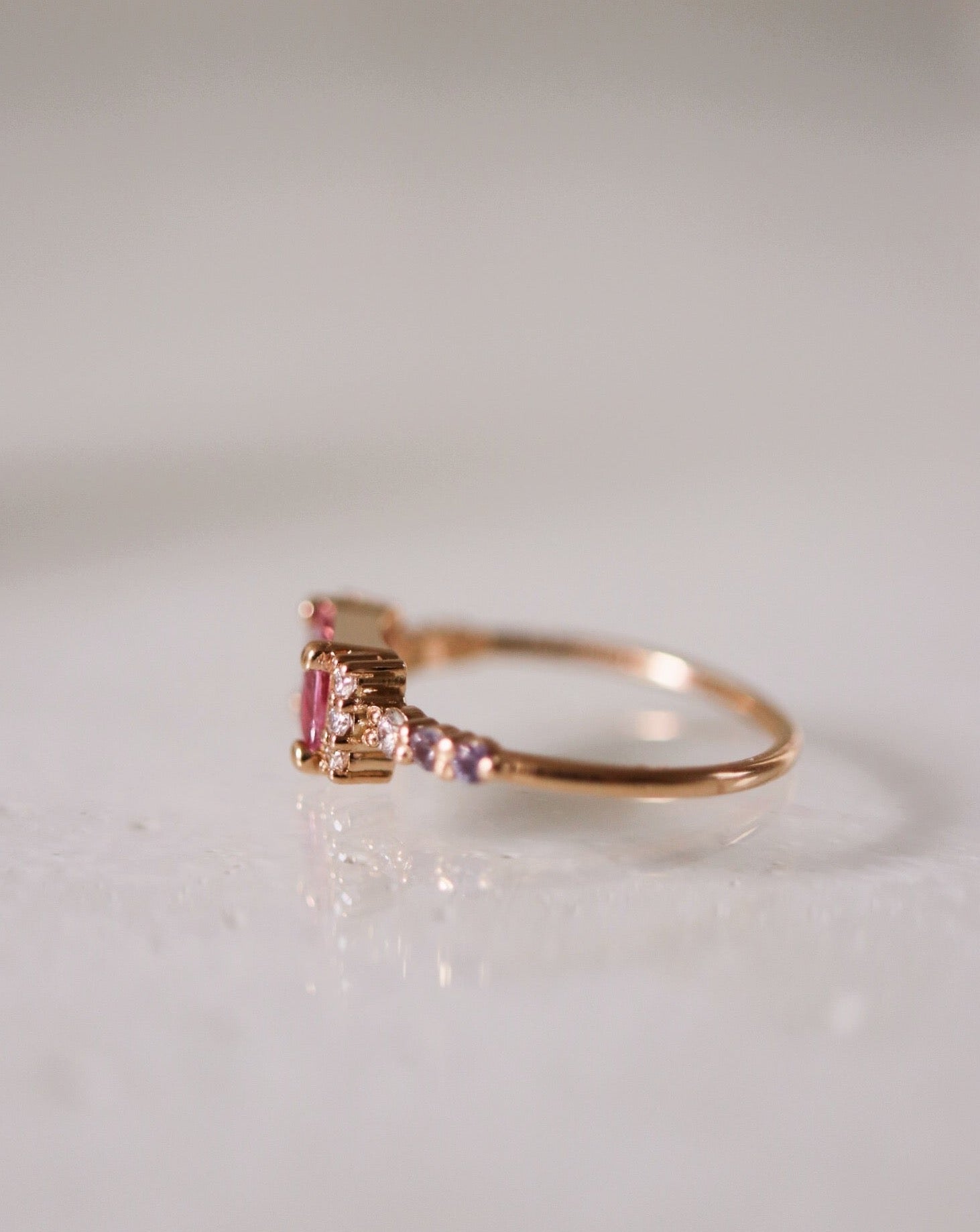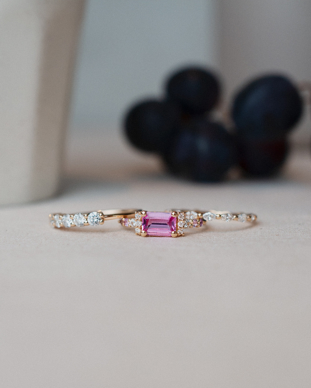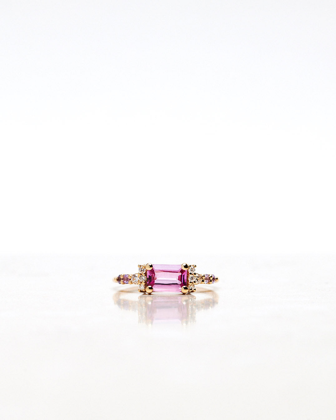 It comes with an emerald-cut hot pink sapphire together with diamonds and lavender sapphires in an exquisite cluster design.