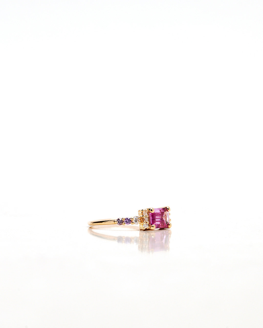 One-of-a-Kind Cluster Ring with an Emerald-Cut Hot Pink Sapphire, Diamonds TWVS and Lavender Sapphires