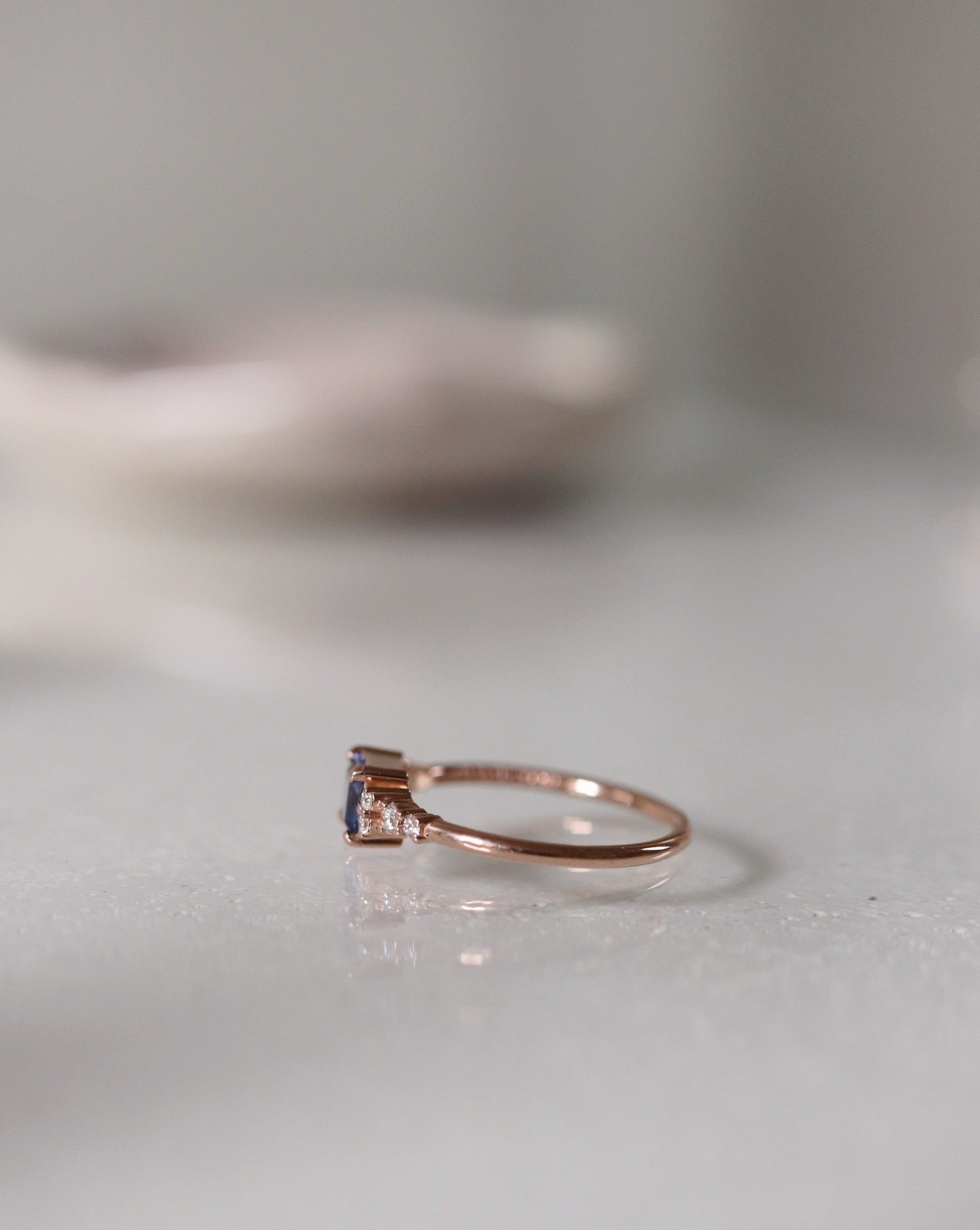 This lovely 0.59 CT sapphire has a luxurious emerald cut and a stunning blue tone with violet hints. In the ring we have enchanted the color of the sapphire by surrounding it with crispy white diamonds and pairing the gemstones with 18K Rose Gold.