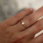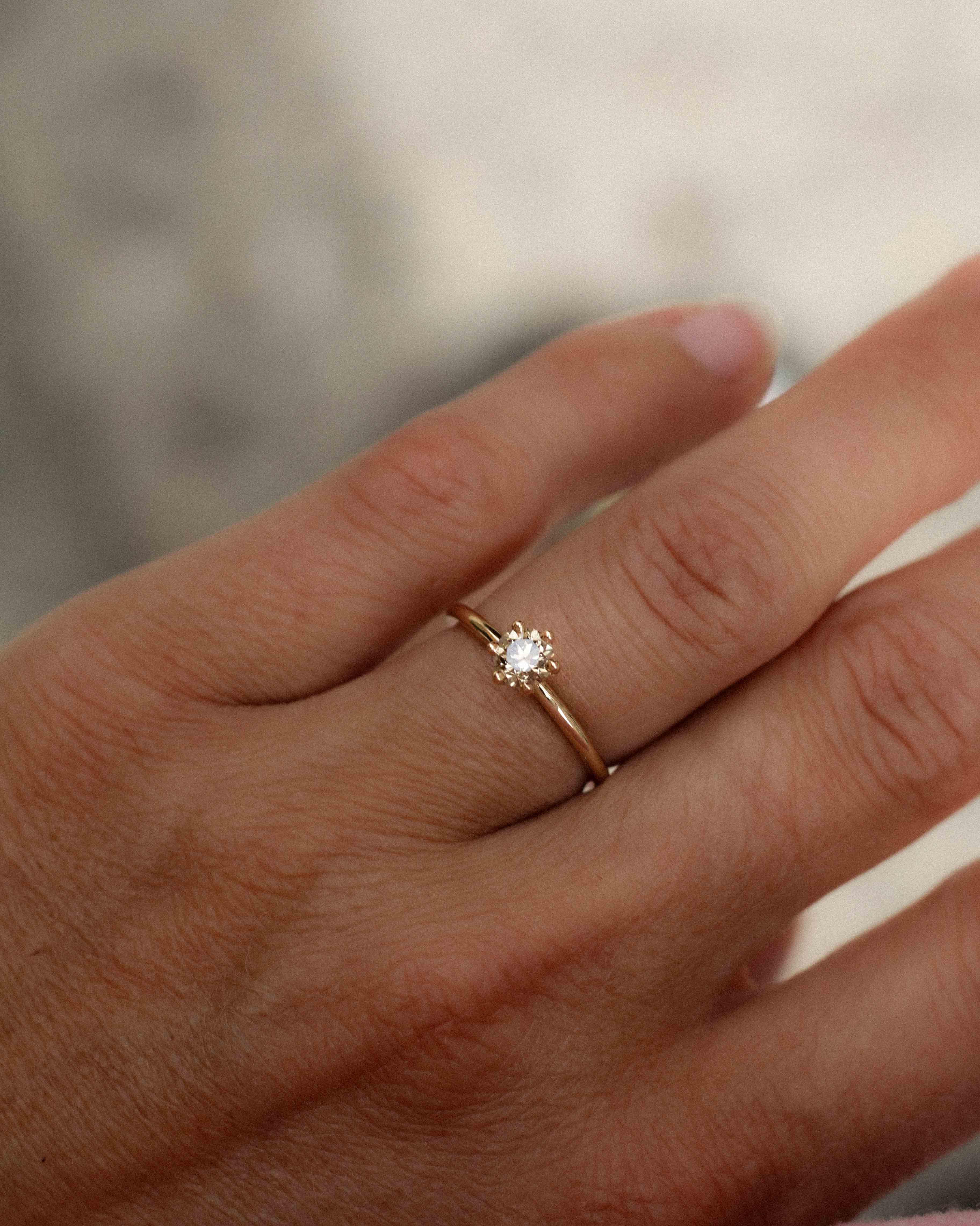 This is a version of our Signature Solitaire Ring with the gemstone set high but with a slightly thinner ringband. A high setting gives the illusion that the gemstone is slightly larger compared to when set in a lower setting closer to the ringband.