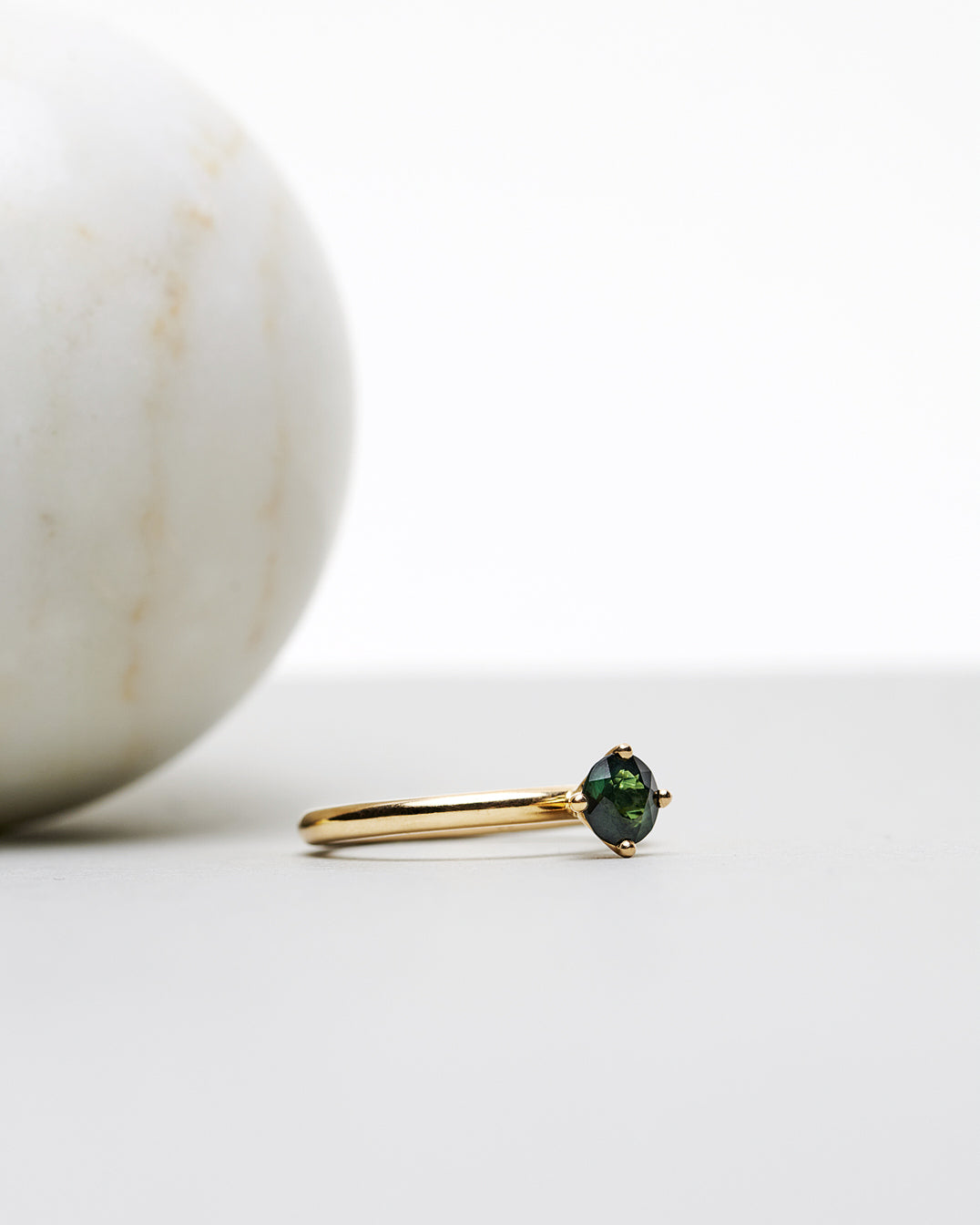 This custom Lucy Ring has a stunning dark green tourmaline that measures 6 mm in diameter. The ring has some scratches in the gold from wear and tear and a tiny scratch in the tourmaline that is not visible from afar. The ring is in great condition.